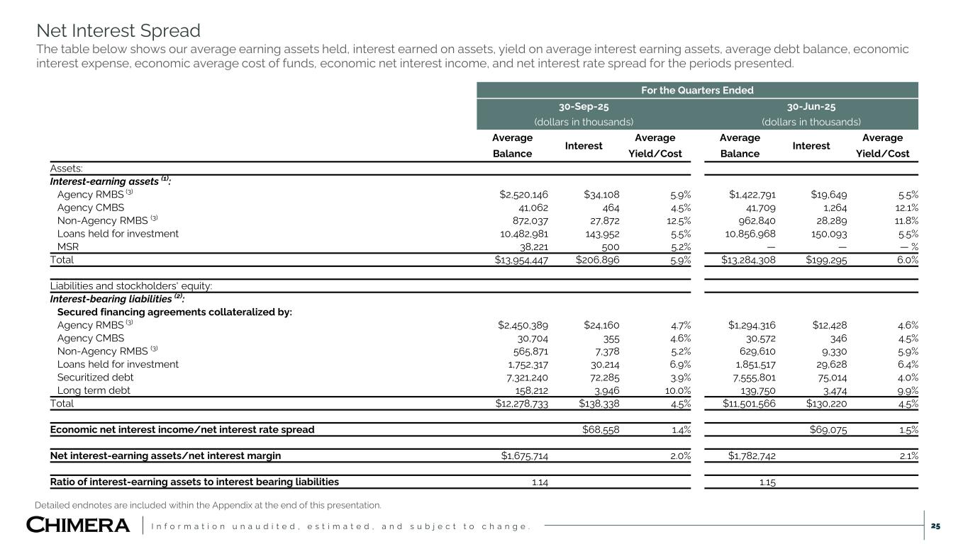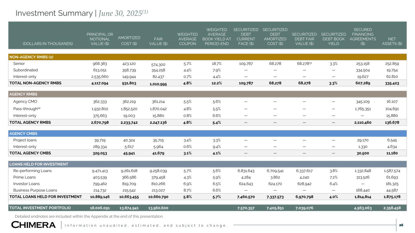 I n f o r m a t i o n u n a u d i t e d , e s t i m a t e d , a n d s u b j e c t t o c h a n g e . 25 Net Interest Spread The table below shows our average earning assets held, interest earned on assets, yield on average interest earning assets, average debt balance, economic interest expense, economic average cost of funds, economic net interest income, and net interest rate spread for the periods presented. Detailed endnotes are included within the Appendix at the end of this presentation. For the Quarters Ended 30-Sep-25 30-Jun-25 (dollars in thousands) (dollars in thousands) Average Interest Average Average Interest Average Balance Yield/Cost Balance Yield/Cost Assets: Interest-earning assets (1): Agency RMBS (3) $2,520,146 $34,108 5.9% $1,422,791 $19,649 5.5% Agency CMBS 41,062 464 4.5% 41,709 1,264 12.1% Non-Agency RMBS (3) 872,037 27,872 12.5% 962,840 28,289 11.8% Loans held for investment 10,482,981 143,952 5.5% 10,856,968 150,093 5.5% MSR 38,221 500 5.2% — — — % Total $13,954,447 $206,896 5.9% $13,284,308 $199,295 6.0% Liabilities and stockholders' equity: Interest-bearing liabilities (2): Secured financing agreements collateralized by: Agency RMBS (3) $2,450,389 $24,160 4.7% $1,294,316 $12,428 4.6% Agency CMBS 30,704 355 4.6% 30,572 346 4.5% Non-Agency RMBS (3) 565,871 7,378 5.2% 629,610 9,330 5.9% Loans held for investment 1,752,317 30,214 6.9% 1,851,517 29,628 6.4% Securitized debt 7,321,240 72,285 3.9% 7,555,801 75,014 4.0% Long term debt 158,212 3,946 10.0% 139,750 3,474 9.9% Total $12,278,733 $138,338 4.5% $11,501,566 $130,220 4.5% Economic net interest income/net interest rate spread $68,558 1.4% $69,075 1.5% Net interest-earning assets/net interest margin $1,675,714 2.0% $1,782,742 2.1% Ratio of interest-earning assets to interest bearing liabilities 1.14 1.15