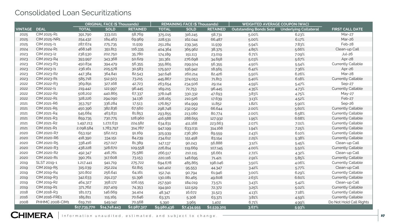 I n f o r m a t i o n u n a u d i t e d , e s t i m a t e d , a n d s u b j e c t t o c h a n g e . Consolidated Loan Securitizations 27 ORIGINAL FACE ($ Thousands) REMAINING FACE ($ Thousands) WEIGHTED AVERAGE COUPON (WAC) VINTAGE DEAL TOTAL SOLD RETAINED TOTAL SOLD RETAINED Outstanding Bonds Sold Underlying Collateral FIRST CALL DATE 2025 CIM 2025-R1 391,790 333,021 58,769 375,015 316,245 58,731 5.00% 6.23% Mar-27 2025 CIM 2025-NR1 254,432 184,463 69,969 228,531 162,044 66,487 5.00% 6.17% Mar-26 2025 CIM 2025-I1 287,674 275,735 11,939 251,284 239,345 11,939 5.94% 7.83% Feb-28 2024 CIM 2024-R1 468,148 351,813 116,335 404,364 365,962 38,375 4.85% 5.66% Clean-up Call 2023 CIM 2023-I2 238,530 202,750 35,780 174,189 151,113 23,019 6.71% 7.09% Jul-26 2023 CIM 2023-R4 393,997 343,368 50,629 311,361 276,698 34,658 5.03% 5.67% Apr-28 2023 CIM 2023-R3 450,834 394,479 56,355 355,865 299,504 56,355 4.50% 5.54% Currently Callable 2023 CIM 2023-I1 236,161 205,578 30,583 175,507 156,942 18,565 6.42% 7.36% Apr-26 2023 CIM 2023-R2 447,384 364,841 82,543 342,648 260,214 82,426 5.50% 6.26% Mar-28 2023 CIM 2023-R1 585,718 512,503 73,215 445,867 374,053 71,813 5.40% 6.18% Currently Callable 2022 CIM 2022-R3 369,891 327,168 42,723 263,654 234,506 29,114 4.59% 5.47% Sep-27 2022 CIM 2022-I1 219,442 122,997 96,445 169,215 72,753 96,445 4.35% 4.73% Currently Callable 2022 CIM 2022-R2 508,202 440,865 67,337 378,048 330,332 47,693 3.83% 4.75% May-27 2022 CIM 2022-R1 328,226 294,090 34,136 228,165 210,526 17,639 3.13% 4.52% Feb-27 2021 CIM 2021-R6 353,797 336,284 17,513 176,857 164,999 11,852 1.82% 5.90% Sep-26 2021 CIM 2021-R5 450,396 382,836 67,560 298,748 232,052 66,644 2.00% 5.60% Currently Callable 2021 CIM 2021-R4 545,684 463,831 81,853 293,855 213,080 80,774 2.00% 6.58% Currently Callable 2021 CIM 2021-R3 859,735 730,775 128,960 416,588 288,655 127,932 1.95% 6.68% Currently Callable 2021 CIM 2021-R2 1,497,213 1,272,631 224,582 634,831 411,168 223,663 2.07% 7.01% Currently Callable 2021 CIM 2021-R1 2,098,584 1,783,797 314,787 947,199 633,031 314,168 1.94% 7.25% Currently Callable 2020 CIM 2020-R7 653,192 562,023 91,169 325,939 236,380 89,559 2.43% 6.10% Currently Callable 2020 CIM 2020-R6 418,390 334,151 84,239 234,612 151,458 83,154 2.25% 5.38% Currently Callable 2020 CIM 2020-R5 338,416 257,027 81,389 147,137 90,243 56,888 3.12% 5.45% Clean-up Call 2020 CIM 2020-R3 438,228 328,670 109,558 226,814 119,669 107,145 4.00% 5.50% Currently Callable 2020 CIM 2020-R2 492,347 416,761 75,586 266,517 210,115 56,661 2.72% 4.32% Clean-up Call 2020 CIM 2020-R1 390,761 317,608 73,153 220,116 148,695 71,421 2.91% 5.85% Currently Callable 2019 SLST 2019-1 1,217,441 941,719 275,722 694,678 485,865 198,046 3.50% 4.06% Currently Callable 2019 CIM 2019-R5 315,039 252,224 62,815 140,402 95,553 44,347 3.42% 5.77% Clean-up Call 2019 CIM 2019-R4 320,802 256,641 64,161 152,741 90,794 61,946 3.00% 6.29% Currently Callable 2019 CIM 2019-R3 342,633 291,237 51,396 130,081 80,465 49,608 2.63% 6.60% Currently Callable 2019 CIM 2019-R2 464,327 358,172 106,155 257,590 184,019 73,571 3.43% 5.42% Clean-up Call 2019 CIM 2019-R1 371,762 297,409 74,353 194,910 122,529 72,372 3.25% 5.02% Currently Callable 2018 CIM 2018-R3 181,073 146,669 34,404 48,347 16,672 31,523 4.13% 7.18% Currently Callable 2016 CIM 2016-FRE1 185,811 115,165 70,646 63,371 5,308 63,371 3.81% 4.59% Currently Callable 2008 PHHMC 2008-CIM1 619,710 549,142 70,568 5,390 3,965 1,402 6.71% 4.99% Do Not Hold Call Rights $17,735,770 $14,748,443 $2,987,327 $9,980,436 $7,434,955 $2,539,305 3.67% 5.93%