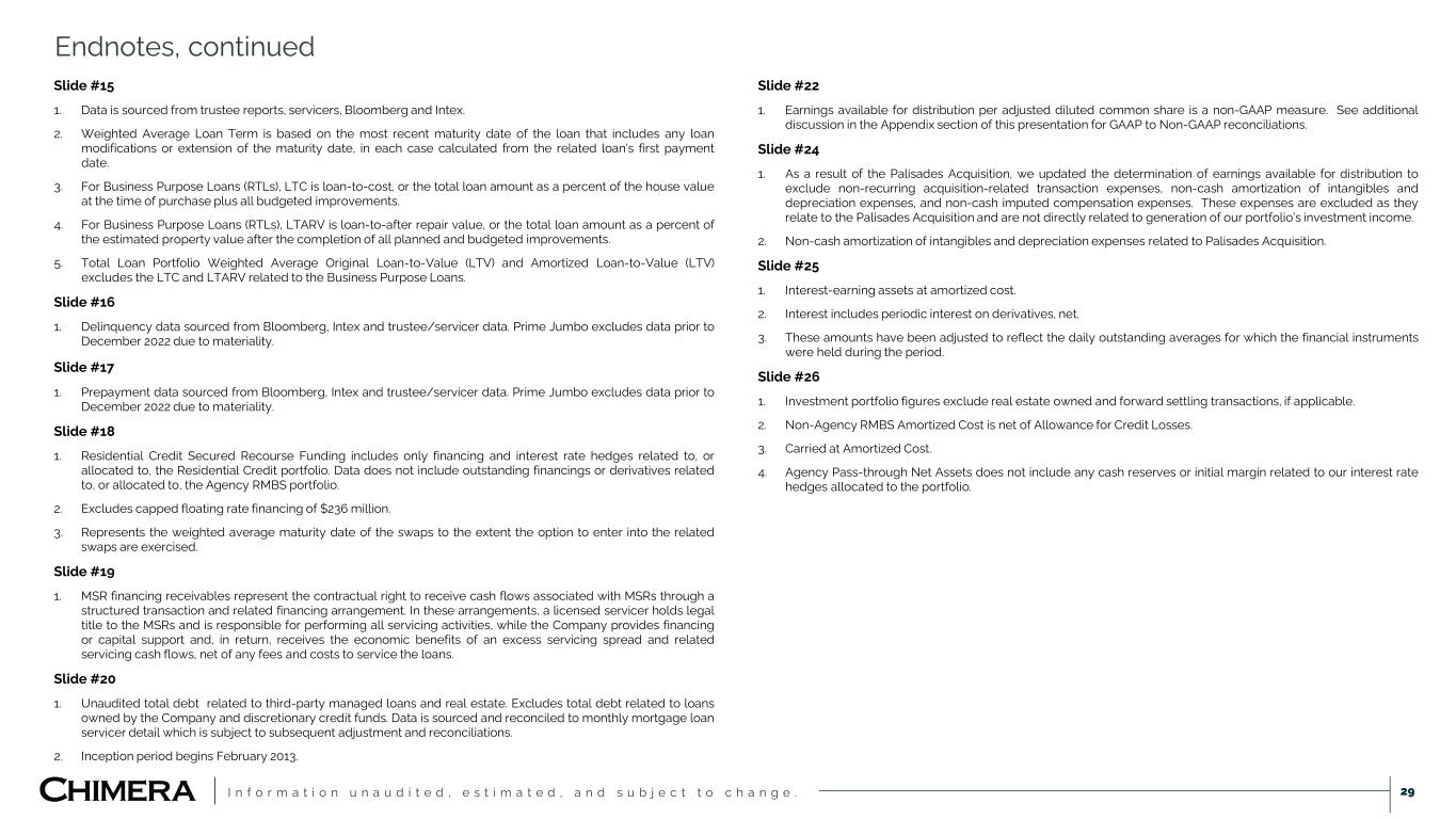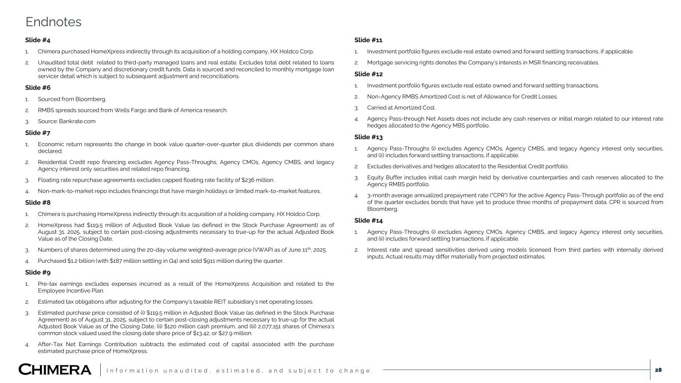 I n f o r m a t i o n u n a u d i t e d , e s t i m a t e d , a n d s u b j e c t t o c h a n g e . Slide #4 1. Chimera purchased HomeXpress indirectly through its acquisition of a holding company, HX Holdco Corp. 2. Unaudited total debt related to third-party managed loans and real estate. Excludes total debt related to loans owned by the Company and discretionary credit funds. Data is sourced and reconciled to monthly mortgage loan servicer detail which is subject to subsequent adjustment and reconciliations. Slide #6 1. Sourced from Bloomberg. 2. RMBS spreads sourced from Wells Fargo and Bank of America research. 3. Source: Bankrate.com Slide #7 1. Economic return represents the change in book value quarter-over-quarter plus dividends per common share declared. 2. Residential Credit repo financing excludes Agency Pass-Throughs, Agency CMOs, Agency CMBS, and legacy Agency interest only securities and related repo financing. 3. Floating rate repurchase agreements excludes capped floating rate facility of $236 million. 4. Non-mark-to-market repo includes financings that have margin holidays or limited mark-to-market features. Slide #8 1. Chimera is purchasing HomeXpress indirectly through its acquisition of a holding company, HX Holdco Corp. 2. HomeXpress had $119.5 million of Adjusted Book Value (as defined in the Stock Purchase Agreement) as of August 31, 2025, subject to certain post-closing adjustments necessary to true-up for the actual Adjusted Book Value as of the Closing Date. 3. Numbers of shares determined using the 20-day volume weighted-average price (VWAP) as of June 11th, 2025. 4. Purchased $1.2 billion (with $187 million settling in Q4) and sold $911 million during the quarter. Slide #9 1. Pre-tax earnings excludes expenses incurred as a result of the HomeXpress Acquisition and related to the Employee Incentive Plan. 2. Estimated tax obligations after adjusting for the Company’s taxable REIT subsidiary’s net operating losses. 3. Estimated purchase price consisted of (i) $119.5 million in Adjusted Book Value (as defined in the Stock Purchase Agreement) as of August 31, 2025, subject to certain post-closing adjustments necessary to true-up for the actual Adjusted Book Value as of the Closing Date, (ii) $120 million cash premium, and (iii) 2,077,151 shares of Chimera’s common stock valued used the closing date share price of $13.42, or $27.9 million. 4. After-Tax Net Earnings Contribution subtracts the estimated cost of capital associated with the purchase estimated purchase price of HomeXpress. Slide #11 1. Investment portfolio figures exclude real estate owned and forward settling transactions, if applicable. 2. Mortgage servicing rights denotes the Company’s interests in MSR financing receivables. Slide #12 1. Investment portfolio figures exclude real estate owned and forward settling transactions. 2. Non-Agency RMBS Amortized Cost is net of Allowance for Credit Losses. 3. Carried at Amortized Cost. 4. Agency Pass-through Net Assets does not include any cash reserves or initial margin related to our interest rate hedges allocated to the Agency MBS portfolio. Slide #13 1. Agency Pass-Throughs (i) excludes Agency CMOs, Agency CMBS, and legacy Agency interest only securities, and (ii) includes forward settling transactions, if applicable. 2. Excludes derivatives and hedges allocated to the Residential Credit portfolio. 3. Equity Buffer includes initial cash margin held by derivative counterparties and cash reserves allocated to the Agency RMBS portfolio. 4. 3-month average annualized prepayment rate (“CPR”) for the active Agency Pass-Through portfolio as of the end of the quarter excludes bonds that have yet to produce three months of prepayment data. CPR is sourced from Bloomberg. Slide #14 1. Agency Pass-Throughs (i) excludes Agency CMOs, Agency CMBS, and legacy Agency interest only securities, and (ii) includes forward settling transactions, if applicable. 2. Interest rate and spread sensitivities derived using models licensed from third parties with internally derived inputs. Actual results may differ materially from projected estimates. Endnotes 28