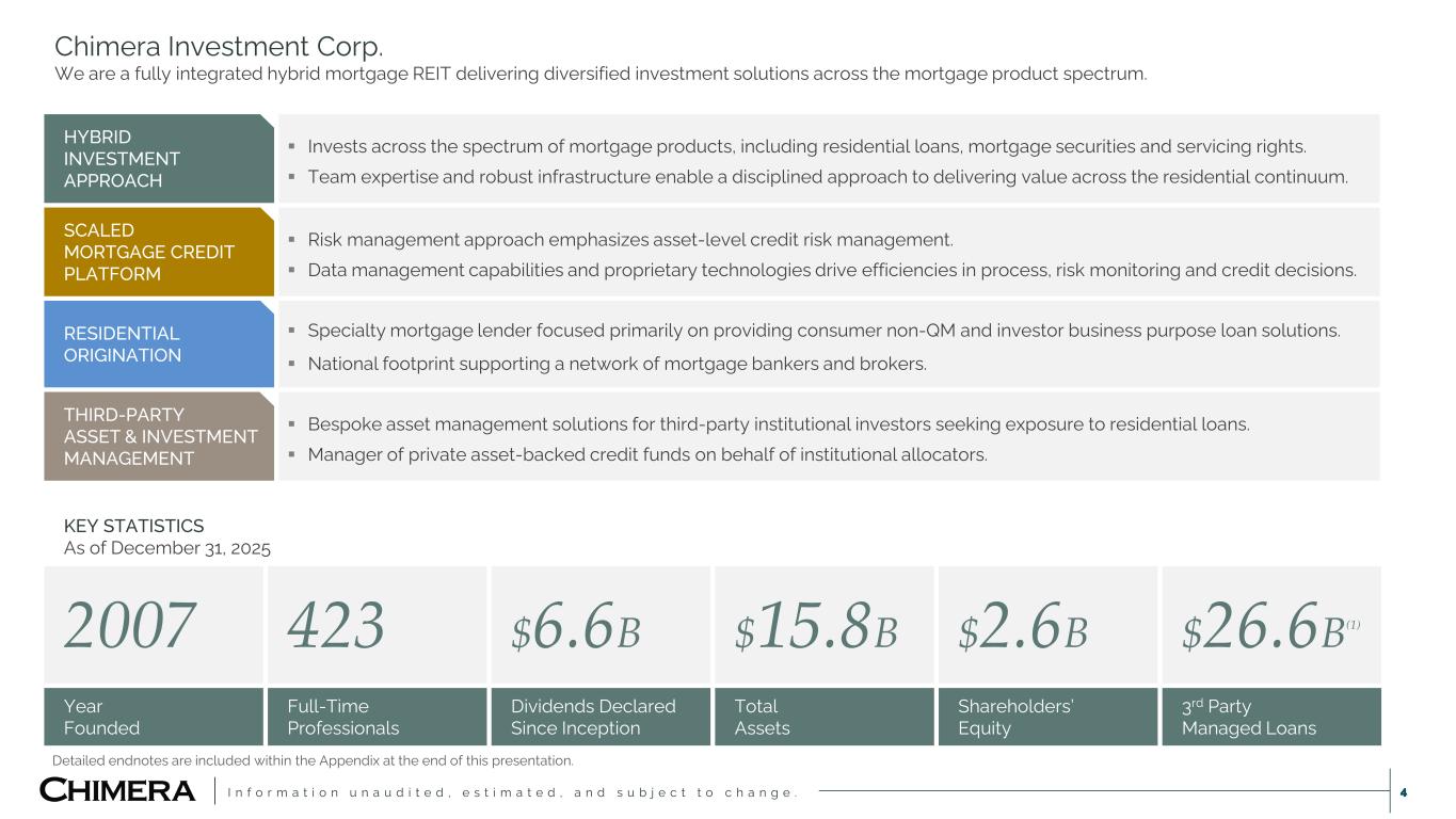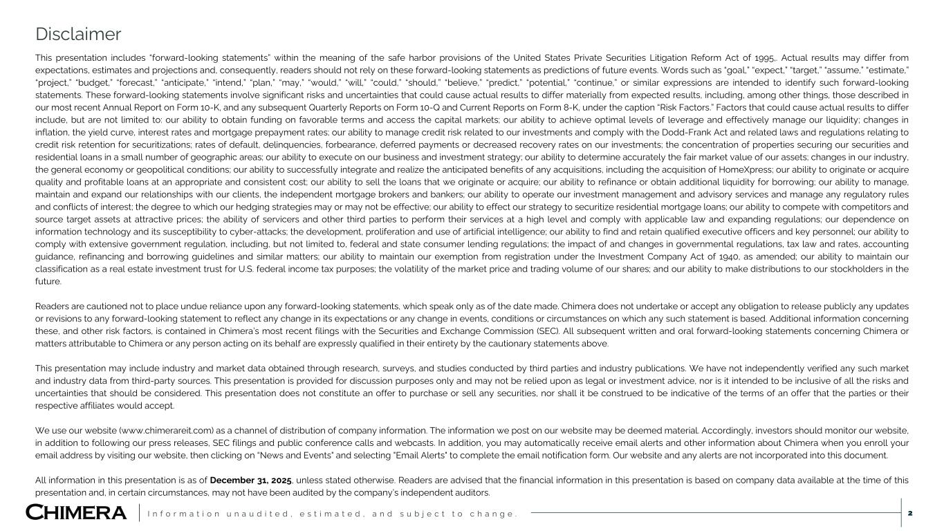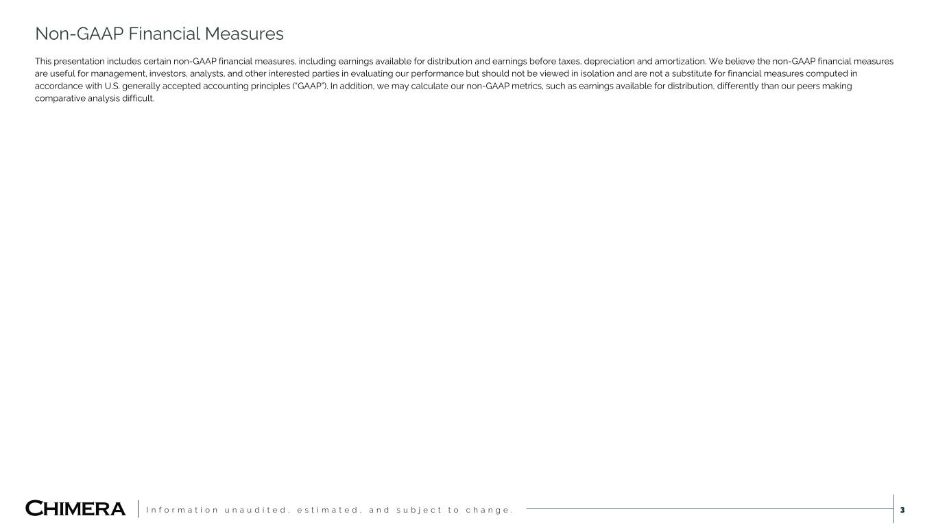 I n f o r m a t i o n u n a u d i t e d , e s t i m a t e d , a n d s u b j e c t t o c h a n g e . Disclaimer 2 This presentation includes “forward-looking statements” within the meaning of the safe harbor provisions of the United States Private Securities Litigation Reform Act of 1995,. Actual results may differ from expectations, estimates and projections and, consequently, readers should not rely on these forward-looking statements as predictions of future events. Words such as “goal,” “expect,” “target,” “assume,” “estimate,” “project,” “budget,” “forecast,” “anticipate,” “intend,” “plan,” “may,” “would,” “will,” “could,” “should,” “believe,” “predict,” “potential,” “continue,” or similar expressions are intended to identify such forward-looking statements. These forward-looking statements involve significant risks and uncertainties that could cause actual results to differ materially from expected results, including, among other things, those described in our most recent Annual Report on Form 10-K, and any subsequent Quarterly Reports on Form 10-Q and Current Reports on Form 8-K, under the caption “Risk Factors.” Factors that could cause actual results to differ include, but are not limited to: our ability to obtain funding on favorable terms and access the capital markets; our ability to achieve optimal levels of leverage and effectively manage our liquidity; changes in inflation, the yield curve, interest rates and mortgage prepayment rates; our ability to manage credit risk related to our investments and comply with the Dodd-Frank Act and related laws and regulations relating to credit risk retention for securitizations; rates of default, delinquencies, forbearance, deferred payments or decreased recovery rates on our investments; the concentration of properties securing our securities and residential loans in a small number of geographic areas; our ability to execute on our business and investment strategy; our ability to determine accurately the fair market value of our assets; changes in our industry, the general economy or geopolitical conditions; our ability to successfully integrate and realize the anticipated benefits of any acquisitions, including the acquisition of HomeXpress; our ability to originate or acquire quality and profitable loans at an appropriate and consistent cost; our ability to sell the loans that we originate or acquire; our ability to refinance or obtain additional liquidity for borrowing; our ability to manage, maintain and expand our relationships with our clients, the independent mortgage brokers and bankers; our ability to operate our investment management and advisory services and manage any regulatory rules and conflicts of interest; the degree to which our hedging strategies may or may not be effective; our ability to effect our strategy to securitize residential mortgage loans; our ability to compete with competitors and source target assets at attractive prices; the ability of servicers and other third parties to perform their services at a high level and comply with applicable law and expanding regulations; our dependence on information technology and its susceptibility to cyber-attacks; the development, proliferation and use of artificial intelligence; our ability to find and retain qualified executive officers and key personnel; our ability to comply with extensive government regulation, including, but not limited to, federal and state consumer lending regulations; the impact of and changes in governmental regulations, tax law and rates, accounting guidance, refinancing and borrowing guidelines and similar matters; our ability to maintain our exemption from registration under the Investment Company Act of 1940, as amended; our ability to maintain our classification as a real estate investment trust for U.S. federal income tax purposes; the volatility of the market price and trading volume of our shares; and our ability to make distributions to our stockholders in the future. Readers are cautioned not to place undue reliance upon any forward-looking statements, which speak only as of the date made. Chimera does not undertake or accept any obligation to release publicly any updates or revisions to any forward-looking statement to reflect any change in its expectations or any change in events, conditions or circumstances on which any such statement is based. Additional information concerning these, and other risk factors, is contained in Chimera’s most recent filings with the Securities and Exchange Commission (SEC). All subsequent written and oral forward-looking statements concerning Chimera or matters attributable to Chimera or any person acting on its behalf are expressly qualified in their entirety by the cautionary statements above. This presentation may include industry and market data obtained through research, surveys, and studies conducted by third parties and industry publications. We have not independently verified any such market and industry data from third-party sources. This presentation is provided for discussion purposes only and may not be relied upon as legal or investment advice, nor is it intended to be inclusive of all the risks and uncertainties that should be considered. This presentation does not constitute an offer to purchase or sell any securities, nor shall it be construed to be indicative of the terms of an offer that the parties or their respective affiliates would accept. We use our website (www.chimerareit.com) as a channel of distribution of company information. The information we post on our website may be deemed material. Accordingly, investors should monitor our website, in addition to following our press releases, SEC filings and public conference calls and webcasts. In addition, you may automatically receive email alerts and other information about Chimera when you enroll your email address by visiting our website, 