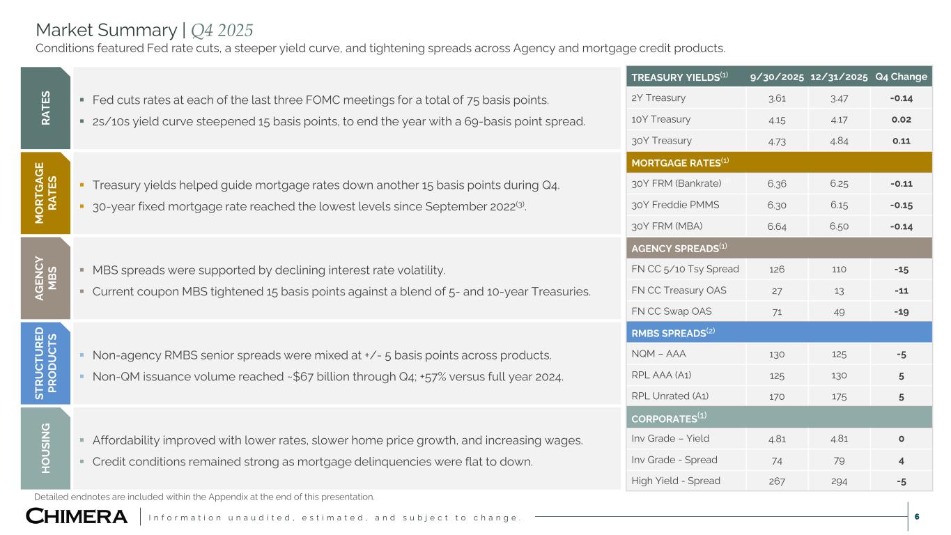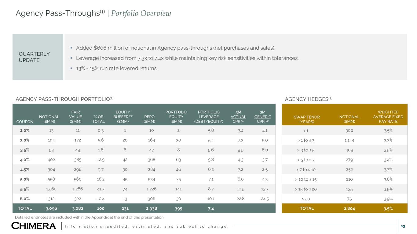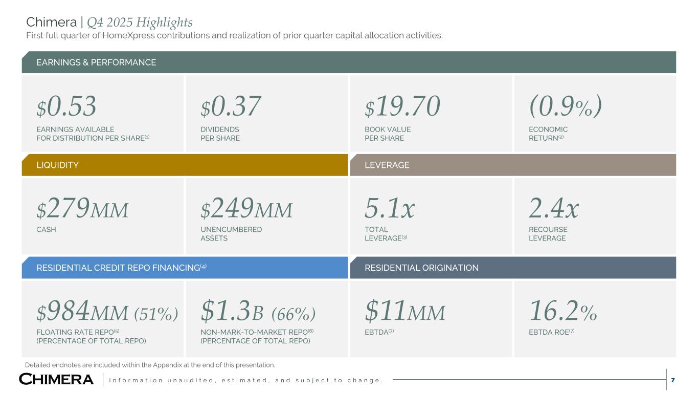 I n f o r m a t i o n u n a u d i t e d , e s t i m a t e d , a n d s u b j e c t t o c h a n g e . Disclaimer 2 This presentation includes “forward-looking statements” within the meaning of the safe harbor provisions of the United States Private Securities Litigation Reform Act of 1995,. Actual results may differ from expectations, estimates and projections and, consequently, readers should not rely on these forward-looking statements as predictions of future events. Words such as “goal,” “expect,” “target,” “assume,” “estimate,” “project,” “budget,” “forecast,” “anticipate,” “intend,” “plan,” “may,” “would,” “will,” “could,” “should,” “believe,” “predict,” “potential,” “continue,” or similar expressions are intended to identify such forward-looking statements. These forward-looking statements involve significant risks and uncertainties that could cause actual results to differ materially from expected results, including, among other things, those described in our most recent Annual Report on Form 10-K, and any subsequent Quarterly Reports on Form 10-Q and Current Reports on Form 8-K, under the caption “Risk Factors.” Factors that could cause actual results to differ include, but are not limited to: our ability to obtain funding on favorable terms and access the capital markets; our ability to achieve optimal levels of leverage and effectively manage our liquidity; changes in inflation, the yield curve, interest rates and mortgage prepayment rates; our ability to manage credit risk related to our investments and comply with the Dodd-Frank Act and related laws and regulations relating to credit risk retention for securitizations; rates of default, delinquencies, forbearance, deferred payments or decreased recovery rates on our investments; the concentration of properties securing our securities and residential loans in a small number of geographic areas; our ability to execute on our business and investment strategy; our ability to determine accurately the fair market value of our assets; changes in our industry, the general economy or geopolitical conditions; our ability to successfully integrate and realize the anticipated benefits of any acquisitions, including the acquisition of HomeXpress; our ability to originate or acquire quality and profitable loans at an appropriate and consistent cost; our ability to sell the loans that we originate or acquire; our ability to refinance or obtain additional liquidity for borrowing; our ability to manage, maintain and expand our relationships with our clients, the independent mortgage brokers and bankers; our ability to operate our investment management and advisory services and manage any regulatory rules and conflicts of interest; the degree to which our hedging strategies may or may not be effective; our ability to effect our strategy to securitize residential mortgage loans; our ability to compete with competitors and source target assets at attractive prices; the ability of servicers and other third parties to perform their services at a high level and comply with applicable law and expanding regulations; our dependence on information technology and its susceptibility to cyber-attacks; the development, proliferation and use of artificial intelligence; our ability to find and retain qualified executive officers and key personnel; our ability to comply with extensive government regulation, including, but not limited to, federal and state consumer lending regulations; the impact of and changes in governmental regulations, tax law and rates, accounting guidance, refinancing and borrowing guidelines and similar matters; our ability to maintain our exemption from registration under the Investment Company Act of 1940, as amended; our ability to maintain our classification as a real estate investment trust for U.S. federal income tax purposes; the volatility of the market price and trading volume of our shares; and our ability to make distributions to our stockholders in the future. Readers are cautioned not to place undue reliance upon any forward-looking statements, which speak only as of the date made. Chimera does not undertake or accept any obligation to release publicly any updates or revisions to any forward-looking statement to reflect any change in its expectations or any change in events, conditions or circumstances on which any such statement is based. Additional information concerning these, and other risk factors, is contained in Chimera’s most recent filings with the Securities and Exchange Commission (SEC). All subsequent written and oral forward-looking statements concerning Chimera or matters attributable to Chimera or any person acting on its behalf are expressly qualified in their entirety by the cautionary statements above. This presentation may include industry and market data obtained through research, surveys, and studies conducted by third parties and industry publications. We have not independently verified any such market and industry data from third-party sources. This presentation is provided for discussion purposes only and may not be relied upon as legal or investment advice, nor is it intended to be inclusive of all the risks and uncertainties that should be considered. This presentation does not constitute an offer to purchase or sell any securities, nor shall it be construed to be indicative of the terms of an offer that the parties or their respective affiliates would accept. We use our website (www.chimerareit.com) as a channel of distribution of company information. The information we post on our website may be deemed material. Accordingly, investors should monitor our website, in addition to following our press releases, SEC filings and public conference calls and webcasts. In addition, you may automatically receive email alerts and other information about Chimera when you enroll your email address by visiting our website, 