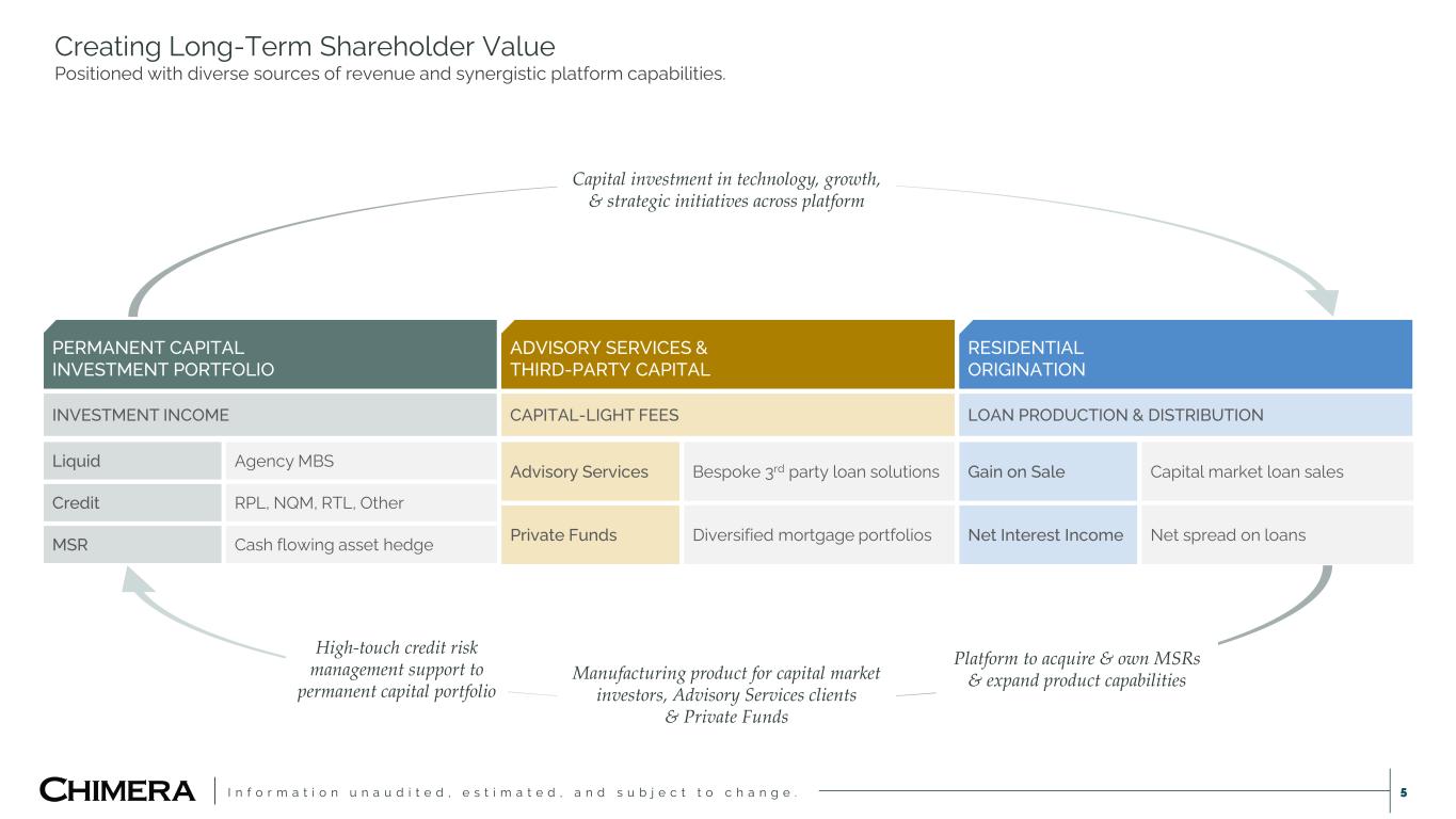 I n f o r m a t i o n u n a u d i t e d , e s t i m a t e d , a n d s u b j e c t t o c h a n g e . 4 HYBRID INVESTMENT APPROACH  Invests across the spectrum of mortgage products, including residential loans, mortgage securities and servicing rights.  Team expertise and robust infrastructure enable a disciplined approach to delivering value across the residential continuum. SCALED MORTGAGE CREDIT PLATFORM  Risk management approach emphasizes asset-level credit risk management.  Data management capabilities and proprietary technologies drive efficiencies in process, risk monitoring and credit decisions. RESIDENTIAL ORIGINATION  Specialty mortgage lender focused primarily on providing consumer non-QM and investor business purpose loan solutions.  National footprint supporting a network of mortgage bankers and brokers. THIRD-PARTY ASSET & INVESTMENT MANAGEMENT  Bespoke asset management solutions for third-party institutional investors seeking exposure to residential loans.  Manager of private asset-backed credit funds on behalf of institutional allocators. KEY STATISTICS As of December 31, 2025 2007 423 $6.6B $15.8B $2.6B $26.6B(1) Year Founded Full-Time Professionals Dividends Declared Since Inception Total Assets Shareholders’ Equity 3rd Party Managed Loans Chimera Investment Corp. We are a fully integrated hybrid mortgage REIT delivering diversified investment solutions across the mortgage product spectrum. Detailed endnotes are included within the Appendix at the end of this presentation.
