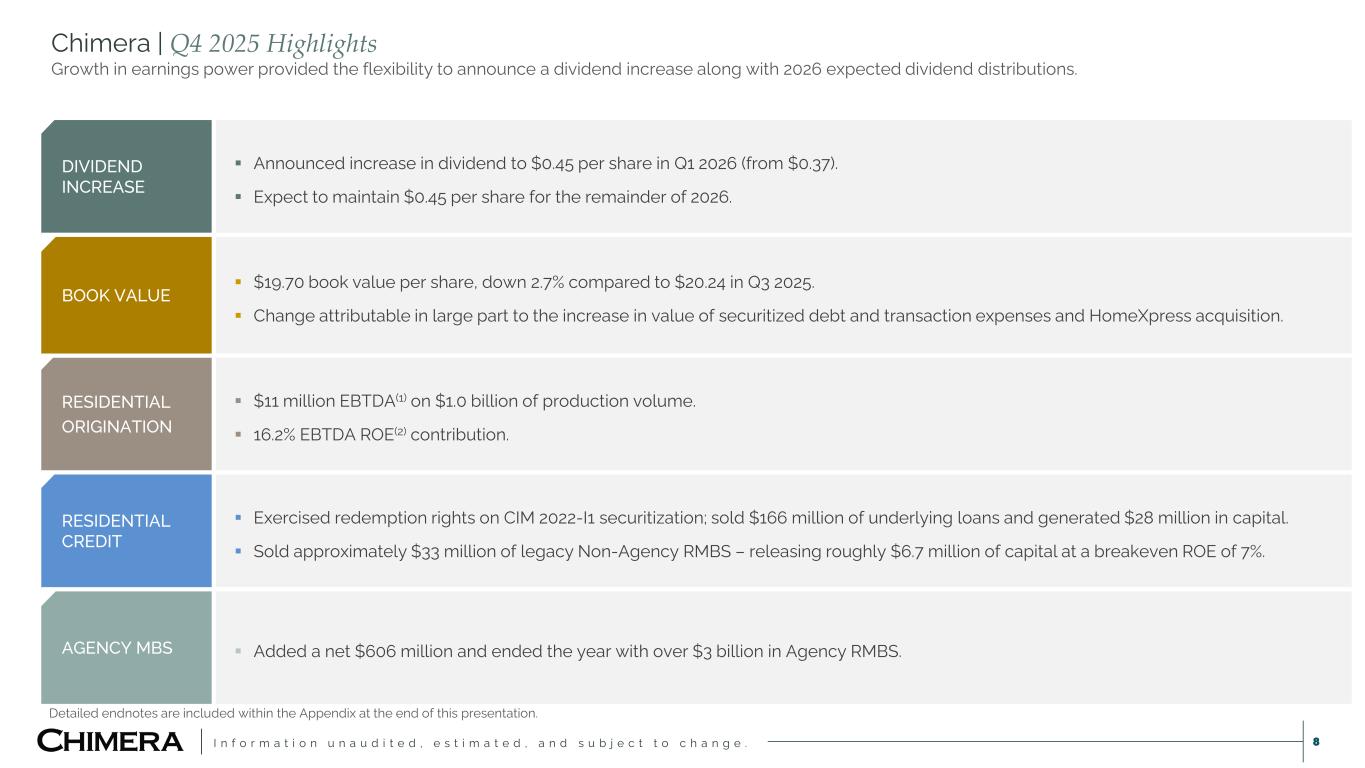 I n f o r m a t i o n u n a u d i t e d , e s t i m a t e d , a n d s u b j e c t t o c h a n g e . 7 EARNINGS & PERFORMANCE $0.53 EARNINGS AVAILABLE FOR DISTRIBUTION PER SHARE(1) $0.37 DIVIDENDS PER SHARE $19.70 BOOK VALUE PER SHARE (0.9%) ECONOMIC RETURN(2) LIQUIDITY LEVERAGE $279MM CASH $249MM UNENCUMBERED ASSETS 5.1x TOTAL LEVERAGE(3) 2.4x RECOURSE LEVERAGE RESIDENTIAL CREDIT REPO FINANCING(4) RESIDENTIAL ORIGINATION $984MM (51%) FLOATING RATE REPO(5) (PERCENTAGE OF TOTAL REPO) $1.3B (66%) NON-MARK-TO-MARKET REPO(6) (PERCENTAGE OF TOTAL REPO) $11MM EBTDA(7) 16.2% EBTDA ROE(7) Chimera | Q4 2025 Highlights First full quarter of HomeXpress contributions and realization of prior quarter capital allocation activities. Detailed endnotes are included within the Appendix at the end of this presentation.