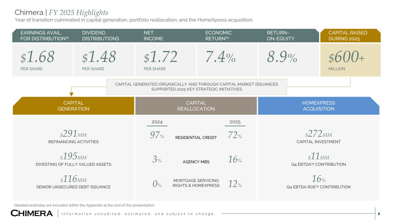 I n f o r m a t i o n u n a u d i t e d , e s t i m a t e d , a n d s u b j e c t t o c h a n g e . 8 Chimera | Q4 2025 Highlights Growth in earnings power provided the flexibility to announce a dividend increase along with 2026 expected dividend distributions. DIVIDEND INCREASE  Announced increase in dividend to $0.45 per share in Q1 2026 (from $0.37).  Expect to maintain $0.45 per share for the remainder of 2026. BOOK VALUE  $19.70 book value per share, down 2.7% compared to $20.24 in Q3 2025.  Change attributable in large part to the increase in value of securitized debt and transaction expenses and HomeXpress acquisition. RESIDENTIAL ORIGINATION  $11 million EBTDA(1) on $1.0 billion of production volume.  16.2% EBTDA ROE(2) contribution. RESIDENTIAL CREDIT  Exercised redemption rights on CIM 2022-I1 securitization; sold $166 million of underlying loans and generated $28 million in capital.  Sold approximately $33 million of legacy Non-Agency RMBS – releasing roughly $6.7 million of capital at a breakeven ROE of 7%. AGENCY MBS  Added a net $606 million and ended the year with over $3 billion in Agency RMBS. Detailed endnotes are included within the Appendix at the end of this presentation.