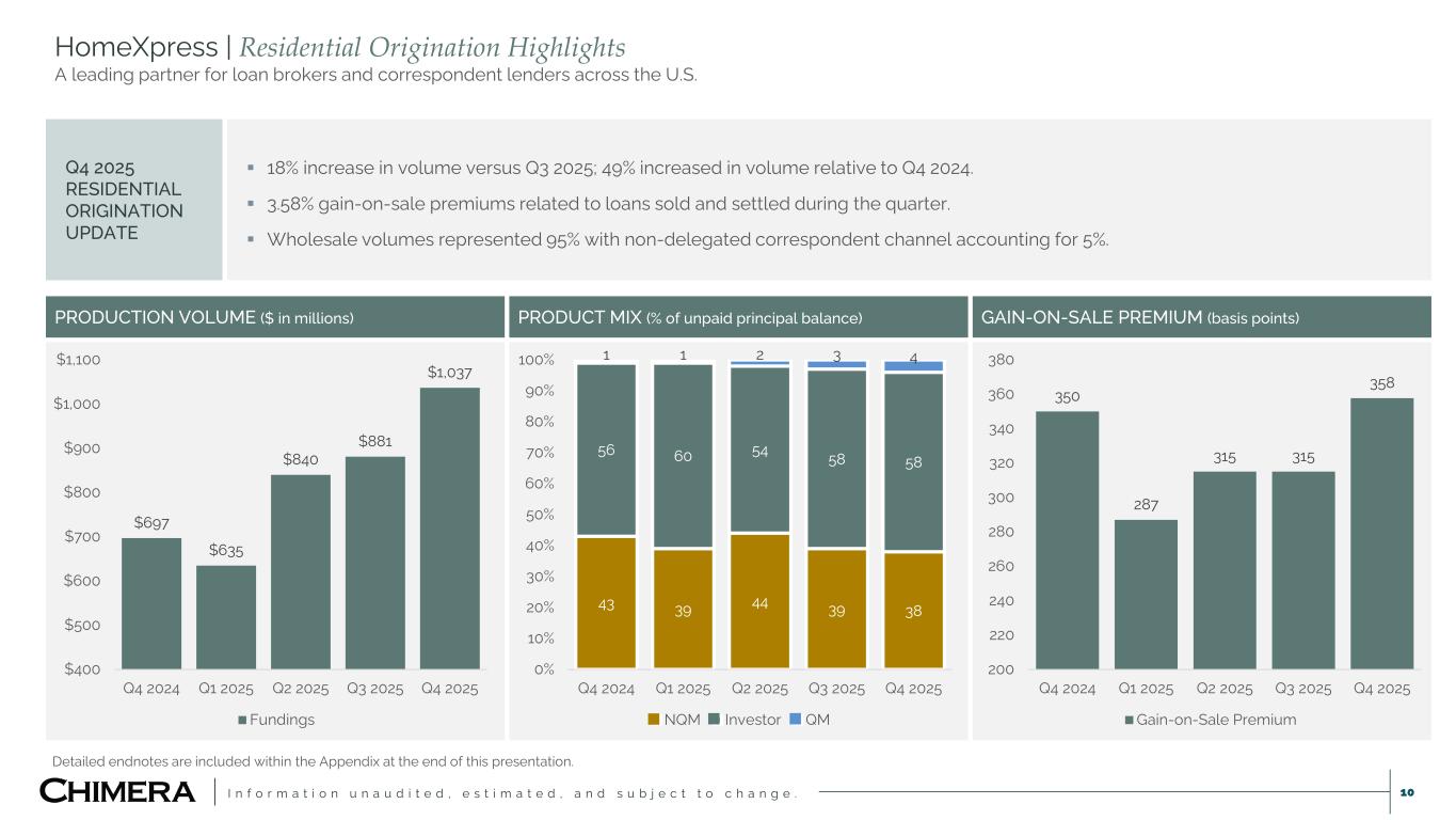 I n f o r m a t i o n u n a u d i t e d , e s t i m a t e d , a n d s u b j e c t t o c h a n g e . 9 Chimera | FY 2025 Highlights Year of transition culminated in capital generation, portfolio reallocation, and the HomeXpress acquisition. Detailed endnotes are included within the Appendix at the end of this presentation. EARNINGS AVAIL. FOR DISTRIBUTION(1) DIVIDEND DISTRIBUTIONS NET INCOME ECONOMIC RETURN(2) RETURN- ON-EQUITY CAPITAL RAISED DURING 2025 $1.68 PER SHARE $1.48 PER SHARE $1.72 PER SHARE 7.4% 8.9% $600+ MILLION CAPITAL GENERATION CAPITAL REALLOCATION HOMEXPRESS ACQUISITION $291MM REFINANCING ACTIVITIES $195MM DIVESTING OF FULLY VALUED ASSETS $116MM SENIOR UNSECURED DEBT ISSUANCE $272MM CAPITAL INVESTMENT $11MM Q4 EBTDA(3) CONTRIBUTION 16% Q4 EBTDA ROE(4) CONTRIBUTION 2024 2025 97% RESIDENTIAL CREDIT 72% 3% AGENCY MBS 16% 0% MORTGAGE SERVICING RIGHTS & HOMEXPRESS 12% CAPITAL GENERATED ORGANICALLY AND THROUGH CAPITAL MARKET ISSUANCES SUPPORTED 2025 KEY STRATEGIC INITIATIVES