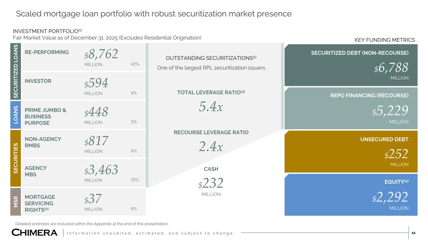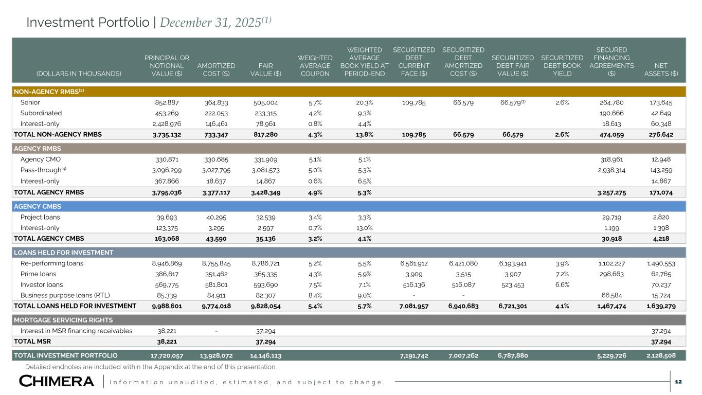 I n f o r m a t i o n u n a u d i t e d , e s t i m a t e d , a n d s u b j e c t t o c h a n g e . 11 Scaled mortgage loan portfolio with robust securitization market presence Detailed endnotes are included within the Appendix at the end of this presentation. SECURITIZED DEBT (NON-RECOURSE) $6,788 MILLION REPO FINANCING (RECOURSE) $5,229 MILLION UNSECURED DEBT $252 MILLION EQUITY(4) $2,292 MILLION KEY FUNDING METRICS INVESTMENT PORTFOLIO(1) Fair Market Value as of December 31, 2025 (Excludes Residential Origination) SE C U RI TI ZE D L O AN S RE-PERFORMING $8,762 MILLION 62% INVESTOR $594 MILLION 4% LO AN S PRIME JUMBO & BUSINESS PURPOSE $448 MILLION 3% SE C U RI TI ES NON-AGENCY RMBS $817 MILLION 6% AGENCY MBS $3,463 MILLION 25% M SR MORTGAGE SERVICING RIGHTS(2) $37 MILLION 0% OUTSTANDING SECURITIZATIONS(1) One of the largest RPL securitization issuers TOTAL LEVERAGE RATIO(3) 5.4x RECOURSE LEVERAGE RATIO 2.4x CASH $232 MILLION