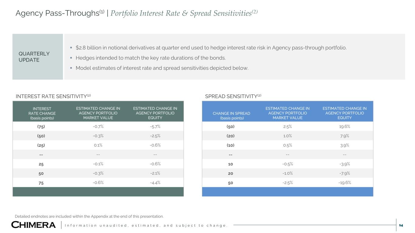 I n f o r m a t i o n u n a u d i t e d , e s t i m a t e d , a n d s u b j e c t t o c h a n g e . 13 Agency Pass-Throughs(1) | Portfolio Overview QUARTERLY UPDATE  Added $606 million of notional in Agency pass-throughs (net purchases and sales).  Leverage increased from 7.3x to 7.4x while maintaining key risk sensitivities within tolerances.  13% - 15% run rate levered returns. COUPON NOTIONAL ($MM) FAIR VALUE ($MM) % OF TOTAL EQUITY BUFFER (3) ($MM) REPO ($MM) PORTFOLIO EQUITY ($MM) PORTFOLIO LEVERAGE (DEBT/EQUITY) 3M ACTUAL CPR (4) 3M GENERIC CPR (4) 2.0% 13 11 0.3 1 10 2 5.8 3.4 4.1 3.0% 194 172 5.6 20 164 30 5.4 7.3 5.0 3.5% 53 49 1.6 6 47 8 5.6 9.5 6.0 4.0% 402 385 12.5 42 368 63 5.8 4.3 3.7 4.5% 304 298 9.7 30 284 46 6.2 7.2 2.5 5.0% 558 560 18.2 45 534 75 7.1 6.0 4.3 5.5% 1,260 1,286 41.7 74 1,226 141 8.7 10.5 13.7 6.0% 312 322 10.4 13 306 30 10.1 22.8 24.5 TOTAL 3,096 3,082 100 231 2,938 395 7.4 AGENCY PASS-THROUGH PORTFOLIO(1) SWAP TENOR (YEARS) NOTIONAL ($MM) WEIGHTED AVERAGE FIXED PAY RATE ≤ 1 300 3.5% > 1 to ≤ 3 1,144 3.3% > 3 to ≤ 5 409 3.5% > 5 to ≤ 7 279 3.4% > 7 to ≤ 10 252 3.7% > 10 to ≤ 15 210 3.8% > 15 to ≤ 20 135 3.9% > 20 75 3.9% TOTAL 2,804 3.5% AGENCY HEDGES(2) Detailed endnotes are included within the Appendix at the end of this presentation.