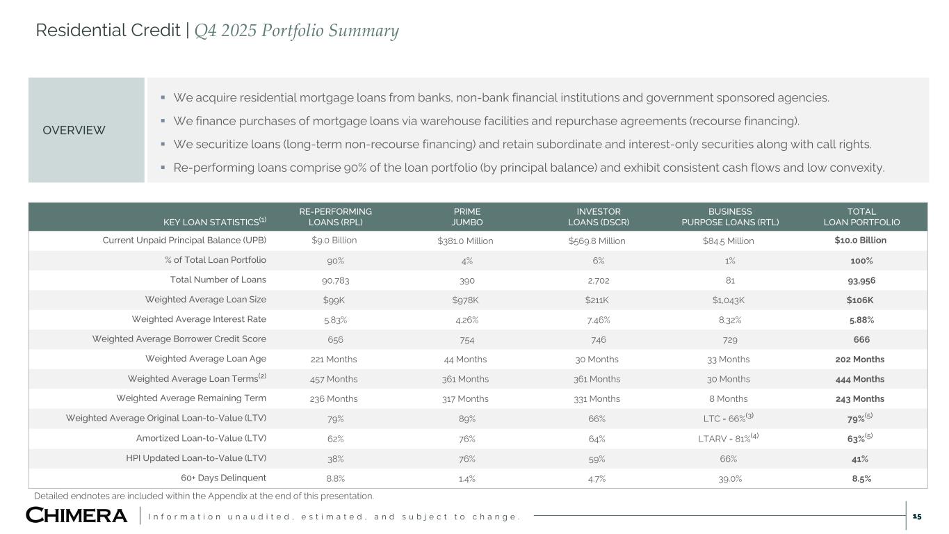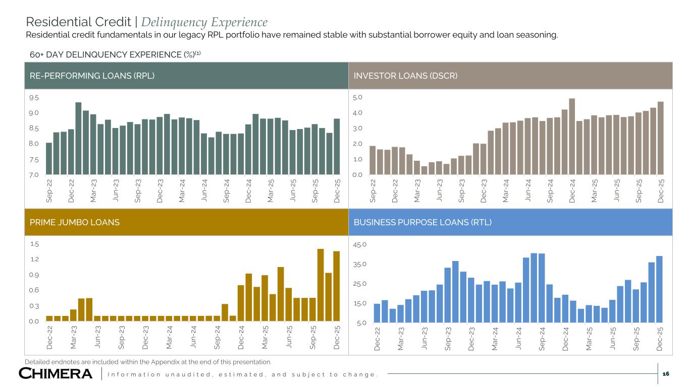 I n f o r m a t i o n u n a u d i t e d , e s t i m a t e d , a n d s u b j e c t t o c h a n g e . Residential Credit | Q4 2025 Portfolio Summary 15 OVERVIEW  We acquire residential mortgage loans from banks, non-bank financial institutions and government sponsored agencies.  We finance purchases of mortgage loans via warehouse facilities and repurchase agreements (recourse financing).  We securitize loans (long-term non-recourse financing) and retain subordinate and interest-only securities along with call rights.  Re-performing loans comprise 90% of the loan portfolio (by principal balance) and exhibit consistent cash flows and low convexity. Detailed endnotes are included within the Appendix at the end of this presentation. KEY LOAN STATISTICS(1) RE-PERFORMING LOANS (RPL) PRIME JUMBO INVESTOR LOANS (DSCR) BUSINESS PURPOSE LOANS (RTL) TOTAL LOAN PORTFOLIO Current Unpaid Principal Balance (UPB) $9.0 Billion $381.0 Million $569.8 Million $84.5 Million $10.0 Billion % of Total Loan Portfolio 90% 4% 6% 1% 100% Total Number of Loans 90,783 390 2,702 81 93,956 Weighted Average Loan Size $99K $978K $211K $1,043K $106K Weighted Average Interest Rate 5.83% 4.26% 7.46% 8.32% 5.88% Weighted Average Borrower Credit Score 656 754 746 729 666 Weighted Average Loan Age 221 Months 44 Months 30 Months 33 Months 202 Months Weighted Average Loan Terms(2) 457 Months 361 Months 361 Months 30 Months 444 Months Weighted Average Remaining Term 236 Months 317 Months 331 Months 8 Months 243 Months Weighted Average Original Loan-to-Value (LTV) 79% 89% 66% LTC = 66%(3) 79%(5) Amortized Loan-to-Value (LTV) 62% 76% 64% LTARV = 81%(4) 63%(5) HPI Updated Loan-to-Value (LTV) 38% 76% 59% 66% 41% 60+ Days Delinquent 8.8% 1.4% 4.7% 39.0% 8.5%