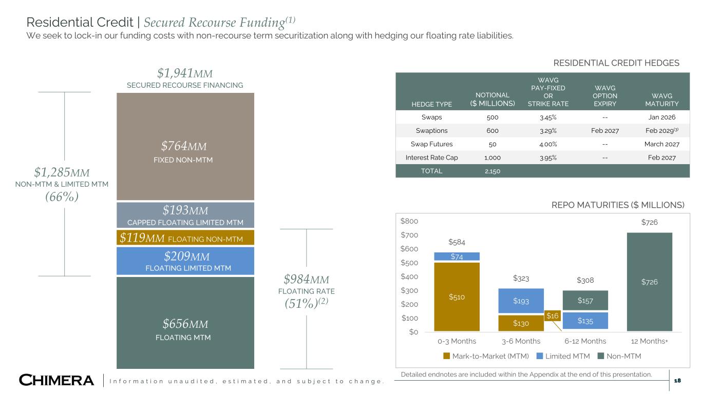 I n f o r m a t i o n u n a u d i t e d , e s t i m a t e d , a n d s u b j e c t t o c h a n g e . 17 Residential Credit | Prepayment Experience Prepayments remained relatively flat in Q4 for RPL; while DSCR and Prime Jumbo prepayment activity picked up. RE-PERFORMING LOANS (RPL) INVESTOR LOANS (DSCR) PRIME JUMBO LOANS 0 2 4 6 8 10 12 Se p- 22 D ec -2 2 M ar -2 3 Ju n- 23 Se p- 23 D ec -2 3 M ar -2 4 Ju n- 24 Se p- 24 D ec -2 4 M ar -2 5 Ju n- 25 Se p- 25 D ec -2 5 0 2 4 6 8 10 D ec -2 2 M ar -2 3 Ju n- 23 Se p- 23 D ec -2 3 M ar -2 4 Ju n- 24 Se p- 24 D ec -2 4 M ar -2 5 Ju n- 25 Se p- 25 D ec -2 5 PREPAYMENT EXPERIENCE (ANNUALIZED %)(1) 0 5 10 15 20 Se p- 22 D ec -2 2 M ar -2 3 Ju n- 23 Se p- 23 D ec -2 3 M ar -2 4 Ju n- 24 Se p- 24 D ec -2 4 M ar -2 5 Ju n- 25 Se p- 25 D ec -2 5 Detailed endnotes are included within the Appendix at the end of this presentation.
