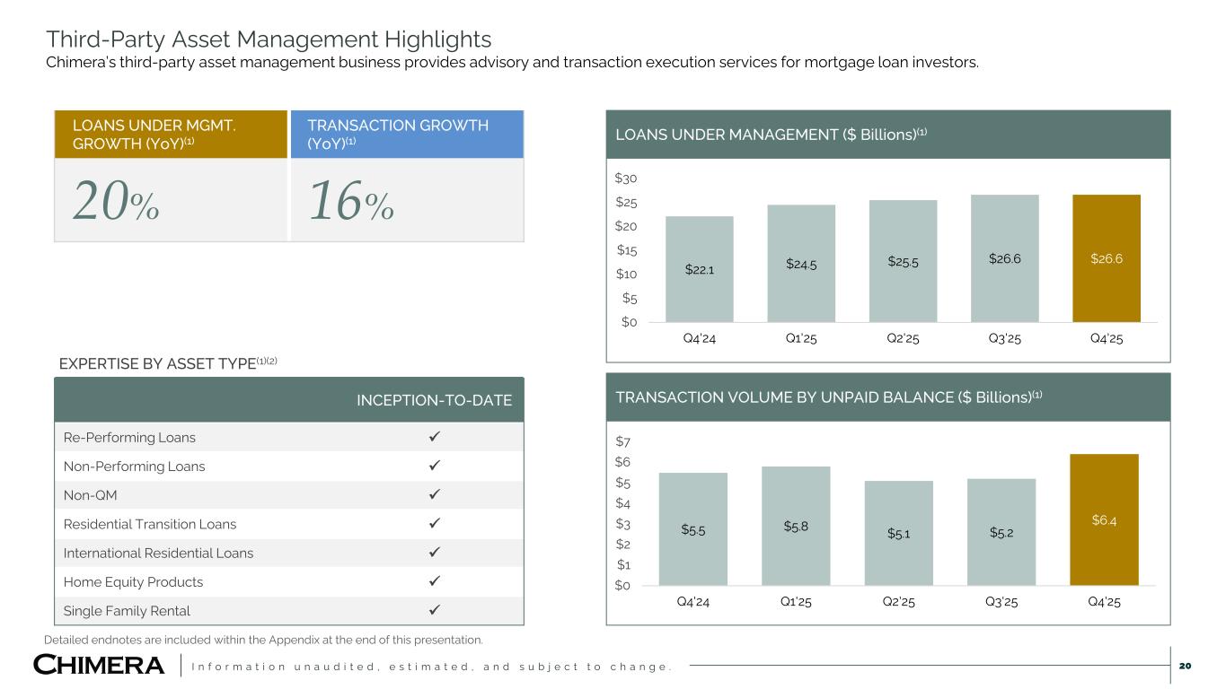 I n f o r m a t i o n u n a u d i t e d , e s t i m a t e d , a n d s u b j e c t t o c h a n g e . 19 Mortgage Servicing Rights Financing Receivables (“MSRs”)(1) We believe MSRs provide predictable cash flows and are a natural hedge within Chimera’s portfolio. MSR PORTFOLIO CHARACTERISTICS & VALUATION MULTIPLE As of December 31, 2025 QUARTERLY UPDATE  Mortgage rates declined to 15 basis points to 6.15% during the quarter.  3-month average prepayments increased to 8.0% during quarter from 6.6% in Q3 2025.  Valuation multiple increased 0.1x due to an increase in forward curves and slightly lower interest rates as higher rate loans payoff. UNPAID BALANCE LOAN COUNT WAVG NOTE RATE 3M CPR $6.2B 28.4K 4.0% 8.0% WAVG CREDIT SCORE LOAN-TO- VALUE 60+ DAYS DELINQUENT VALUATION MULTIPLE 739 69.0% 1.4% 5.7X 0.4% 2.8% 21.7% 17.7% 20.3% 6.8% 8.2% 5.6% 6.1% 1.3% 1.5% 4.9% 2.7% <2 % 2% -2 .5 % 2. 5% -3 % 3% -3 .5 % 3. 5% -4 % 4% -4 .5 % 4. 5% -5 % 5% -5 .5 % 5. 5% -6 % 6% -6 .3 % 6. 3% -6 .5 % 6. 5% -7 % >7 % NOTE RATE DISTRIBUTION As of December 31, 2025 30-Year Fixed Mortgage Rate = 6.15%
