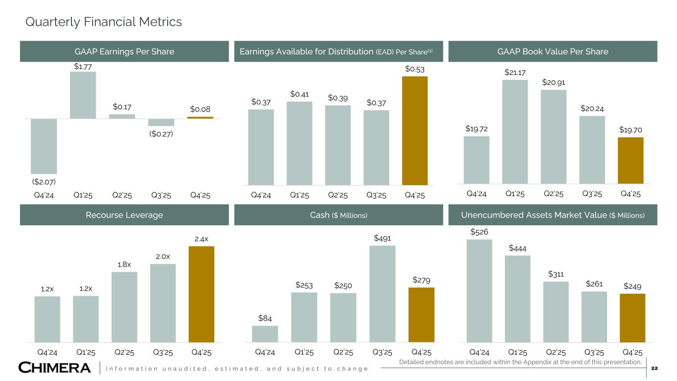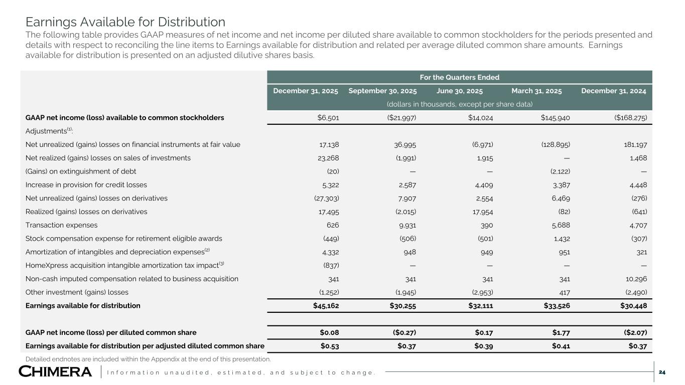 I n f o r m a t i o n u n a u d i t e d , e s t i m a t e d , a n d s u b j e c t t o c h a n g e . Earnings Available for Distribution The following table provides GAAP measures of net income and net income per diluted share available to common stockholders for the periods presented and details with respect to reconciling the line items to Earnings available for distribution and related per average diluted common share amounts. Earnings available for distribution is presented on an adjusted dilutive shares basis. 24 Detailed endnotes are included within the Appendix at the end of this presentation. For the Quarters Ended December 31, 2025 September 30, 2025 June 30, 2025 March 31, 2025 December 31, 2024 (dollars in thousands, except per share data) GAAP net income (loss) available to common stockholders $6,501 ($21,997) $14,024 $145,940 ($168,275) Adjustments(1): Net unrealized (gains) losses on financial instruments at fair value 17,138 36,995 (6,971) (128,895) 181,197 Net realized (gains) losses on sales of investments 23,268 (1,991) 1,915 — 1,468 (Gains) on extinguishment of debt (20) — — (2,122) — Increase in provision for credit losses 5,322 2,587 4,409 3,387 4,448 Net unrealized (gains) losses on derivatives (27,303) 7,907 2,554 6,469 (276) Realized (gains) losses on derivatives 17,495 (2,015) 17,954 (82) (641) Transaction expenses 626 9,931 390 5,688 4,707 Stock compensation expense for retirement eligible awards (449) (506) (501) 1,432 (307) Amortization of intangibles and depreciation expenses(2) 4,332 948 949 951 321 HomeXpress acquisition intangible amortization tax impact(3) (837) — — — — Non-cash imputed compensation related to business acquisition 341 341 341 341 10,296 Other investment (gains) losses (1,252) (1,945) (2,953) 417 (2,490) Earnings available for distribution $45,162 $30,255 $32,111 $33,526 $30,448 GAAP net income (loss) per diluted common share $0.08 ($0.27) $0.17 $1.77 ($2.07) Earnings available for distribution per adjusted diluted common share $0.53 $0.37 $0.39 $0.41 $0.37