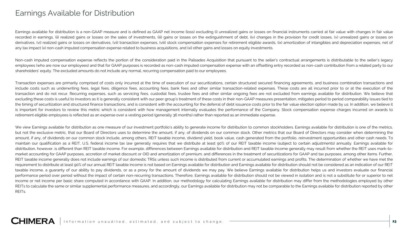 I n f o r m a t i o n u n a u d i t e d , e s t i m a t e d , a n d s u b j e c t t o c h a n g e . Earnings Available for Distribution 23 Earnings available for distribution is a non-GAAP measure and is defined as GAAP net income (loss) excluding (i) unrealized gains or losses on financial instruments carried at fair value with changes in fair value recorded in earnings, (ii) realized gains or losses on the sales of investments, (iii) gains or losses on the extinguishment of debt, (iv) changes in the provision for credit losses, (v) unrealized gains or losses on derivatives, (vi) realized gains or losses on derivatives, (vii) transaction expenses, (viii) stock compensation expenses for retirement eligible awards, (ix) amortization of intangibles and depreciation expenses, net of any tax impact (x) non-cash imputed compensation expense related to business acquisitions, and (xi) other gains and losses on equity investments. Non-cash imputed compensation expense reflects the portion of the consideration paid in the Palisades Acquisition that pursuant to the seller’s contractual arrangements is distributable to the seller’s legacy employees (who are now our employees) and that for GAAP purposes is recorded as non-cash imputed compensation expense with an offsetting entry recorded as non-cash contribution from a related party to our shareholders’ equity. The excluded amounts do not include any normal, recurring compensation paid to our employees. Transaction expenses are primarily comprised of costs only incurred at the time of execution of our securitizations, certain structured secured financing agreements, and business combination transactions and include costs such as underwriting fees, legal fees, diligence fees, accounting fees, bank fees and other similar transaction-related expenses. These costs are all incurred prior to or at the execution of the transaction and do not recur. Recurring expenses, such as servicing fees, custodial fees, trustee fees and other similar ongoing fees are not excluded from earnings available for distribution. We believe that excluding these costs is useful to investors as it is generally consistent with our peer group’s treatment of these costs in their non-GAAP measures presentation, mitigates period to period comparability issues tied to the timing of securitization and structured finance transactions, and is consistent with the accounting for the deferral of debt issuance costs prior to the fair value election option made by us. In addition, we believe it is important for investors to review this metric which is consistent with how management internally evaluates the performance of the Company. Stock compensation expense charges incurred on awards to retirement eligible employees is reflected as an expense over a vesting period (generally 36 months) rather than reported as an immediate expense. We view Earnings available for distribution as one measure of our investment portfolio's ability to generate income for distribution to common stockholders. Earnings available for distribution is one of the metrics, but not the exclusive metric, that our Board of Directors uses to determine the amount, if any, of dividends on our common stock. Other metrics that our Board of Directors may consider when determining the amount, if any, of dividends on our common stock include, among others, REIT taxable income, dividend yield, book value, cash generated from the portfolio, reinvestment opportunities and other cash needs. To maintain our qualification as a REIT, U.S. federal income tax law generally requires that we distribute at least 90% of our REIT taxable income (subject to certain adjustments) annually. Earnings available for distribution, however, is different than REIT taxable income. For example, differences between Earnings available for distribution and REIT taxable income generally may result from whether the REIT uses mark-to- market accounting for GAAP purposes, accretion of market discount or OID and amortization of premium, and differences in the treatment of securitizations for GAAP and tax purposes, among other items. Further, REIT taxable income generally does not include earnings of our domestic TRSs unless such income is distributed from current or accumulated earnings and profits. The determination of whether we have met the requirement to distribute at least 90% of our annual REIT taxable income is not based on Earnings available for distribution and Earnings available for distribution should not be considered as an indication of our REIT taxable income, a guaranty of our ability to pay dividends, or as a proxy for the amount of dividends we may pay. We believe Earnings available for distribution helps us and investors evaluate our financial performance period over period without the impact of certain non-recurring transactions. Therefore, Earnings available for distribution should not be viewed in isolation and is not a substitute for or superior to net income or net income per basic share computed in accordance with GAAP. In addition, our methodology for calculating Earnings available for distribution may differ from the methodologies employed by other REITs to calculate the same or similar supplemental performance measures, and accordingly, our Earnings available for distribution may not be comparable to the Earnings available for distribution reported by other REITs.
