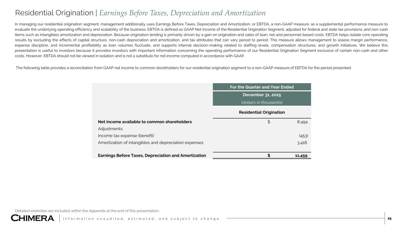 I n f o r m a t i o n u n a u d i t e d , e s t i m a t e d , a n d s u b j e c t t o c h a n g e . 25 Detailed endnotes are included within the Appendix at the end of this presentation. Residential Origination | Earnings Before Taxes, Depreciation and Amortization In managing our residential origination segment, management additionally uses Earnings Before Taxes, Depreciation and Amortization, or EBTDA, a non-GAAP measure, as a supplemental performance measure to evaluate the underlying operating efficiency and scalability of the business. EBTDA is defined as GAAP Net Income of the Residential Origination Segment, adjusted for federal and state tax provisions; and non-cash items such as intangibles amortization and depreciation. Because origination lending is primarily driven by a gain on origination and sales of loan, net and personnel-based costs, EBTDA helps isolate core operating results by excluding the effects of capital structure, non-cash depreciation and amortization, and tax attributes that can vary period to period. This measure allows management to assess margin performance, expense discipline, and incremental profitability as loan volumes fluctuate, and supports internal decision-making related to staffing levels, compensation structures, and growth initiatives. We believe this presentation is useful to investors because it provides investors with important information concerning the operating performance of our Residential Origination Segment exclusive of certain non-cash and other costs. However, EBTDA should not be viewed in isolation and is not a substitute for net income computed in accordance with GAAP. The following table provides a reconciliation from GAAP net income to common stockholders for our residential origination segment to a non-GAAP measure of EBTDA for the period presented. For the Quarter and Year Ended December 31, 2025 (dollars in thousands) Residential Origination Net income available to common shareholders $ 8,494 Adjustments: Income tax expense (benefit) (453) Amortization of intangibles and depreciation expenses 3,418 Earnings Before Taxes, Depreciation and Amortization $ 11,459