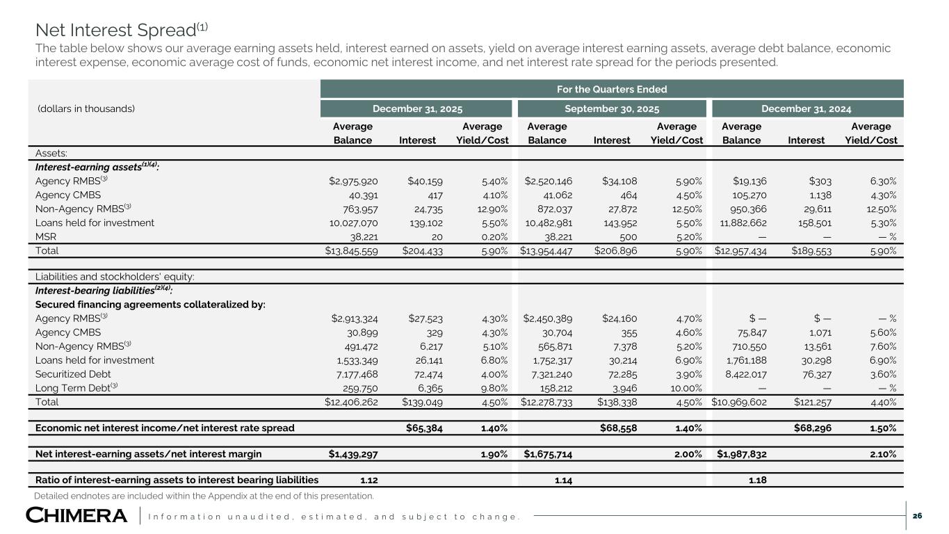 I n f o r m a t i o n u n a u d i t e d , e s t i m a t e d , a n d s u b j e c t t o c h a n g e . 26 Net Interest Spread(1) The table below shows our average earning assets held, interest earned on assets, yield on average interest earning assets, average debt balance, economic interest expense, economic average cost of funds, economic net interest income, and net interest rate spread for the periods presented. Detailed endnotes are included within the Appendix at the end of this presentation. For the Quarters Ended (dollars in thousands) December 31, 2025 September 30, 2025 December 31, 2024 Average Interest Average Average Interest Average Average Interest Average Balance Yield/Cost Balance Yield/Cost Balance Yield/Cost Assets: Interest-earning assets(1)(4): Agency RMBS(3) $2,975,920 $40,159 5.40% $2,520,146 $34,108 5.90% $19,136 $303 6.30% Agency CMBS 40,391 417 4.10% 41,062 464 4.50% 105,270 1,138 4.30% Non-Agency RMBS(3) 763,957 24,735 12.90% 872,037 27,872 12.50% 950,366 29,611 12.50% Loans held for investment 10,027,070 139,102 5.50% 10,482,981 143,952 5.50% 11,882,662 158,501 5.30% MSR 38,221 20 0.20% 38,221 500 5.20% — — — % Total $13,845,559 $204,433 5.90% $13,954,447 $206,896 5.90% $12,957,434 $189,553 5.90% Liabilities and stockholders' equity: Interest-bearing liabilities(2)(4): Secured financing agreements collateralized by: Agency RMBS(3) $2,913,324 $27,523 4.30% $2,450,389 $24,160 4.70% $ — $ — — % Agency CMBS 30,899 329 4.30% 30,704 355 4.60% 75,847 1,071 5.60% Non-Agency RMBS(3) 491,472 6,217 5.10% 565,871 7,378 5.20% 710,550 13,561 7.60% Loans held for investment 1,533,349 26,141 6.80% 1,752,317 30,214 6.90% 1,761,188 30,298 6.90% Securitized Debt 7,177,468 72,474 4.00% 7,321,240 72,285 3.90% 8,422,017 76,327 3.60% Long Term Debt(3) 259,750 6,365 9.80% 158,212 3,946 10.00% — — — % Total $12,406,262 $139,049 4.50% $12,278,733 $138,338 4.50% $10,969,602 $121,257 4.40% Economic net interest income/net interest rate spread $65,384 1.40% $68,558 1.40% $68,296 1.50% Net interest-earning assets/net interest margin $1,439,297 1.90% $1,675,714 2.00% $1,987,832 2.10% Ratio of interest-earning assets to interest bearing liabilities 1.12 1.14 1.18