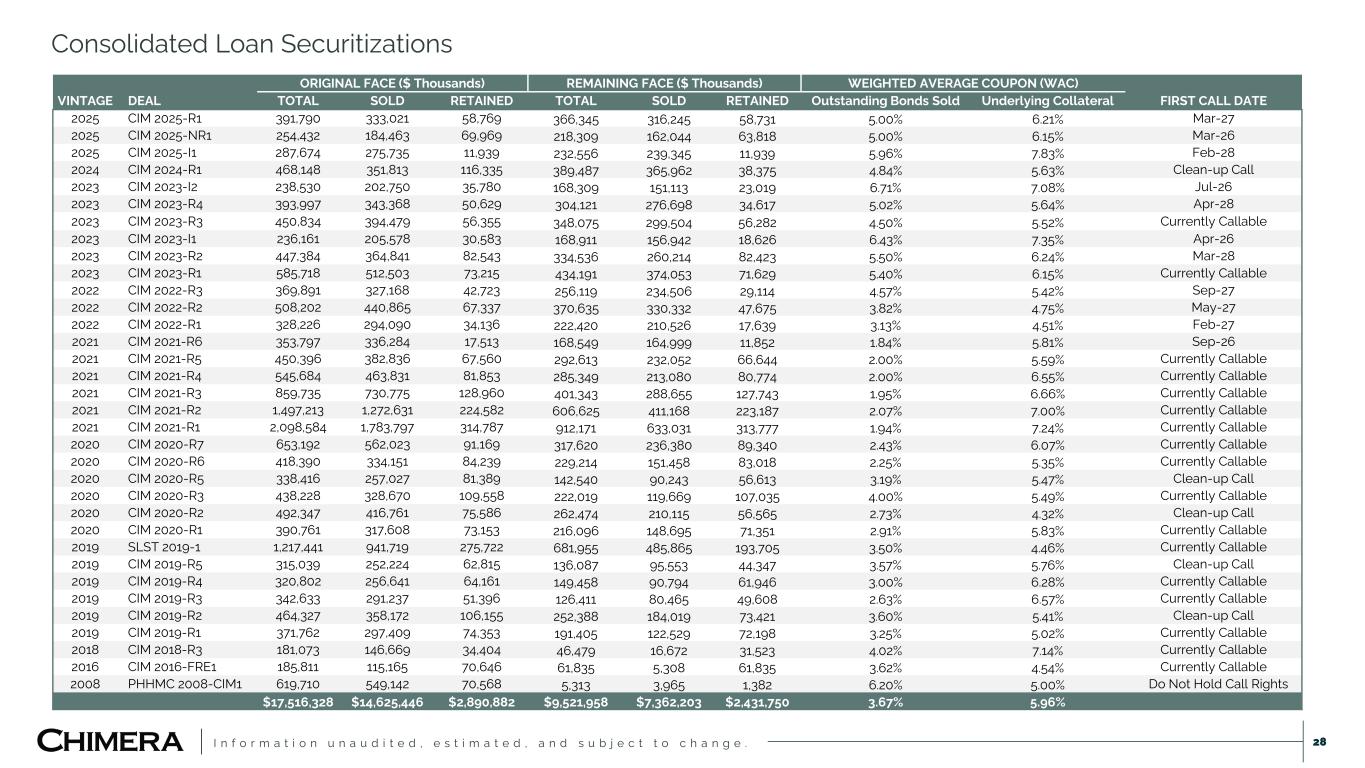 I n f o r m a t i o n u n a u d i t e d , e s t i m a t e d , a n d s u b j e c t t o c h a n g e . Investment Summary | September 30, 2025(1) 27 Detailed endnotes are included within the Appendix at the end of this presentation. (DOLLARS IN THOUSANDS) PRINCIPAL OR NOTIONAL VALUE ($) AMORTIZED COST ($) FAIR VALUE ($) WEIGHTED AVERAGE COUPON WEIGHTED AVERAGE BOOK YIELD AT PERIOD-END SECURITIZED DEBT CURRENT FACE ($) SECURITIZED DEBT AMORTIZED COST ($) SECURITIZED DEBT FAIR VALUE ($) SECURITIZED DEBT BOOK YIELD SECURED FINANCING AGREEMENTS ($) NET ASSETS ($) NON-AGENCY RMBS(2) Senior 865,570 373,636 520,586 5.7% 20.2% 109,786 67,558 67,558(3) 2.64% 268,509 184,523 Subordinated 499,426 257,315 265,181 4.3% 8.9% — — — — 212,975 52,208 Interest-only 2,481,658 148,446 83,071 0.7% 4.5% — — — — 18,681 64,392 TOTAL NON-AGENCY RMBS 3,846,655 779,397 868,838 4.3% 13.5% 109,786 67,558 67,558 2.64% 500,165 301,122 AGENCY RMBS Agency CMO 350,865 350,773 352,826 5.5% 5.6% — — — — 336,707 16,120 Pass-through(4) 2,561,414 2,487,679 2,520,538 4.9% 5.3% — — — — 2,416,551 103,988 Interest-only 370,958 18,766 15,683 0.7% 6.8% — — — — — 15,683 TOTAL AGENCY RMBS 3,283,236 2,857,218 2,889,047 4.9% 5.3% — — — — 2,753,258 135,791 AGENCY CMBS Project loans 39,706 40,310 32,457 3.4% 3.3% — — — — 29,673 2,784 Interest-only 124,271 3,421 2,972 0.9% 12.8% — — — — 1,256 1,716 TOTAL AGENCY CMBS 163,977 43,731 35,429 3.2% 4.1% — — — — 30,929 4,499 LOANS HELD FOR INVESTMENT Re-performing loans 9,204,848 9,003,416 9,039,144 5.5% 5.5% 6,810,837 6,663,937 6,390,889 3.90% 1,168,786 1,479,469 Prime loans 397,793 361,755 374,480 4.3% 5.9% 3,965 3,563 3,959 7.19% 309,665 60,856 Investor loans 770,195 789,826 786,384 6.9% 6.5% 620,153 619,744 628,092 6.37% — 158,292 Business purpose loans (RTL) 144,765 143,482 142,994 9.0% 6.2% — — — — 114,183 28,810 TOTAL LOANS HELD FOR INVESTMENT 10,517,601 10,298,478 10,343,002 5.6% 5.6% 7,434,955 7,287,244 7,022,940 4.11% 1,592,634 1,727,428 MORTGAGE SERVICING RIGHTS Interest in MSR financing receivables 35,528 35,528 TOTAL MSR 35,528 35,528 TOTAL INVESTMENT PORTFOLIO 17,811,469 13,978,824 14,171,844 7,544,741 7,354,802 7,090,497 4,876,986 2,204,369