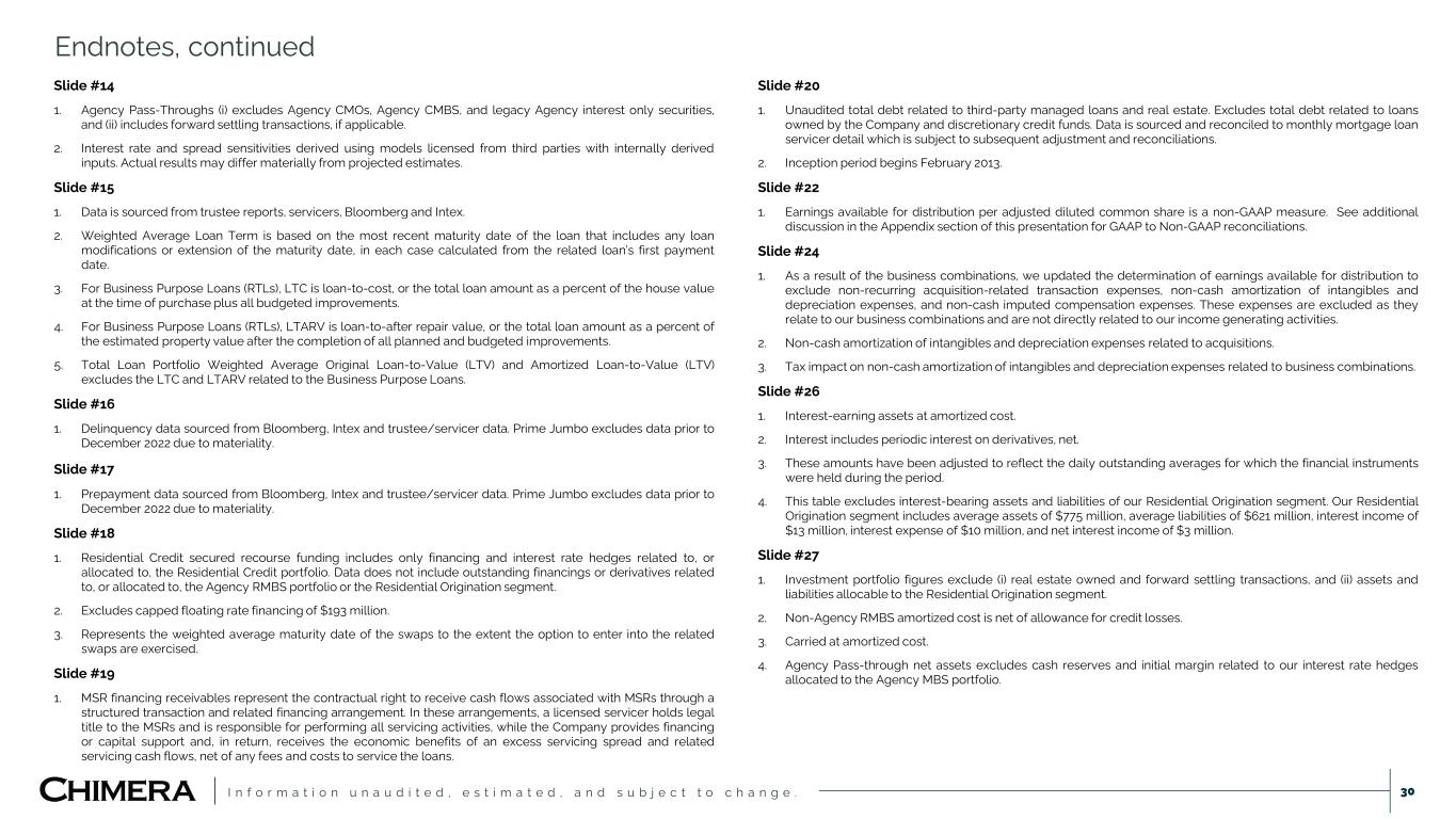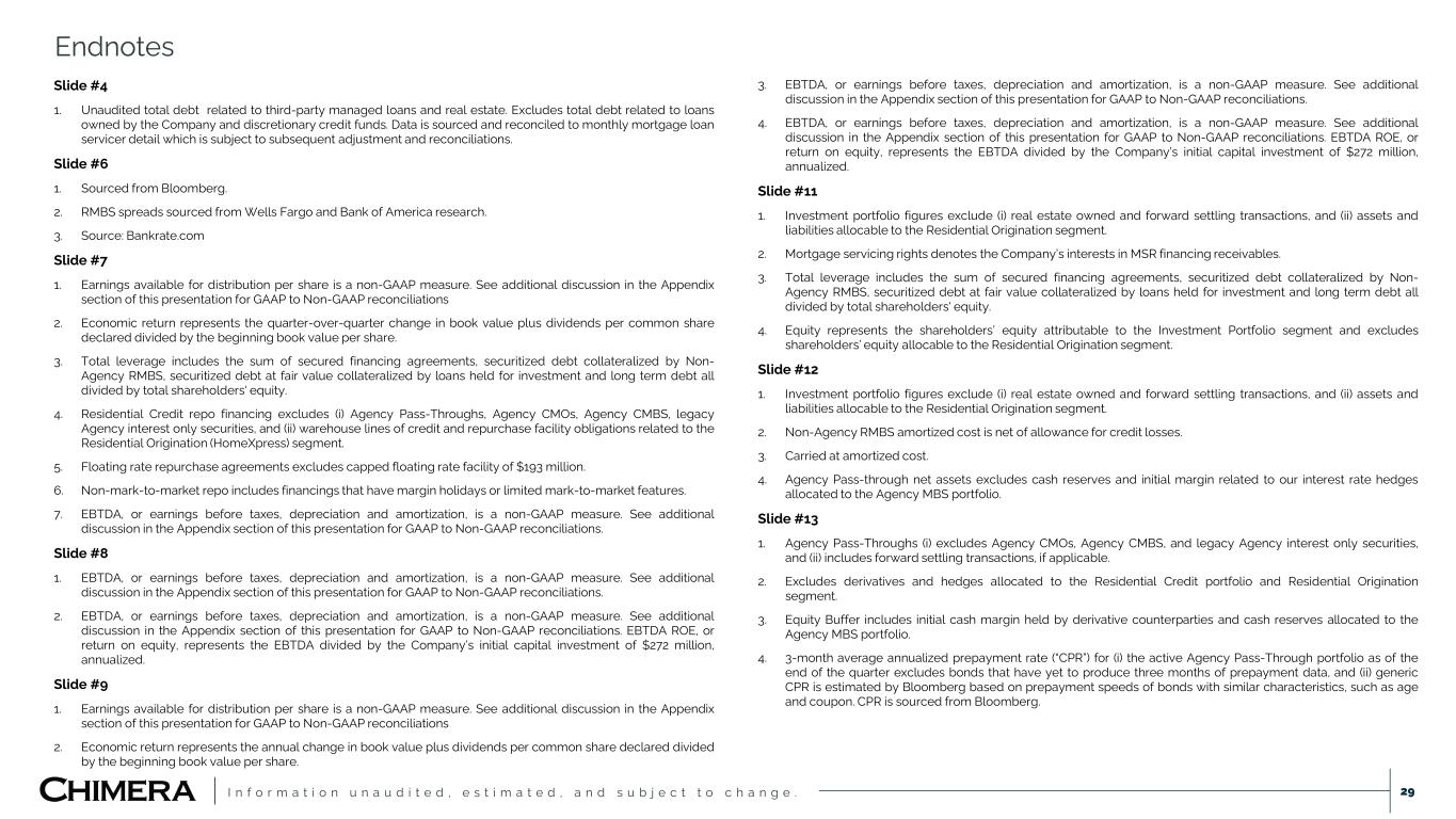 I n f o r m a t i o n u n a u d i t e d , e s t i m a t e d , a n d s u b j e c t t o c h a n g e . Slide #4 1. Unaudited total debt related to third-party managed loans and real estate. Excludes total debt related to loans owned by the Company and discretionary credit funds. Data is sourced and reconciled to monthly mortgage loan servicer detail which is subject to subsequent adjustment and reconciliations. Slide #6 1. Sourced from Bloomberg. 2. RMBS spreads sourced from Wells Fargo and Bank of America research. 3. Source: Bankrate.com Slide #7 1. Earnings available for distribution per share is a non-GAAP measure. See additional discussion in the Appendix section of this presentation for GAAP to Non-GAAP reconciliations 2. Economic return represents the quarter-over-quarter change in book value plus dividends per common share declared divided by the beginning book value per share. 3. Total leverage includes the sum of secured financing agreements, securitized debt collateralized by Non- Agency RMBS, securitized debt at fair value collateralized by loans held for investment and long term debt all divided by total shareholders' equity. 4. Residential Credit repo financing excludes (i) Agency Pass-Throughs, Agency CMOs, Agency CMBS, legacy Agency interest only securities, and (ii) warehouse lines of credit and repurchase facility obligations related to the Residential Origination (HomeXpress) segment. 5. Floating rate repurchase agreements excludes capped floating rate facility of $193 million. 6. Non-mark-to-market repo includes financings that have margin holidays or limited mark-to-market features. 7. EBTDA, or earnings before taxes, depreciation and amortization, is a non-GAAP measure. See additional discussion in the Appendix section of this presentation for GAAP to Non-GAAP reconciliations. Slide #8 1. EBTDA, or earnings before taxes, depreciation and amortization, is a non-GAAP measure. See additional discussion in the Appendix section of this presentation for GAAP to Non-GAAP reconciliations. 2. EBTDA, or earnings before taxes, depreciation and amortization, is a non-GAAP measure. See additional discussion in the Appendix section of this presentation for GAAP to Non-GAAP reconciliations. EBTDA ROE, or return on equity, represents the EBTDA divided by the Company’s initial capital investment of $272 million, annualized. Slide #9 1. Earnings available for distribution per share is a non-GAAP measure. See additional discussion in the Appendix section of this presentation for GAAP to Non-GAAP reconciliations 2. Economic return represents the annual change in book value plus dividends per common share declared divided by the beginning book value per share. 3. EBTDA, or earnings before taxes, depreciation and amortization, is a non-GAAP measure. See additional discussion in the Appendix section of this presentation for GAAP to Non-GAAP reconciliations. 4. EBTDA, or earnings before taxes, depreciation and amortization, is a non-GAAP measure. See additional discussion in the Appendix section of this presentation for GAAP to Non-GAAP reconciliations. EBTDA ROE, or return on equity, represents the EBTDA divided by the Company’s initial capital investment of $272 million, annualized. Slide #11 1. Investment portfolio figures exclude (i) real estate owned and forward settling transactions, and (ii) assets and liabilities allocable to the Residential Origination segment. 2. Mortgage servicing rights denotes the Company’s interests in MSR financing receivables. 3. Total leverage includes the sum of secured financing agreements, securitized debt collateralized by Non- Agency RMBS, securitized debt at fair value collateralized by loans held for investment and long term debt all divided by total shareholders' equity. 4. Equity represents the shareholders’ equity attributable to the Investment Portfolio segment and excludes shareholders’ equity allocable to the Residential Origination segment. Slide #12 1. Investment portfolio figures exclude (i) real estate owned and forward settling transactions, and (ii) assets and liabilities allocable to the Residential Origination segment. 2. Non-Agency RMBS amortized cost is net of allowance for credit losses. 3. Carried at amortized cost. 4. Agency Pass-through net assets excludes cash reserves and initial margin related to our interest rate hedges allocated to the Agency MBS portfolio. Slide #13 1. Agency Pass-Throughs (i) excludes Agency CMOs, Agency CMBS, and legacy Agency interest only securities, and (ii) includes forward settling transactions, if applicable. 2. Excludes derivatives and hedges allocated to the Residential Credit portfolio and Residential Origination segment. 3. Equity Buffer includes initial cash margin held by derivative counterparties and cash reserves allocated to the Agency MBS portfolio. 4. 3-month average annualized prepayment rate (“CPR”) for (i) the active Agency Pass-Through portfolio as of the end of the quarter excludes bonds that have yet to produce three months of prepayment data, and (ii) generic CPR is estimated by Bloomberg based on prepayment speeds of bonds with similar characteristics, such as age and coupon. CPR is sourced from Bloomberg. Endnotes 29