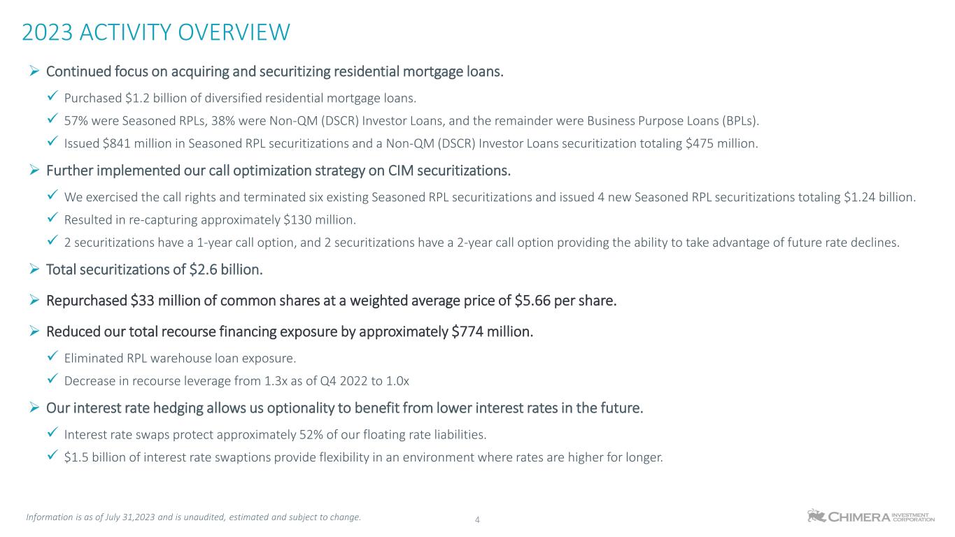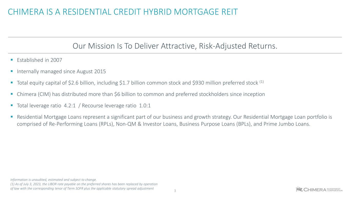 DISCLAIMER 2 This presentation includes “forward-looking statements” within the meaning of the safe harbor provisions of the United States Private Securities Litigation Reform Act of 1995. Actual results may differ from expectations, estimates and projections and, consequently, readers should not rely on these forward-looking statements as predictions of future events. Words such as “goal” “expect,” “target,” “assume,” “estimate,” “project,” “budget,” “forecast,” “anticipate,” “intend,” “plan,” “may,” “will,” “could,” “should,” “believe,” “predicts,” “potential,” “continue,” and similar expressions are intended to identify such forward-looking statements. These forward-looking statements involve significant risks and uncertainties that could cause actual results to differ materially from expected results, including, among other things, those described in our most recent Annual Report on Form 10-K, and any subsequent Quarterly Reports on Form 10-Q and Current Report on Form 8-K, under the caption “Risk Factors.” Factors that could cause actual results to differ include, but are not limited to: our business and investment strategy; our ability to accurately forecast the payment of future dividends on our common and preferred stock, and the amount of such dividends; our ability to determine accurately the fair market value of our assets; availability of investment opportunities in real estate-related and other securities, including our valuation of potential opportunities that may arise as a result of current and future market dislocations; our expected investments; changes in the value of our investments, including negative changes resulting in margin calls related to the financing of our assets; changes in inflation, interest rates and mortgage prepayment rates; prepayments of the mortgage and other loans underlying our mortgage- backed securities, or MBS, or other asset-backed securities, or ABS; rates of default, delinquencies, forbearance, deferred payments, or decreased recovery rates on our investments; general volatility of the securities markets in which we invest; our ability to maintain existing financing arrangements and our ability to obtain future financing arrangements; our ability to effect our strategy to securitize residential mortgage loans; interest rate mismatches between our investments and our borrowings used to finance such purchases; effects of interest rate caps on our adjustable-rate investments; the degree to which our hedging strategies may or may not protect us from interest rate volatility; the impact of and changes to various government programs; the impact of and changes in governmental regulations, tax law and rates, accounting guidance, and similar matters; market trends in our industry, interest rates, the debt securities markets or the general economy; estimates relating to our ability to make distributions to our stockholders in the future; our understanding of our competition; qualified personnel; our ability to maintain our classification as a real estate investment trust, or, REIT, for U.S. federal income tax purposes; our ability to maintain our exemption from registration under the Investment Company Act of 1940, as amended, or 1940 Act; our expectations regarding materiality or significance; and the effectiveness of our disclosure controls and procedures. Readers are cautioned not to place undue reliance upon any forward-looking statements, which speak only as of the date made. Chimera does not undertake or accept any obligation to release publicly any updates or revisions to any forward-looking statement to reflect any change in its expectations or any change in events, conditions or circumstances on which any such statement is based. Additional information concerning these, and other risk factors is contained in Chimera’s most recent filings with the Securities and Exchange Commission (SEC). All subsequent written and oral forward-looking statements concerning Chimera or matters attributable to Chimera or any person acting on its behalf are expressly qualified in their entirety by the cautionary statements above. This presentation may include industry and market data obtained through research, surveys, and studies conducted by third parties and industry publications. We have not independently verified any such market and industry data from third-party sources. This presentation is provided for discussion purposes only and may not be relied upon as legal or investment advice, nor is it intended to be inclusive of all the risks and uncertainties that should be considered. This presentation does not constitute an offer to purchase or sell any securities, nor shall it be construed to be indicative of the terms of an offer that the parties or their respective affiliates would accept. All information in this presentation is as of March 31, 2023, unless stated otherwise. Readers are advised that the financial information in this presentation is based on company data available at the time of this presentation and, in certain circumstances, may not have been audited by the company’s independent auditors.