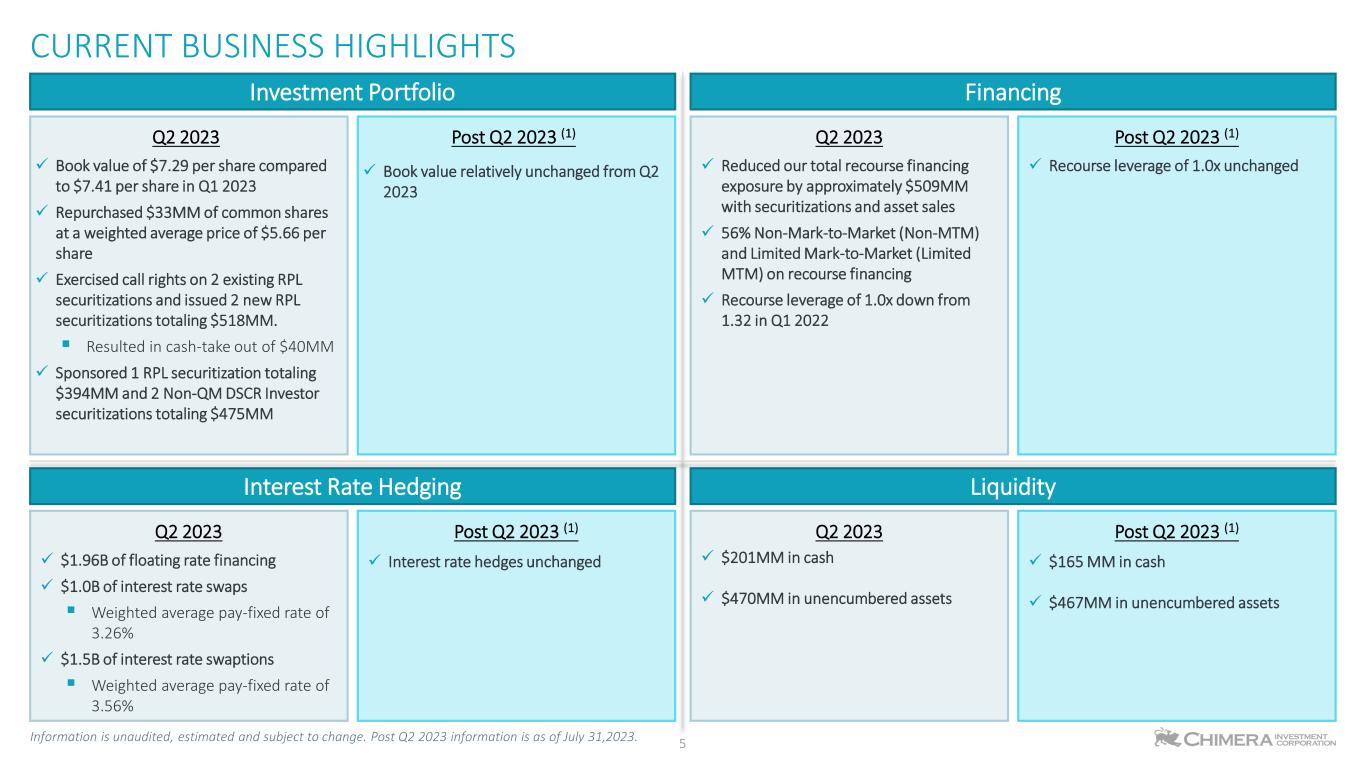 2023 ACTIVITY OVERVIEW 4Information is as of July 31,2023 and is unaudited, estimated and subject to change.  Continued focus on acquiring and securitizing residential mortgage loans.  Purchased $1.2 billion of diversified residential mortgage loans.  57% were Seasoned RPLs, 38% were Non-QM (DSCR) Investor Loans, and the remainder were Business Purpose Loans (BPLs).  Issued $841 million in Seasoned RPL securitizations and a Non-QM (DSCR) Investor Loans securitization totaling $475 million.  Further implemented our call optimization strategy on CIM securitizations.  We exercised the call rights and terminated six existing Seasoned RPL securitizations and issued 4 new Seasoned RPL securitizations totaling $1.24 billion.  Resulted in re-capturing approximately $130 million.  2 securitizations have a 1-year call option, and 2 securitizations have a 2-year call option providing the ability to take advantage of future rate declines.  Total securitizations of $2.6 billion.  Repurchased $33 million of common shares at a weighted average price of $5.66 per share.  Reduced our total recourse financing exposure by approximately $774 million.  Eliminated RPL warehouse loan exposure.  Decrease in recourse leverage from 1.3x as of Q4 2022 to 1.0x  Our interest rate hedging allows us optionality to benefit from lower interest rates in the future.  Interest rate swaps protect approximately 52% of our floating rate liabilities.  $1.5 billion of interest rate swaptions provide flexibility in an environment where rates are higher for longer.