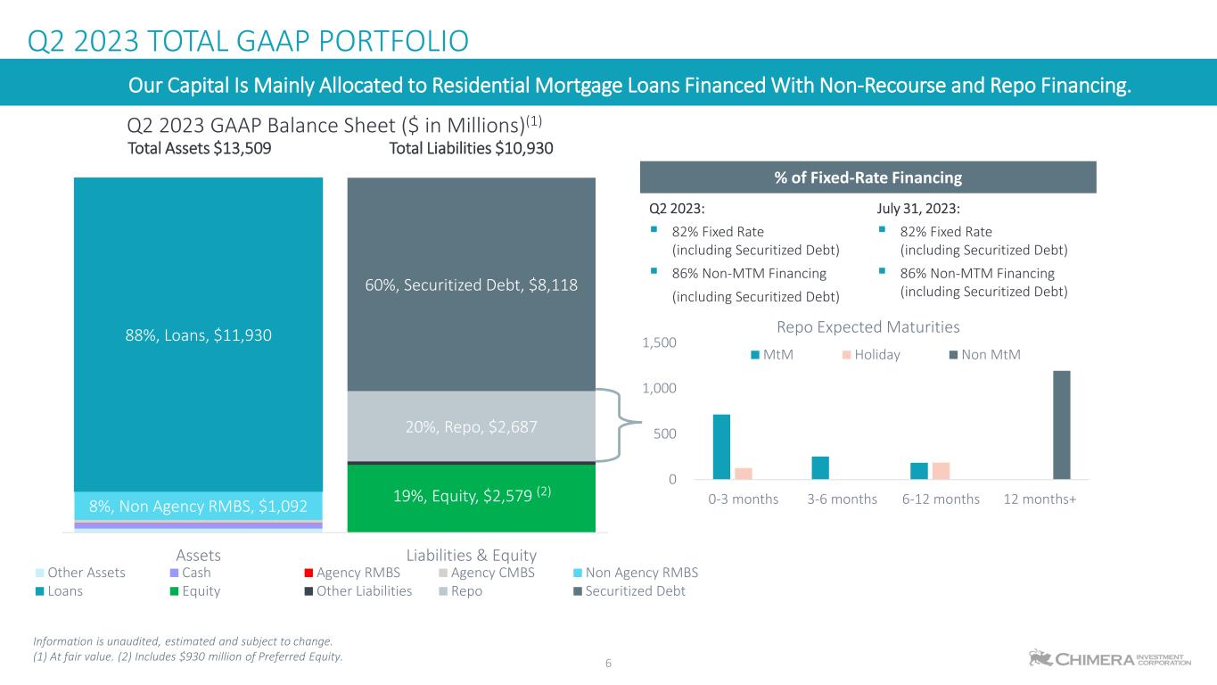 CURRENT BUSINESS HIGHLIGHTS Q2 2023  Book value of $7.29 per share compared to $7.41 per share in Q1 2023  Repurchased $33MM of common shares at a weighted average price of $5.66 per share  Exercised call rights on 2 existing RPL securitizations and issued 2 new RPL securitizations totaling $518MM.  Resulted in cash-take out of $40MM  Sponsored 1 RPL securitization totaling $394MM and 2 Non-QM DSCR Investor securitizations totaling $475MM Post Q2 2023 (1)  Book value relatively unchanged from Q2 2023 Investment Portfolio Financing Q2 2023  Reduced our total recourse financing exposure by approximately $509MM with securitizations and asset sales  56% Non-Mark-to-Market (Non-MTM) and Limited Mark-to-Market (Limited MTM) on recourse financing  Recourse leverage of 1.0x down from 1.32 in Q1 2022 Post Q2 2023 (1)  Recourse leverage of 1.0x unchanged Interest Rate Hedging Q2 2023  $1.96B of floating rate financing  $1.0B of interest rate swaps  Weighted average pay-fixed rate of 3.26%  $1.5B of interest rate swaptions  Weighted average pay-fixed rate of 3.56% Post Q2 2023 (1)  Interest rate hedges unchanged Liquidity Q2 2023  $201MM in cash  $470MM in unencumbered assets Post Q2 2023 (1)  $165 MM in cash  $467MM in unencumbered assets 5Information is unaudited, estimated and subject to change. Post Q2 2023 information is as of July 31,2023.
