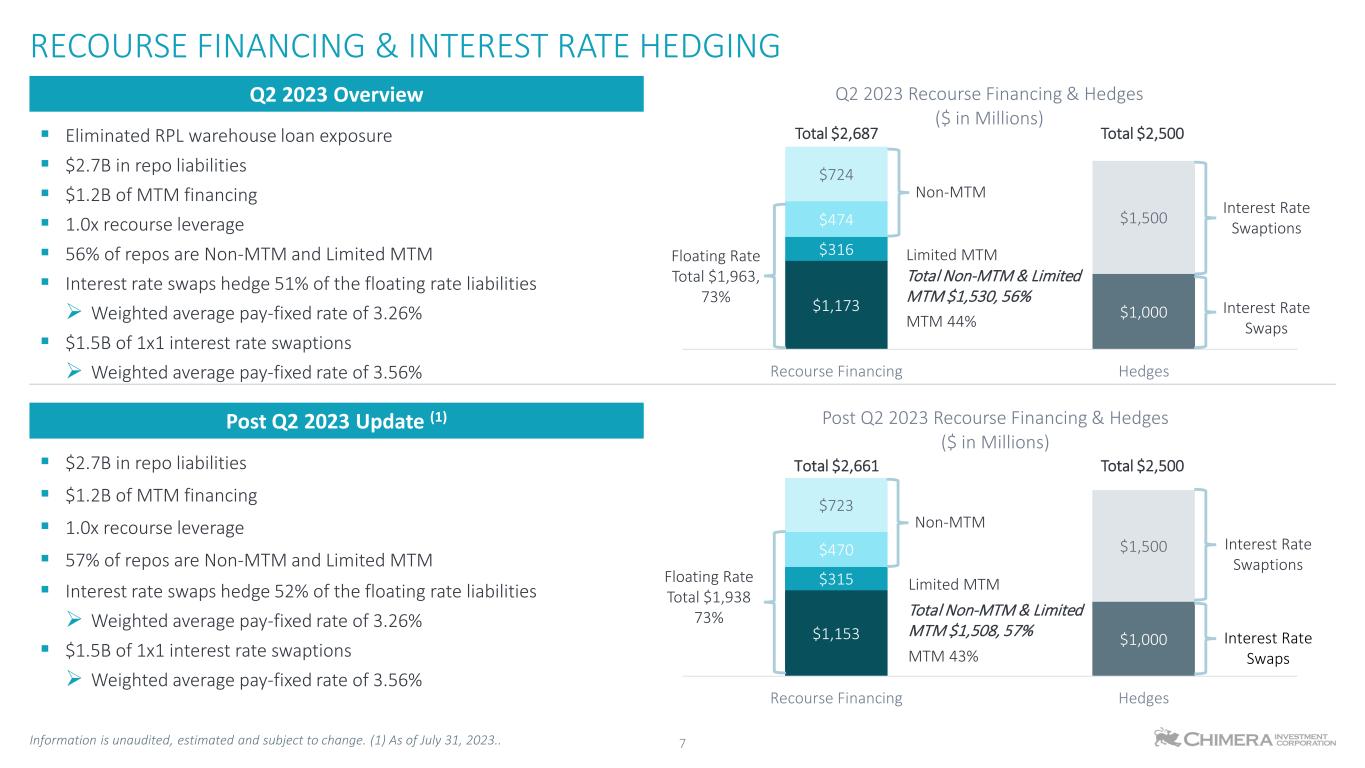 8%, Non Agency RMBS, $1,092 88%, Loans, $11,930 19%, Equity, $2,579 (2) 20%, Repo, $2,687 60%, Securitized Debt, $8,118 Assets Liabilities & Equity Other Assets Cash Agency RMBS Agency CMBS Non Agency RMBS Loans Equity Other Liabilities Repo Securitized Debt Q2 2023 TOTAL GAAP PORTFOLIO 6  Our Capital Is Mainly Allocated to Residential Mortgage Loans Financed With Non-Recourse and Repo Financing. Information is unaudited, estimated and subject to change. (1) At fair value. (2) Includes $930 million of Preferred Equity. % of Fixed-Rate Financing Q2 2023:  82% Fixed Rate (including Securitized Debt)  86% Non-MTM Financing (including Securitized Debt) July 31, 2023:  82% Fixed Rate (including Securitized Debt)  86% Non-MTM Financing (including Securitized Debt) Total Assets $13,509 Total Liabilities $10,930 Q2 2023 GAAP Balance Sheet ($ in Millions)(1) 0 500 1,000 1,500 0-3 months 3-6 months 6-12 months 12 months+ Repo Expected Maturities MtM Holiday Non MtM