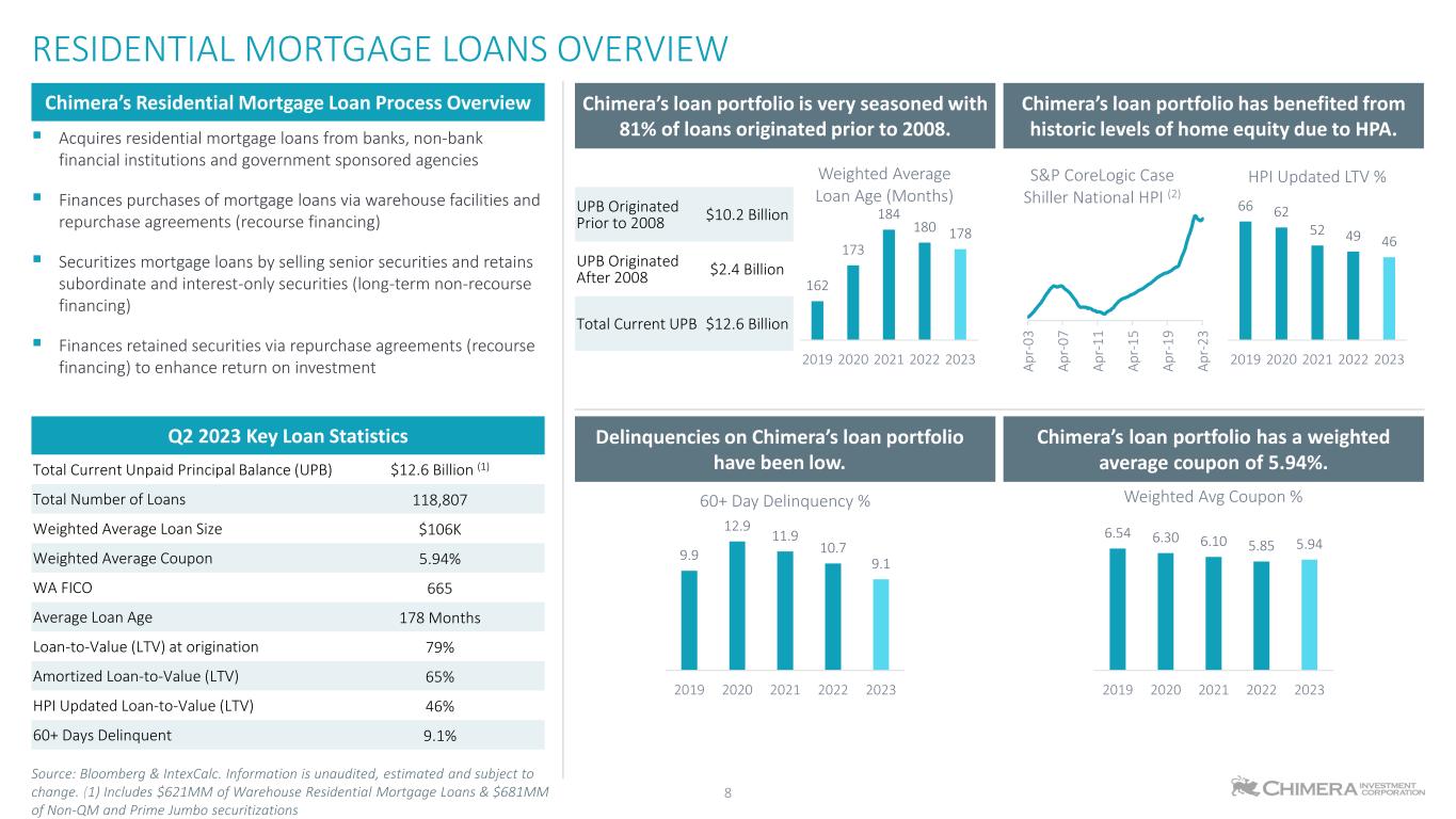 $1,153 $315 $470 $723 $1,000 $1,500 Recourse Financing Hedges Post Q2 2023 Recourse Financing & Hedges ($ in Millions) Interest Rate Swaptions Interest Rate Swaps Total $2,500Total $2,661 $1,173 $316 $474 $724 $1,000 $1,500 Recourse Financing Hedges Q2 2023 Recourse Financing & Hedges ($ in Millions)  Eliminated RPL warehouse loan exposure  $2.7B in repo liabilities  $1.2B of MTM financing  1.0x recourse leverage  56% of repos are Non-MTM and Limited MTM  Interest rate swaps hedge 51% of the floating rate liabilities  Weighted average pay-fixed rate of 3.26%  $1.5B of 1x1 interest rate swaptions  Weighted average pay-fixed rate of 3.56%  $2.7B in repo liabilities  $1.2B of MTM financing  1.0x recourse leverage  57% of repos are Non-MTM and Limited MTM  Interest rate swaps hedge 52% of the floating rate liabilities  Weighted average pay-fixed rate of 3.26%  $1.5B of 1x1 interest rate swaptions  Weighted average pay-fixed rate of 3.56% RECOURSE FINANCING & INTEREST RATE HEDGING Information is unaudited, estimated and subject to change. (1) As of July 31, 2023.. Q2 2023 Overview Post Q2 2023 Update (1) 7 Total $2,687 Total $2,500 Floating Rate Total $1,963, 73% Interest Rate Swaptions Interest Rate Swaps Non-MTM MTM 44% Limited MTM Total Non-MTM & Limited MTM $1,530, 56% Floating Rate Total $1,938 73% Non-MTM Limited MTM Total Non-MTM & Limited MTM $1,508, 57% MTM 43%