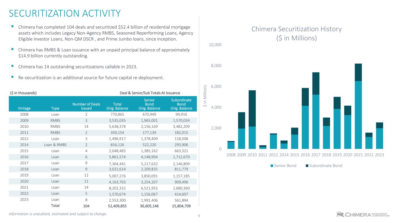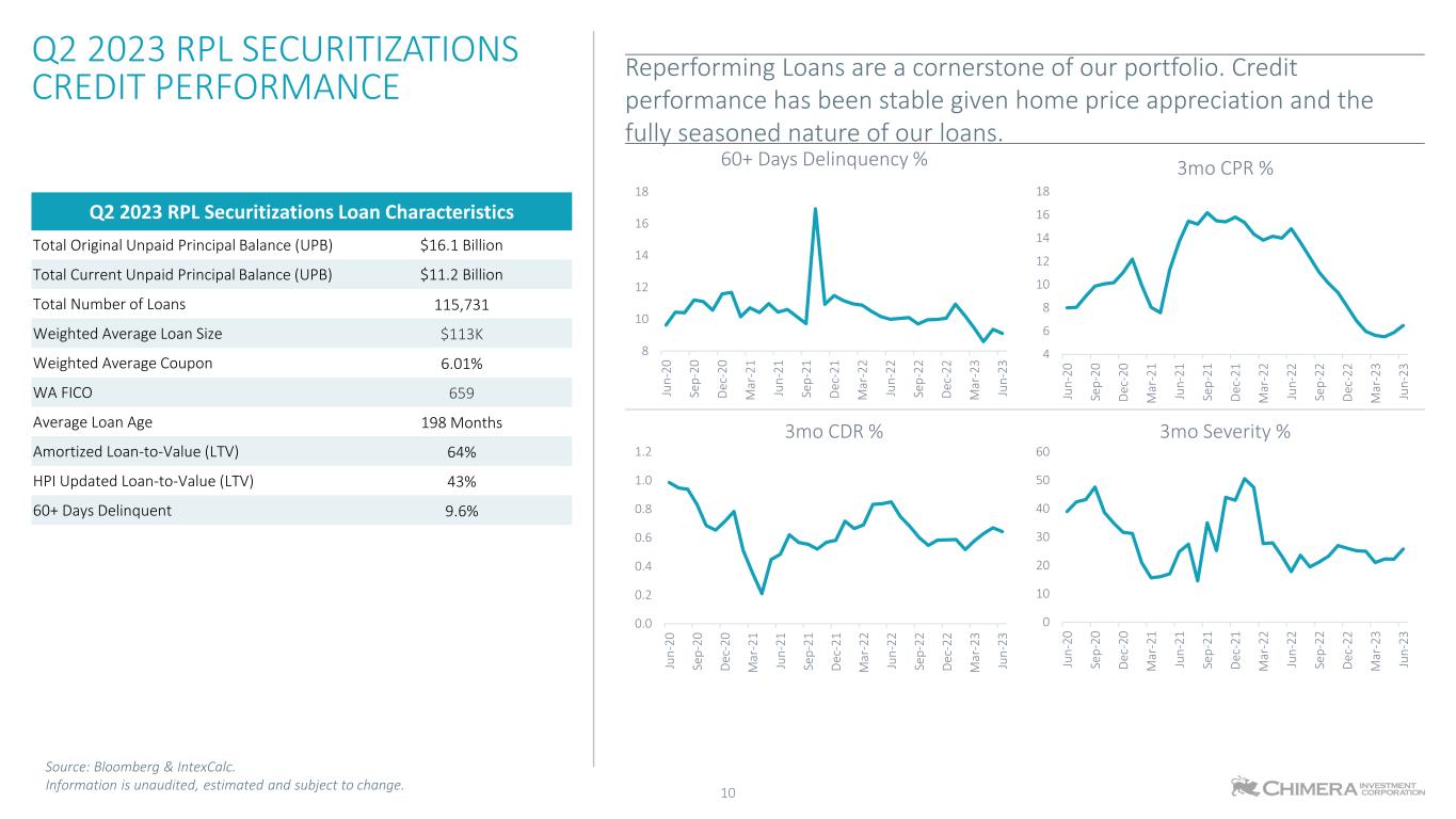  Chimera has completed 104 deals and securitized $52.4 billion of residential mortgage assets which includes Legacy Non-Agency RMBS, Seasoned Reperforming Loans, Agency Eligible Investor Loans, Non-QM DSCR , and Prime Jumbo loans, since inception.  Chimera has RMBS & Loan issuance with an unpaid principal balance of approximately $14.9 billion currently outstanding.  Chimera has 14 outstanding securitizations callable in 2023.  Re-securitization is an additional source for future capital re-deployment. Type ($ in thousands) Deal & Senior/Sub Totals At Issuance Vintage Type Number of Deals Issued Total Orig. Balance Senior Bond Orig. Balance Subordinate Bond Orig. Balance 2008 Loan 2 770,865 670,949 99,916 2009 RMBS 3 3,535,035 1,965,001 1,570,034 2010 RMBS 14 5,638,378 2,156,169 3,482,209 2011 RMBS 2 359,154 177,139 182,015 2012 Loan 3 1,496,917 1,378,409 118,508 2014 Loan & RMBS 2 816,126 522,220 293,906 2015 Loan 4 2,048,483 1,385,162 663,321 2016 Loan 6 5,861,574 4,148,904 1,712,670 2017 Loan 9 7,364,441 5,217,632 2,146,809 2018 Loan 9 3,021,614 2,209,835 811,779 2019 Loan 12 5,007,276 3,850,091 1,157,185 2020 Loan 11 4,163,703 3,254,207 909,496 2021 Loan 14 8,202,315 6,521,955 1,680,360 2022 Loan 5 1,570,674 1,156,067 414,607 2023 Loan 8 2,553,300 1,991,406 561,894 Total 104 52,409,855 36,605,146 15,804,709 SECURITIZATION ACTIVITY 9Information is unaudited, estimated and subject to change. 0 2,000 4,000 6,000 8,000 10,000 2008 2009 2010 2011 2012 2014 2015 2016 2017 2018 2019 2020 2021 2022 2023 $ in M ill io ns Chimera Securitization History ($ in Millions) Senior Bond Subordinate Bond