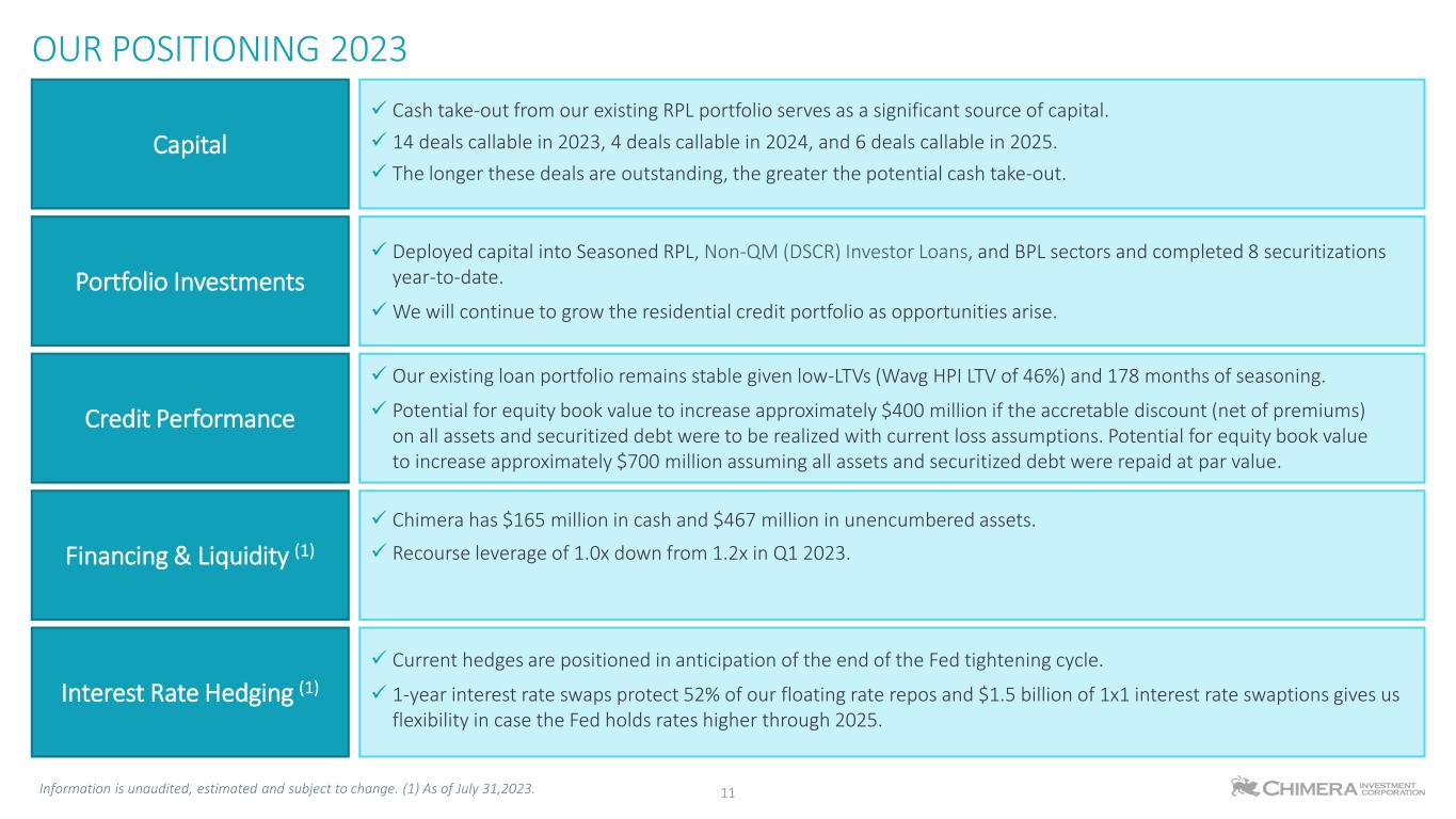 Reperforming Loans are a cornerstone of our portfolio. Credit performance has been stable given home price appreciation and the fully seasoned nature of our loans. Q2 2023 RPL SECURITIZATIONS CREDIT PERFORMANCE 10 Q2 2023 RPL Securitizations Loan Characteristics Total Original Unpaid Principal Balance (UPB) $16.1 Billion Total Current Unpaid Principal Balance (UPB) $11.2 Billion Total Number of Loans 115,731 Weighted Average Loan Size $113K Weighted Average Coupon 6.01% WA FICO 659 Average Loan Age 198 Months Amortized Loan-to-Value (LTV) 64% HPI Updated Loan-to-Value (LTV) 43% 60+ Days Delinquent 9.6% Source: Bloomberg & IntexCalc. Information is unaudited, estimated and subject to change. 8 10 12 14 16 18 Ju n- 20 Se p- 20 D ec -2 0 M ar -2 1 Ju n- 21 Se p- 21 D ec -2 1 M ar -2 2 Ju n- 22 Se p- 22 D ec -2 2 M ar -2 3 Ju n- 23 60+ Days Delinquency % 4 6 8 10 12 14 16 18 Ju n- 20 Se p- 20 D ec -2 0 M ar -2 1 Ju n- 21 Se p- 21 D ec -2 1 M ar -2 2 Ju n- 22 Se p- 22 D ec -2 2 M ar -2 3 Ju n- 23 3mo CPR % 0.0 0.2 0.4 0.6 0.8 1.0 1.2 Ju n- 20 Se p- 20 D ec -2 0 M ar -2 1 Ju n- 21 Se p- 21 D ec -2 1 M ar -2 2 Ju n- 22 Se p- 22 D ec -2 2 M ar -2 3 Ju n- 23 3mo CDR % 0 10 20 30 40 50 60 Ju n- 20 Se p- 20 D ec -2 0 M ar -2 1 Ju n- 21 Se p- 21 D ec -2 1 M ar -2 2 Ju n- 22 Se p- 22 D ec -2 2 M ar -2 3 Ju n- 23 3mo Severity %