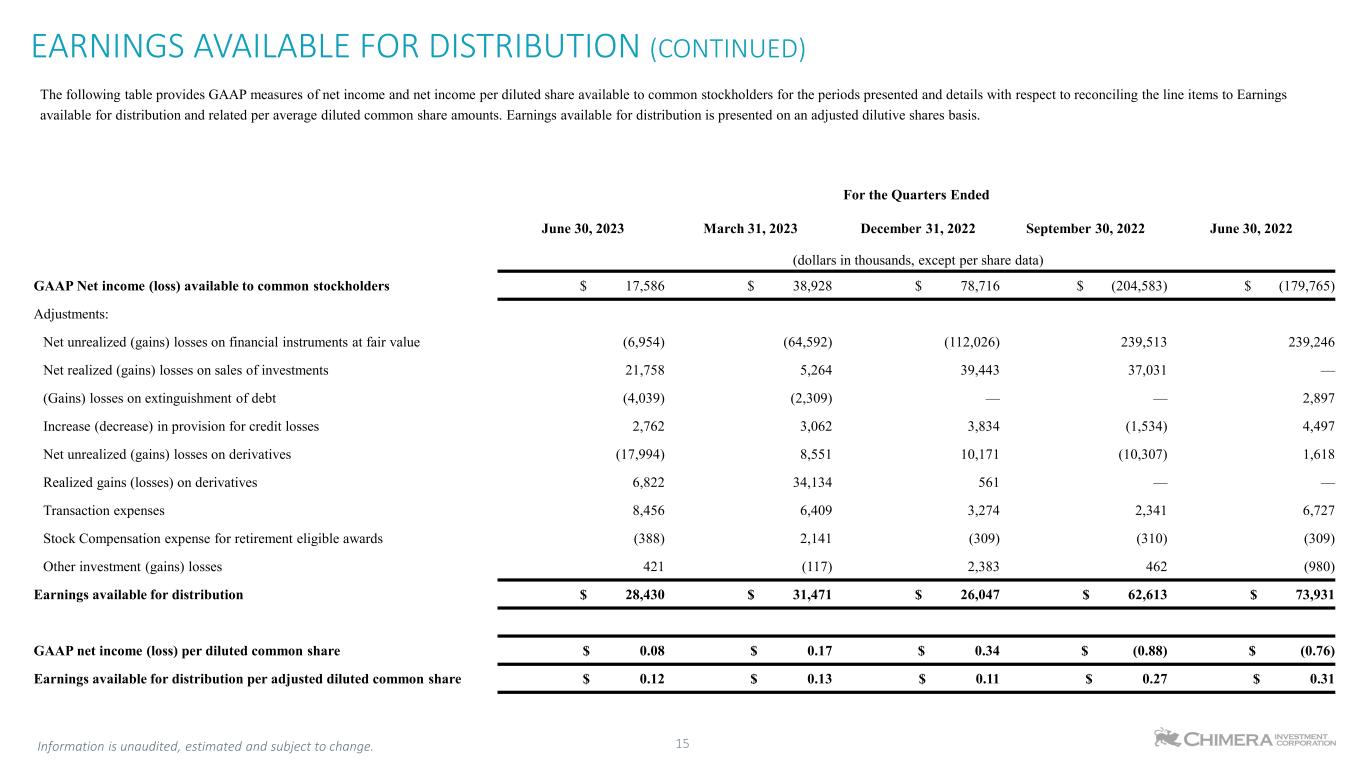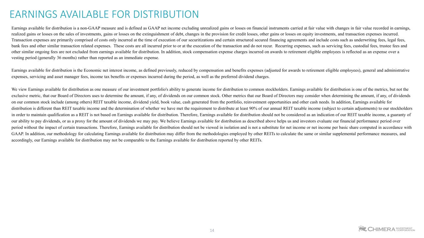 EARNINGS AVAILABLE FOR DISTRIBUTION Earnings available for distribution is a non-GAAP measure and is defined as GAAP net income excluding unrealized gains or losses on financial instruments carried at fair value with changes in fair value recorded in earnings, realized gains or losses on the sales of investments, gains or losses on the extinguishment of debt, changes in the provision for credit losses, other gains or losses on equity investments, and transaction expenses incurred. Transaction expenses are primarily comprised of costs only incurred at the time of execution of our securitizations and certain structured secured financing agreements and include costs such as underwriting fees, legal fees, bank fees and other similar transaction related expenses. These costs are all incurred prior to or at the execution of the transaction and do not recur. Recurring expenses, such as servicing fees, custodial fees, trustee fees and other similar ongoing fees are not excluded from earnings available for distribution. In addition, stock compensation expense charges incurred on awards to retirement eligible employees is reflected as an expense over a vesting period (generally 36 months) rather than reported as an immediate expense. Earnings available for distribution is the Economic net interest income, as defined previously, reduced by compensation and benefits expenses (adjusted for awards to retirement eligible employees), general and administrative expenses, servicing and asset manager fees, income tax benefits or expenses incurred during the period, as well as the preferred dividend charges. We view Earnings available for distribution as one measure of our investment portfolio's ability to generate income for distribution to common stockholders. Earnings available for distribution is one of the metrics, but not the exclusive metric, that our Board of Directors uses to determine the amount, if any, of dividends on our common stock. Other metrics that our Board of Directors may consider when determining the amount, if any, of dividends on our common stock include (among others) REIT taxable income, dividend yield, book value, cash generated from the portfolio, reinvestment opportunities and other cash needs. In addition, Earnings available for distribution is different than REIT taxable income and the determination of whether we have met the requirement to distribute at least 90% of our annual REIT taxable income (subject to certain adjustments) to our stockholders in order to maintain qualification as a REIT is not based on Earnings available for distribution. Therefore, Earnings available for distribution should not be considered as an indication of our REIT taxable income, a guaranty of our ability to pay dividends, or as a proxy for the amount of dividends we may pay. We believe Earnings available for distribution as described above helps us and investors evaluate our financial performance period over period without the impact of certain transactions. Therefore, Earnings available for distribution should not be viewed in isolation and is not a substitute for net income or net income per basic share computed in accordance with GAAP. In addition, our methodology for calculating Earnings available for distribution may differ from the methodologies employed by other REITs to calculate the same or similar supplemental performance measures, and accordingly, our Earnings available for distribution may not be comparable to the Earnings available for distribution reported by other REITs. 14