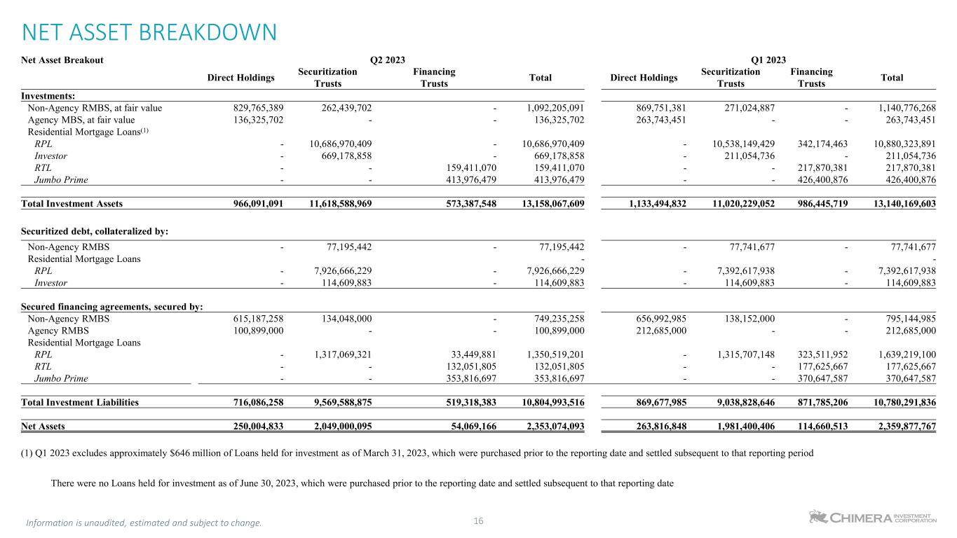 NET ASSET BREAKDOWN 16Information is unaudited, estimated and subject to change. Net Asset Breakout Q2 2023 Q1 2023 Direct Holdings Securitization Trusts Financing Trusts Total Direct Holdings Securitization Trusts Financing Trusts Total Investments: Non-Agency RMBS, at fair value 829,765,389 262,439,702 - 1,092,205,091 869,751,381 271,024,887 - 1,140,776,268 Agency MBS, at fair value 136,325,702 - - 136,325,702 263,743,451 - - 263,743,451 Residential Mortgage Loans(1) RPL - 10,686,970,409 - 10,686,970,409 - 10,538,149,429 342,174,463 10,880,323,891 Investor - 669,178,858 - 669,178,858 - 211,054,736 - 211,054,736 RTL - - 159,411,070 159,411,070 - - 217,870,381 217,870,381 Jumbo Prime - - 413,976,479 413,976,479 - - 426,400,876 426,400,876 Total Investment Assets 966,091,091 11,618,588,969 573,387,548 13,158,067,609 1,133,494,832 11,020,229,052 986,445,719 13,140,169,603 Securitized debt, collateralized by: Non-Agency RMBS - 77,195,442 - 77,195,442 - 77,741,677 - 77,741,677 Residential Mortgage Loans - - RPL - 7,926,666,229 - 7,926,666,229 - 7,392,617,938 - 7,392,617,938 Investor - 114,609,883 - 114,609,883 - 114,609,883 - 114,609,883 Secured financing agreements, secured by: Non-Agency RMBS 615,187,258 134,048,000 - 749,235,258 656,992,985 138,152,000 - 795,144,985 Agency RMBS 100,899,000 - - 100,899,000 212,685,000 - - 212,685,000 Residential Mortgage Loans RPL - 1,317,069,321 33,449,881 1,350,519,201 - 1,315,707,148 323,511,952 1,639,219,100 RTL - - 132,051,805 132,051,805 - - 177,625,667 177,625,667 Jumbo Prime - - 353,816,697 353,816,697 - - 370,647,587 370,647,587 Total Investment Liabilities 716,086,258 9,569,588,875 519,318,383 10,804,993,516 869,677,985 9,038,828,646 871,785,206 10,780,291,836 Net Assets 250,004,833 2,049,000,095 54,069,166 2,353,074,093 263,816,848 1,981,400,406 114,660,513 2,359,877,767 (1) Q1 2023 excludes approximately $646 million of Loans held for investment as of March 31, 2023, which were purchased prior to the reporting date and settled subsequent to that reporting period There were no Loans held for investment as of June 30, 2023, which were purchased prior to the reporting date and settled subsequent to that reporting date