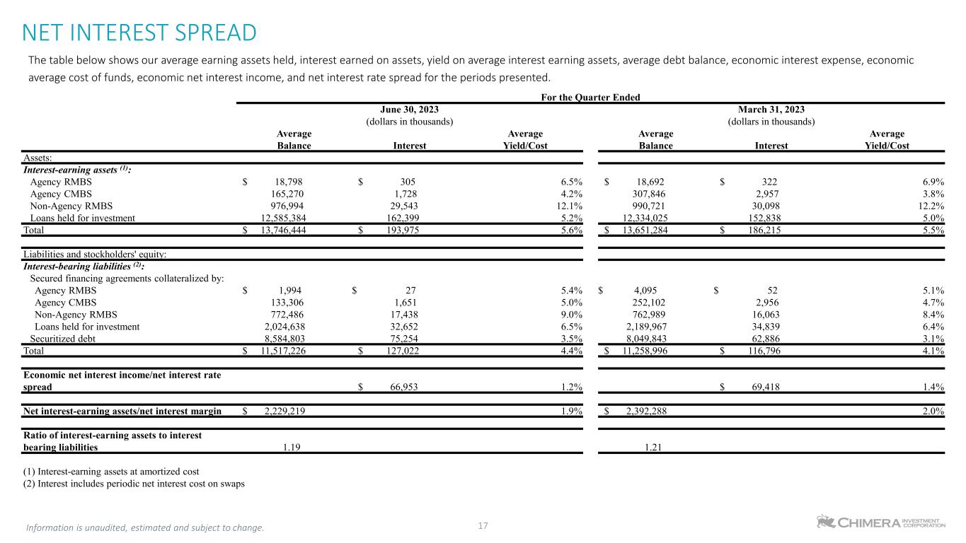 NET INTEREST SPREAD 17 The table below shows our average earning assets held, interest earned on assets, yield on average interest earning assets, average debt balance, economic interest expense, economic average cost of funds, economic net interest income, and net interest rate spread for the periods presented. Information is unaudited, estimated and subject to change. For the Quarter Ended June 30, 2023 March 31, 2023 (dollars in thousands) (dollars in thousands) Average Balance Interest Average Yield/Cost Average Balance Interest Average Yield/Cost Assets: Interest-earning assets (1): Agency RMBS $ 18,798 $ 305 6.5 % $ 18,692 $ 322 6.9 % Agency CMBS 165,270 1,728 4.2 % 307,846 2,957 3.8 % Non-Agency RMBS 976,994 29,543 12.1% 990,721 30,098 12.2% Loans held for investment 12,585,384 162,399 5.2 % 12,334,025 152,838 5.0 % Total $ 13,746,444 $ 193,975 5.6 % $ 13,651,284 $ 186,215 5.5 % Liabilities and stockholders' equity: Interest-bearing liabilities (2): Secured financing agreements collateralized by: Agency RMBS $ 1,994 $ 27 5.4 % $ 4,095 $ 52 5.1 % Agency CMBS 133,306 1,651 5.0 % 252,102 2,956 4.7 % Non-Agency RMBS 772,486 17,438 9.0 % 762,989 16,063 8.4 % Loans held for investment 2,024,638 32,652 6.5 % 2,189,967 34,839 6.4 % Securitized debt 8,584,803 75,254 3.5 % 8,049,843 62,886 3.1 % Total $ 11,517,226 $ 127,022 4.4 % $ 11,258,996 $ 116,796 4.1 % Economic net interest income/net interest rate spread $ 66,953 1.2 % $ 69,418 1.4 % Net interest-earning assets/net interest margin $ 2,229,219 1.9 % $ 2,392,288 2.0 % Ratio of interest-earning assets to interest bearing liabilities 1.19 1.21 (1) Interest-earning assets at amortized cost (2) Interest includes periodic net interest cost on swaps