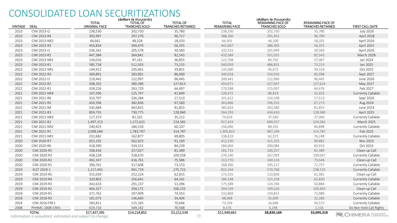 CONSOLIDATED LOAN SECURITIZATIONS 19 VINTAGE DEAL TOTAL ORIGINAL FACE TOTAL OF TRANCHES SOLD TOTAL OF TRANCHES RETAINED TOTAL REMAINING FACE REMAINING FACE OF TRANCHES SOLD REMAINING FACE OF TRANCHES RETAINED FIRST CALL DATE 2023 CIM 2023-I2 238,530 202,750 35,780 238,530 202,750 35,780 July 2026 2023 CIM 2023-R4 393,997 297,270 96,727 388,160 291,451 96,709 April 2028 2023 CIM 2023-NR2 66,661 48,328 18,333 64,301 46,100 18,201 April 2024 2023 CIM 2023-R3 450,834 394,479 56,355 442,667 386,305 56,355 April 2025 2023 CIM 2023-I1 236,161 205,578 30,583 232,533 201,949 30,583 April 2026 2023 CIM 2023-R2 447,384 364,841 82,543 433,584 351,031 82,543 March 2028 2023 CIM 2023-NR1 134,016 97,161 36,855 122,768 85,702 37,067 Jan 2024 2023 CIM 2023-R1 585,718 512,503 73,215 560,059 486,831 73,215 Jan 2025 2022 CIM 2022-NR1 144,912 105,061 39,851 135,000 95,671 39,329 Oct 2025 2022 CIM 2022-R3 369,891 283,891 86,000 340,018 254,016 85,998 Sept 2027 2022 CIM 2022-I1 219,442 122,997 96,445 209,441 112,996 96,445 June 2026 2022 CIM 2022-R2 508,202 380,389 127,813 454,671 327,047 127,624 May 2027 2022 CIM 2022-R1 328,226 263,729 64,497 279,588 215,097 64,476 Feb 2027 2021 CIM 2021-NR4 167,596 125,747 41,849 128,472 86,819 41,653 Currently Callable 2021 CIM 2021-R6 353,797 336,284 17,513 241,622 224,108 17,513 Sept 2026 2021 CIM 2021-R5 450,396 382,836 67,560 363,806 296,533 67,273 Aug 2024 2021 CIM 2021-R4 545,684 463,831 81,853 385,654 303,580 81,853 June 2024 2021 CIM 2021-R3 859,735 730,775 128,960 564,293 434,610 128,960 April 2025 2021 CIM 2021-NR3 117,373 82,161 35,212 74,629 37,560 37,069 Currently Callable 2021 CIM 2021-R2 1,497,213 1,272,631 224,582 917,424 690,557 224,582 March 2025 2021 CIM 2021-NR2 240,425 180,318 60,107 156,090 89,192 66,898 Currently Callable 2021 CIM 2021-R1 2,098,584 1,783,797 314,787 1,305,823 987,249 314,787 Feb 2025 2021 CIM 2021-NR1 232,682 162,877 69,805 138,619 62,371 76,248 Currently Callable 2020 CIM 2020-R7 653,192 562,023 91,169 412,230 321,315 90,881 Nov 2023 2020 CIM 2020-R6 418,390 334,151 84,239 284,004 200,084 83,919 Oct 2023 2020 CIM 2020-R5 338,416 257,027 81,389 181,715 100,257 81,389 Clean-up Call 2020 CIM 2020-R3 438,228 328,670 109,558 276,140 167,093 109,047 Currently Callable 2020 CIM 2020-R2 492,347 416,761 75,586 313,770 240,124 73,646 Clean-up Call 2020 CIM 2020-R1 390,761 317,608 73,153 268,366 195,217 72,757 Currently Callable 2019 SLST 2019-1 1,217,441 941,719 275,722 815,244 570,768 238,125 Currently Callable 2019 CIM 2019-R5 315,039 252,224 62,815 173,555 110,828 61,981 Clean-up Call 2019 CIM 2019-R4 320,802 256,641 64,161 184,148 121,318 62,830 Currently Callable 2019 CIM 2019-R3 342,633 291,237 51,396 175,589 124,704 50,884 Currently Callable 2019 CIM 2019-R2 464,327 358,172 106,155 304,539 199,526 104,693 Clean-up Call 2019 CIM 2019-R1 371,762 297,409 74,353 232,804 159,815 72,989 Currently Callable 2018 CIM 2018-R3 181,073 146,669 34,404 68,068 35,609 32,286 Currently Callable 2016 CIM 2016-FRE1 185,811 115,165 70,646 73,259 16,686 56,572 Currently Callable 2008 PHHMC 2008-CIM1 619,710 549,142 70,568 8,476 6,298 2,156 Do Not Hold Call Rights TOTAL $17,437,391 $14,224,852 $3,212,539 $11,949,661 $8,839,169 $3,095,318 Information is unaudited, estimated and subject to change. (dollars in thousands) (dollars in thousands)