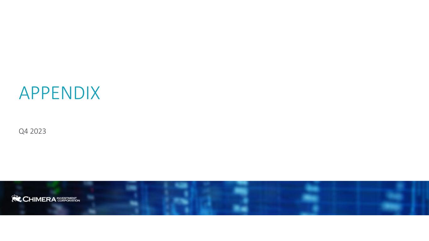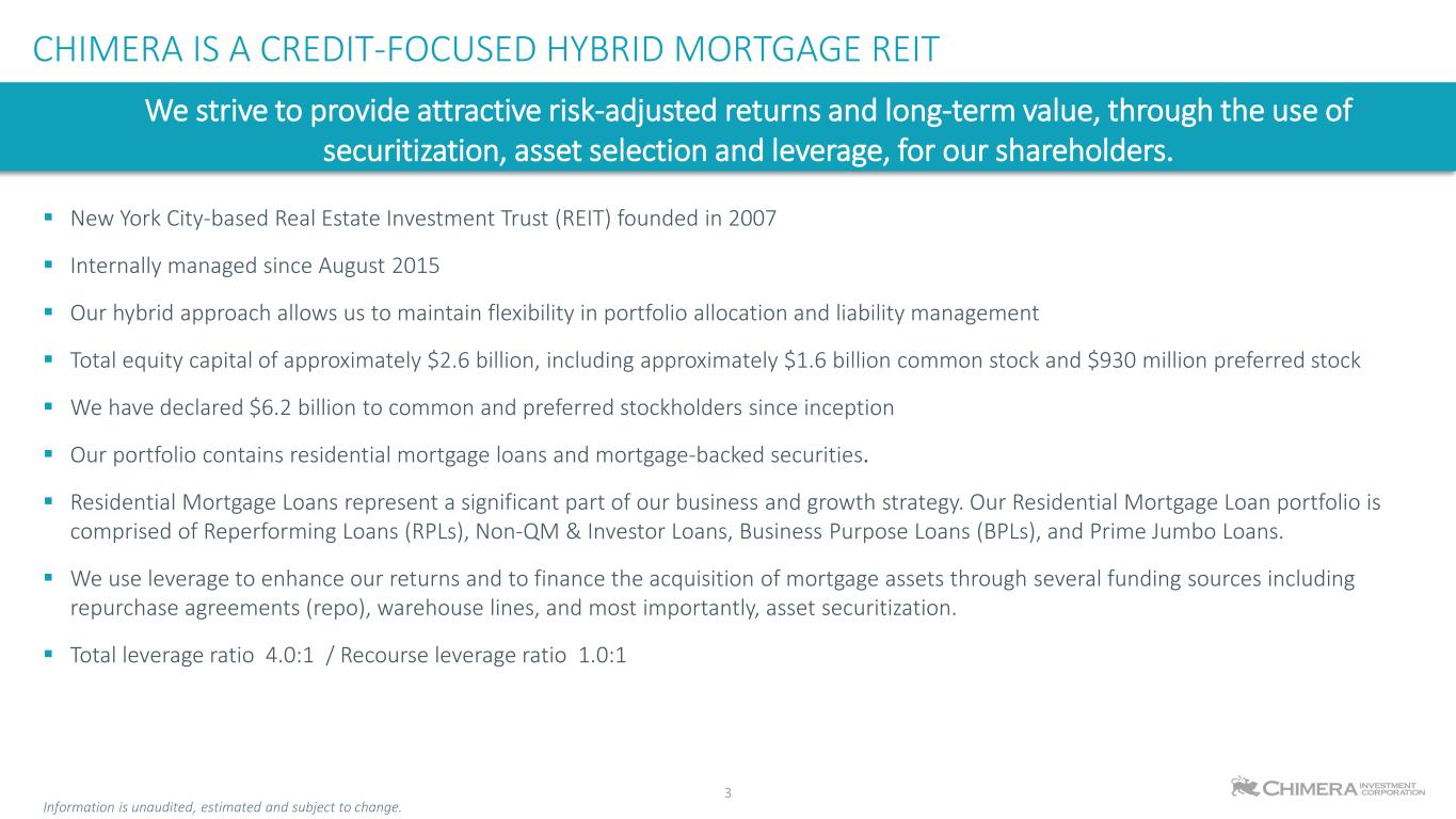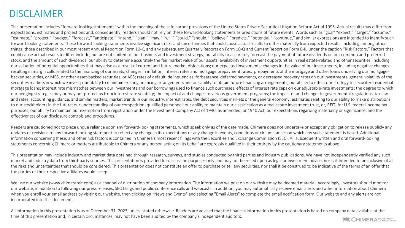 DISCLAIMER 2 This presentation includes “forward-looking statements” within the meaning of the safe harbor provisions of the United States Private Securities Litigation Reform Act of 1995. Actual results may differ from expectations, estimates and projections and, consequently, readers should not rely on these forward-looking statements as predictions of future events. Words such as “goal” “expect,” “target,” “assume,” “estimate,” “project,” “budget,” “forecast,” “anticipate,” “intend,” “plan,” “may,” “will,” “could,” “should,” “believe,” “predicts,” “potential,” “continue,” and similar expressions are intended to identify such forward-looking statements. These forward-looking statements involve significant risks and uncertainties that could cause actual results to differ materially from expected results, including, among other things, those described in our most recent Annual Report on Form 10-K, and any subsequent Quarterly Reports on Form 10-Q and Current Report on Form 8-K, under the caption “Risk Factors.” Factors that could cause actual results to differ include, but are not limited to: our business and investment strategy; our ability to accurately forecast the payment of future dividends on our common and preferred stock, and the amount of such dividends; our ability to determine accurately the fair market value of our assets; availability of investment opportunities in real estate-related and other securities, including our valuation of potential opportunities that may arise as a result of current and future market dislocations; our expected investments; changes in the value of our investments, including negative changes resulting in margin calls related to the financing of our assets; changes in inflation, interest rates and mortgage prepayment rates; prepayments of the mortgage and other loans underlying our mortgage- backed securities, or MBS, or other asset-backed securities, or ABS; rates of default, delinquencies, forbearance, deferred payments, or decreased recovery rates on our investments; general volatility of the securities markets in which we invest; our ability to maintain existing financing arrangements and our ability to obtain future financing arrangements; our ability to effect our strategy to securitize residential mortgage loans; interest rate mismatches between our investments and our borrowings used to finance such purchases; effects of interest rate caps on our adjustable-rate investments; the degree to which our hedging strategies may or may not protect us from interest rate volatility; the impact of and changes to various government programs; the impact of and changes in governmental regulations, tax law and rates, accounting guidance, and similar matters; market trends in our industry, interest rates, the debt securities markets or the general economy; estimates relating to our ability to make distributions to our stockholders in the future; our understanding of our competition; qualified personnel; our ability to maintain our classification as a real estate investment trust, or, REIT, for U.S. federal income tax purposes; our ability to maintain our exemption from registration under the Investment Company Act of 1940, as amended, or 1940 Act; our expectations regarding materiality or significance; and the effectiveness of our disclosure controls and procedures. Readers are cautioned not to place undue reliance upon any forward-looking statements, which speak only as of the date made. Chimera does not undertake or accept any obligation to release publicly any updates or revisions to any forward-looking statement to reflect any change in its expectations or any change in events, conditions or circumstances on which any such statement is based. Additional information concerning these, and other risk factors is contained in Chimera’s most recent filings with the Securities and Exchange Commission (SEC). All subsequent written and oral forward-looking statements concerning Chimera or matters attributable to Chimera or any person acting on its behalf are expressly qualified in their entirety by the cautionary statements above. This presentation may include industry and market data obtained through research, surveys, and studies conducted by third parties and industry publications. We have not independently verified any such market and industry data from third-party sources. This presentation is provided for discussion purposes only and may not be relied upon as legal or investment advice, nor is it intended to be inclusive of all the risks and uncertainties that should be considered. This presentation does not constitute an offer to purchase or sell any securities, nor shall it be construed to be indicative of the terms of an offer that the parties or their respective affiliates would accept. We use our website (www.chimerareit.com) as a channel of distribution of company information. The information we post on our website may be deemed material. Accordingly, investors should monitor our website, in addition to following our press releases, SEC filings and public conference calls and webcasts. In addition, you may automatically receive email alerts and other information about Chimera when you enroll your email address by visiting our website, then clicking on “News and Events" and selecting "Email Alerts" to complete the email notification form. Our website and any alerts are not incorporated into this document. All information in this presentation is as of December 31, 2023, unless stated otherwise. Readers are advised that the financial information in this presentation is based on company data available at the time of this presentation and, in certain circumstances, may not have been audited by the company’s independent auditors.