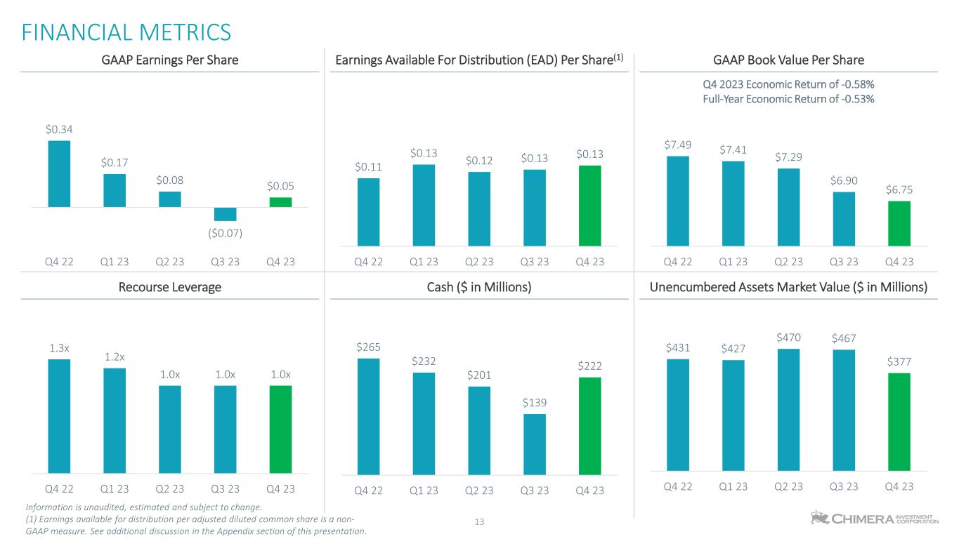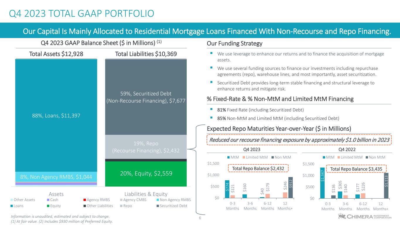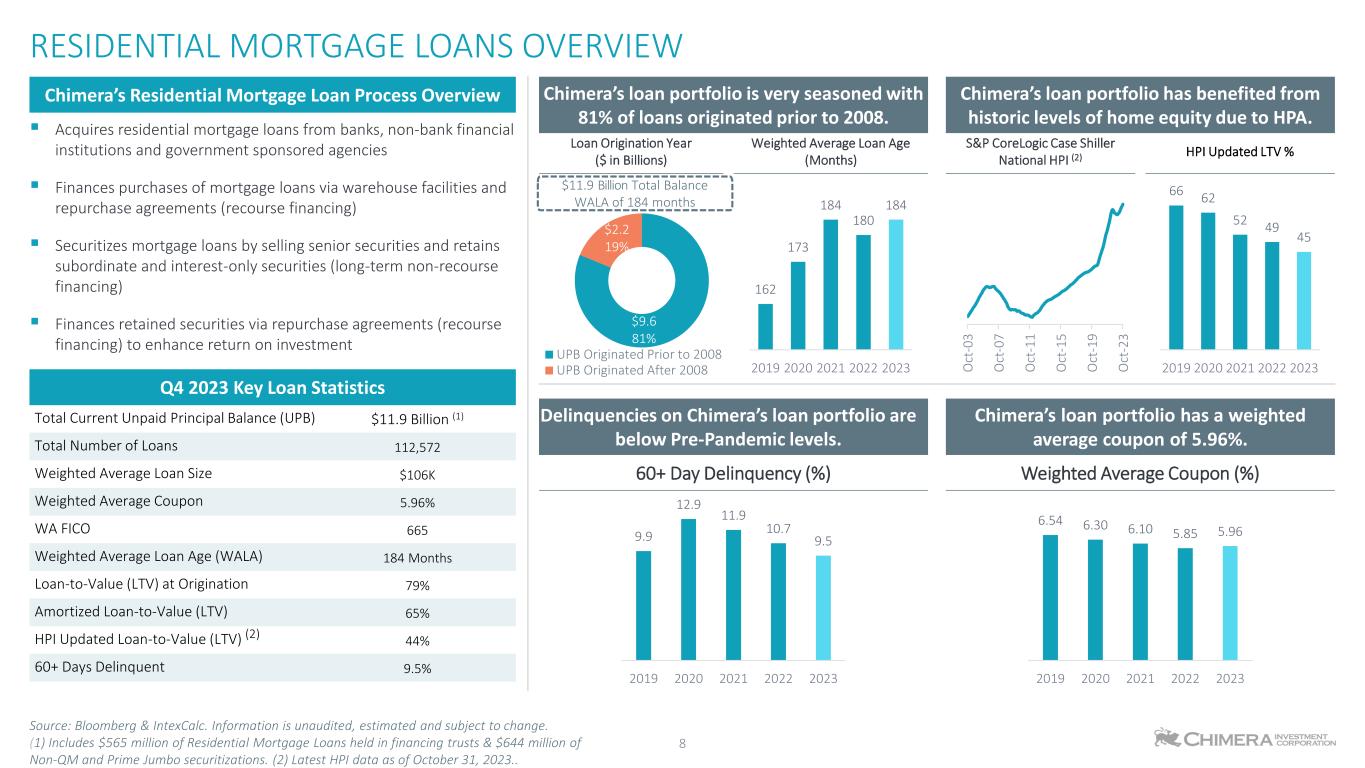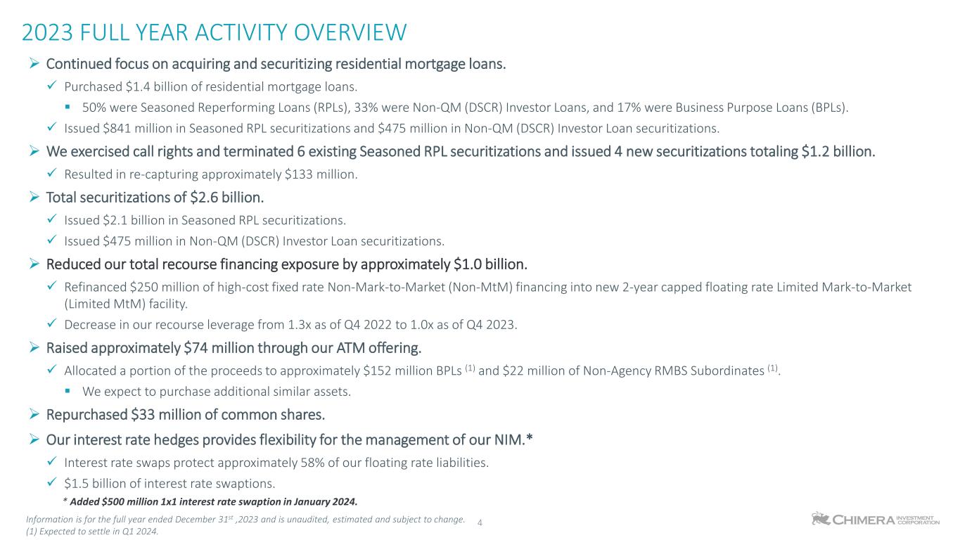DISCLAIMER 2 This presentation includes “forward-looking statements” within the meaning of the safe harbor provisions of the United States Private Securities Litigation Reform Act of 1995. Actual results may differ from expectations, estimates and projections and, consequently, readers should not rely on these forward-looking statements as predictions of future events. Words such as “goal” “expect,” “target,” “assume,” “estimate,” “project,” “budget,” “forecast,” “anticipate,” “intend,” “plan,” “may,” “will,” “could,” “should,” “believe,” “predicts,” “potential,” “continue,” and similar expressions are intended to identify such forward-looking statements. These forward-looking statements involve significant risks and uncertainties that could cause actual results to differ materially from expected results, including, among other things, those described in our most recent Annual Report on Form 10-K, and any subsequent Quarterly Reports on Form 10-Q and Current Report on Form 8-K, under the caption “Risk Factors.” Factors that could cause actual results to differ include, but are not limited to: our business and investment strategy; our ability to accurately forecast the payment of future dividends on our common and preferred stock, and the amount of such dividends; our ability to determine accurately the fair market value of our assets; availability of investment opportunities in real estate-related and other securities, including our valuation of potential opportunities that may arise as a result of current and future market dislocations; our expected investments; changes in the value of our investments, including negative changes resulting in margin calls related to the financing of our assets; changes in inflation, interest rates and mortgage prepayment rates; prepayments of the mortgage and other loans underlying our mortgage- backed securities, or MBS, or other asset-backed securities, or ABS; rates of default, delinquencies, forbearance, deferred payments, or decreased recovery rates on our investments; general volatility of the securities markets in which we invest; our ability to maintain existing financing arrangements and our ability to obtain future financing arrangements; our ability to effect our strategy to securitize residential mortgage loans; interest rate mismatches between our investments and our borrowings used to finance such purchases; effects of interest rate caps on our adjustable-rate investments; the degree to which our hedging strategies may or may not protect us from interest rate volatility; the impact of and changes to various government programs; the impact of and changes in governmental regulations, tax law and rates, accounting guidance, and similar matters; market trends in our industry, interest rates, the debt securities markets or the general economy; estimates relating to our ability to make distributions to our stockholders in the future; our understanding of our competition; qualified personnel; our ability to maintain our classification as a real estate investment trust, or, REIT, for U.S. federal income tax purposes; our ability to maintain our exemption from registration under the Investment Company Act of 1940, as amended, or 1940 Act; our expectations regarding materiality or significance; and the effectiveness of our disclosure controls and procedures. Readers are cautioned not to place undue reliance upon any forward-looking statements, which speak only as of the date made. Chimera does not undertake or accept any obligation to release publicly any updates or revisions to any forward-looking statement to reflect any change in its expectations or any change in events, conditions or circumstances on which any such statement is based. Additional information concerning these, and other risk factors is contained in Chimera’s most recent filings with the Securities and Exchange Commission (SEC). All subsequent written and oral forward-looking statements concerning Chimera or matters attributable to Chimera or any person acting on its behalf are expressly qualified in their entirety by the cautionary statements above. This presentation may include industry and market data obtained through research, surveys, and studies conducted by third parties and industry publications. We have not independently verified any such market and industry data from third-party sources. This presentation is provided for discussion purposes only and may not be relied upon as legal or investment advice, nor is it intended to be inclusive of all the risks and uncertainties that should be considered. This presentation does not constitute an offer to purchase or sell any securities, nor shall it be construed to be indicative of the terms of an offer that the parties or their respective affiliates would accept. We use our website (www.chimerareit.com) as a channel of distribution of company information. The information we post on our website may be deemed material. Accordingly, investors should monitor our website, in addition to following our press releases, SEC filings and public conference calls and webcasts. In addition, you may automatically receive email alerts and other information about Chimera when you enroll your email address by visiting our website, then clicking on “News and Events" and selecting "Email Alerts" to complete the email notification form. Our website and any alerts are not incorporated into this document. All information in this presentation is as of December 31, 2023, unless stated otherwise. Readers are advised that the financial information in this presentation is based on company data available at the time of this presentation and, in certain circumstances, may not have been audited by the company’s independent auditors.