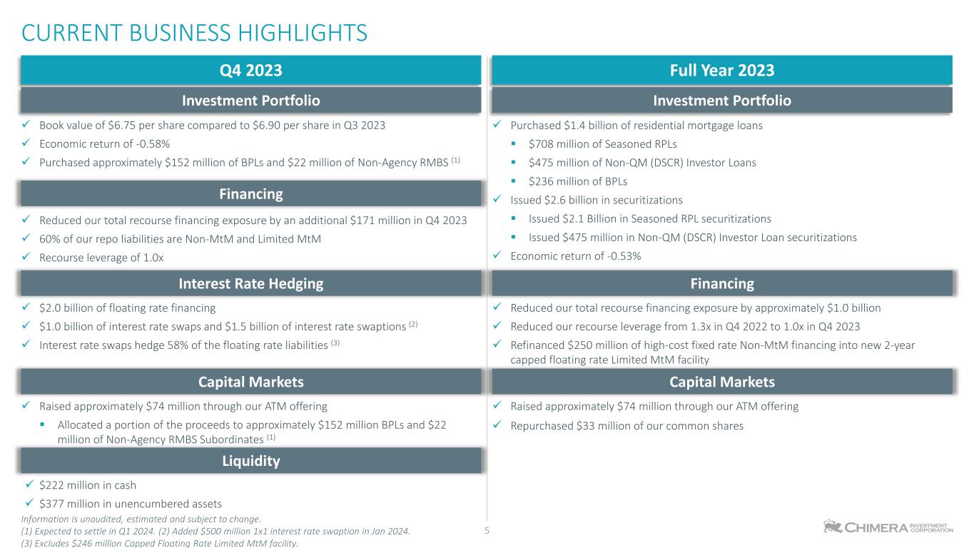 2023 FULL YEAR ACTIVITY OVERVIEW 4Information is for the full year ended December 31st ,2023 and is unaudited, estimated and subject to change. (1) Expected to settle in Q1 2024.  Continued focus on acquiring and securitizing residential mortgage loans.  Purchased $1.4 billion of residential mortgage loans.  50% were Seasoned Reperforming Loans (RPLs), 33% were Non-QM (DSCR) Investor Loans, and 17% were Business Purpose Loans (BPLs).  Issued $841 million in Seasoned RPL securitizations and $475 million in Non-QM (DSCR) Investor Loan securitizations.  We exercised call rights and terminated 6 existing Seasoned RPL securitizations and issued 4 new securitizations totaling $1.2 billion.  Resulted in re-capturing approximately $133 million.  Total securitizations of $2.6 billion.  Issued $2.1 billion in Seasoned RPL securitizations.  Issued $475 million in Non-QM (DSCR) Investor Loan securitizations.  Reduced our total recourse financing exposure by approximately $1.0 billion.  Refinanced $250 million of high-cost fixed rate Non-Mark-to-Market (Non-MtM) financing into new 2-year capped floating rate Limited Mark-to-Market (Limited MtM) facility.  Decrease in our recourse leverage from 1.3x as of Q4 2022 to 1.0x as of Q4 2023.  Raised approximately $74 million through our ATM offering.  Allocated a portion of the proceeds to approximately $152 million BPLs (1) and $22 million of Non-Agency RMBS Subordinates (1).  We expect to purchase additional similar assets.  Repurchased $33 million of common shares.  Our interest rate hedges provides flexibility for the management of our NIM.*  Interest rate swaps protect approximately 58% of our floating rate liabilities.  $1.5 billion of interest rate swaptions. * Added $500 million 1x1 interest rate swaption in January 2024.