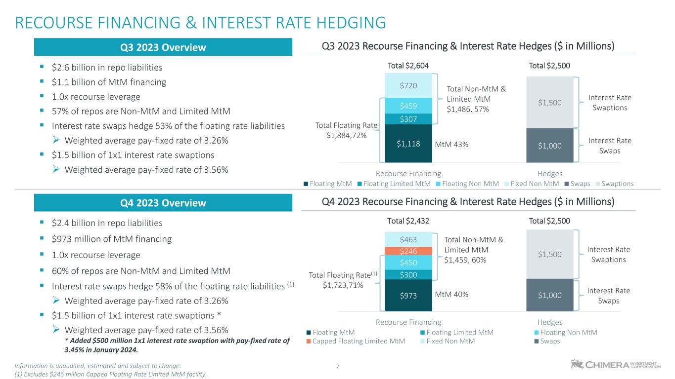 8%, Non Agency RMBS, $1,044 88%, Loans, $11,397 20%, Equity, $2,559 19%, Repo (Recourse Financing), $2,432 59%, Securitized Debt (Non-Recourse Financing), $7,677 Assets Liabilities & Equity Other Assets Cash Agency RMBS Agency CMBS Non Agency RMBS Loans Equity Other Liabilities Repo Securitized Debt Q4 2023 TOTAL GAAP PORTFOLIO 6  Our Capital Is Mainly Allocated to Residential Mortgage Loans Financed With Non-Recourse and Repo Financing. Information is unaudited, estimated and subject to change. (1) At fair value. (2) Includes $930 million of Preferred Equity. % Fixed-Rate & % Non-MtM and Limited MtM Financing Expected Repo Maturities Year-over-Year ($ in Millions) Total Assets $12,928 Q4 2023 GAAP Balance Sheet ($ in Millions) (1) Total Liabilities $10,369 Reduced our recourse financing exposure by approximately $1.0 billion in 2023  We use leverage to enhance our returns and to finance the acquisition of mortgage assets.  We use several funding sources to finance our investments including repurchase agreements (repo), warehouse lines, and most importantly, asset securitization.  Securitized Debt provides long-term stable financing and structural leverage to enhance returns and mitigate risk.  81% Fixed Rate (including Securitized Debt)  85% Non-MtM and Limited MtM (including Securitized Debt) Our Funding Strategy Q4 2023 $7 74 $1 60 $4 0 $1 21 $1 79 $2 46 $9 12 $0 $500 $1,000 $1,500 0-3 Months 3-6 Months 6-12 Months 12 Months+ MtM Limited MtM Non MtM Total Repo Balance $2,432 $1 ,3 47 $3 05 $1 77 $1 40 $2 26 $1 36 $1 ,1 13 $0 $500 $1,000 $1,500 0-3 Months 3-6 Months 6-12 Months 12 Months+ MtM Limited MtM Non MtM Total Repo Balance $3,435 Q4 2022