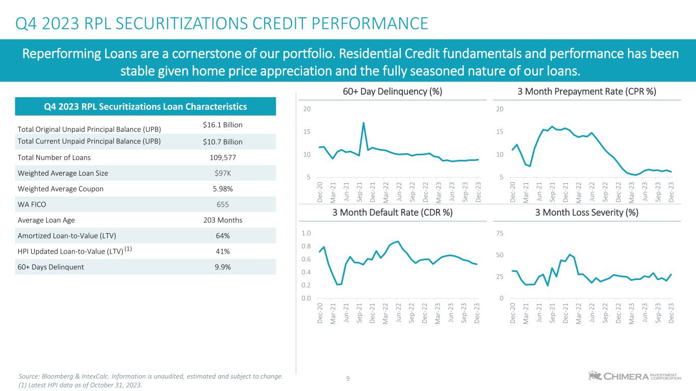 Chimera’s loan portfolio is very seasoned with 81% of loans originated prior to 2008. Acquires residential mortgage loans from banks, non-bank financial institutions and government sponsored agencies  Finances purchases of mortgage loans via warehouse facilities and repurchase agreements (recourse financing)  Securitizes mortgage loans by selling senior securities and retains subordinate and interest-only securities (long-term non-recourse financing)  Finances retained securities via repurchase agreements (recourse financing) to enhance return on investment Chimera’s Residential Mortgage Loan Process Overview Q4 2023 Key Loan Statistics Total Current Unpaid Principal Balance (UPB) $11.9 Billion (1) Total Number of Loans 112,572 Weighted Average Loan Size $106K Weighted Average Coupon 5.96% WA FICO 665 Weighted Average Loan Age (WALA) 184 Months Loan-to-Value (LTV) at Origination 79% Amortized Loan-to-Value (LTV) 65% HPI Updated Loan-to-Value (LTV) (2) 44% 60+ Days Delinquent 9.5% RESIDENTIAL MORTGAGE LOANS OVERVIEW Chimera’s loan portfolio has benefited from historic levels of home equity due to HPA. 8 Source: Bloomberg & IntexCalc. Information is unaudited, estimated and subject to change. (1) Includes $565 million of Residential Mortgage Loans held in financing trusts & $644 million of Non-QM and Prime Jumbo securitizations. (2) Latest HPI data as of October 31, 2023.. Chimera’s loan portfolio has a weighted average coupon of 5.96%. Delinquencies on Chimera’s loan portfolio are below Pre-Pandemic levels. 162 173 184 180 184 2019 2020 2021 2022 2023 66 62 52 49 45 2019 2020 2021 2022 2023O ct -0 3 O ct -0 7 O ct -1 1 O ct -1 5 O ct -1 9 O ct -2 3 9.9 12.9 11.9 10.7 9.5 2019 2020 2021 2022 2023 6.54 6.30 6.10 5.85 5.96 2019 2020 2021 2022 2023 60+ Day Delinquency (%) Weighted Average Coupon (%) Weighted Average Loan Age (Months) Loan Origination Year ($ in Billions) S&P CoreLogic Case Shiller National HPI (2) HPI Updated LTV % $9.6 81% $2.2 19% UPB Originated Prior to 2008 UPB Originated After 2008 $11.9 Billion Total Balance WALA of 184 months