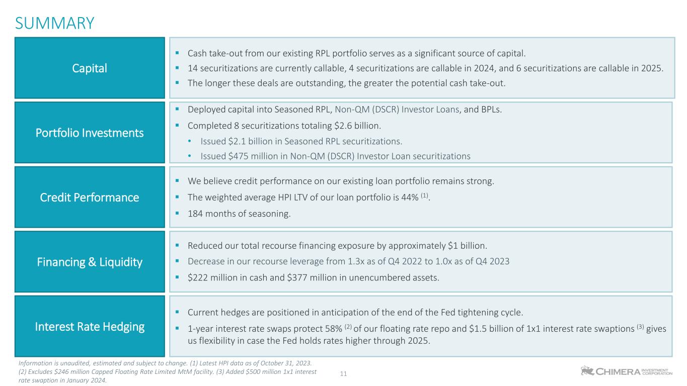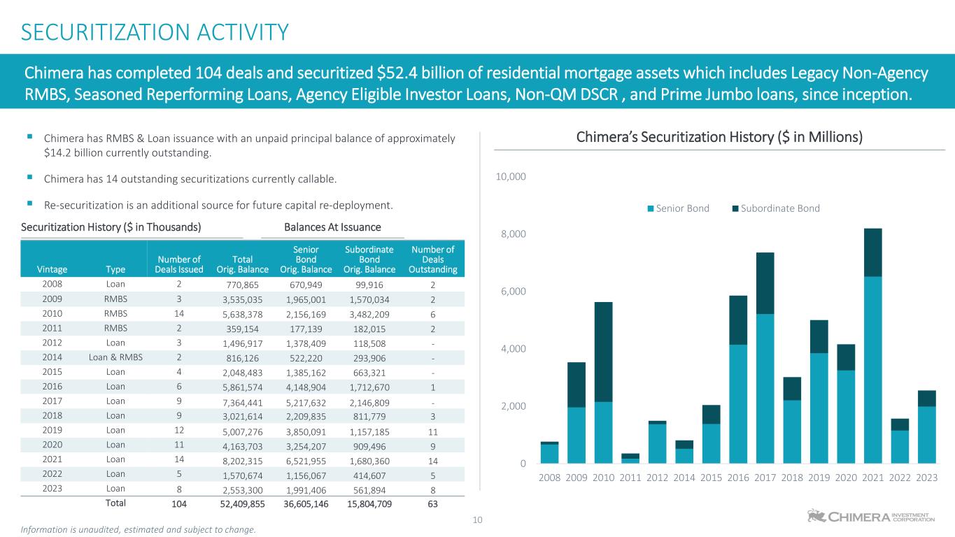  Chimera has RMBS & Loan issuance with an unpaid principal balance of approximately $14.2 billion currently outstanding.  Chimera has 14 outstanding securitizations currently callable.  Re-securitization is an additional source for future capital re-deployment. Type Vintage Type Number of Deals Issued Total Orig. Balance Senior Bond Orig. Balance Subordinate Bond Orig. Balance Number of Deals Outstanding 2008 Loan 2 770,865 670,949 99,916 2 2009 RMBS 3 3,535,035 1,965,001 1,570,034 2 2010 RMBS 14 5,638,378 2,156,169 3,482,209 6 2011 RMBS 2 359,154 177,139 182,015 2 2012 Loan 3 1,496,917 1,378,409 118,508 - 2014 Loan & RMBS 2 816,126 522,220 293,906 - 2015 Loan 4 2,048,483 1,385,162 663,321 - 2016 Loan 6 5,861,574 4,148,904 1,712,670 1 2017 Loan 9 7,364,441 5,217,632 2,146,809 - 2018 Loan 9 3,021,614 2,209,835 811,779 3 2019 Loan 12 5,007,276 3,850,091 1,157,185 11 2020 Loan 11 4,163,703 3,254,207 909,496 9 2021 Loan 14 8,202,315 6,521,955 1,680,360 14 2022 Loan 5 1,570,674 1,156,067 414,607 5 2023 Loan 8 2,553,300 1,991,406 561,894 8 Total 104 52,409,855 36,605,146 15,804,709 63 SECURITIZATION ACTIVITY 10 0 2,000 4,000 6,000 8,000 10,000 2008 2009 2010 2011 2012 2014 2015 2016 2017 2018 2019 2020 2021 2022 2023 Senior Bond Subordinate Bond Chimera’s Securitization History ($ in Millions)  Chimera has completed 104 deals and securitized $52.4 billion of residential mortgage assets which includes Legacy Non-Agency RMBS, Seasoned Reperforming Loans, Agency Eligible Investor Loans, Non-QM DSCR , and Prime Jumbo loans, since inception. Securitization History ($ in Thousands) Balances At Issuance Information is unaudited, estimated and subject to change.