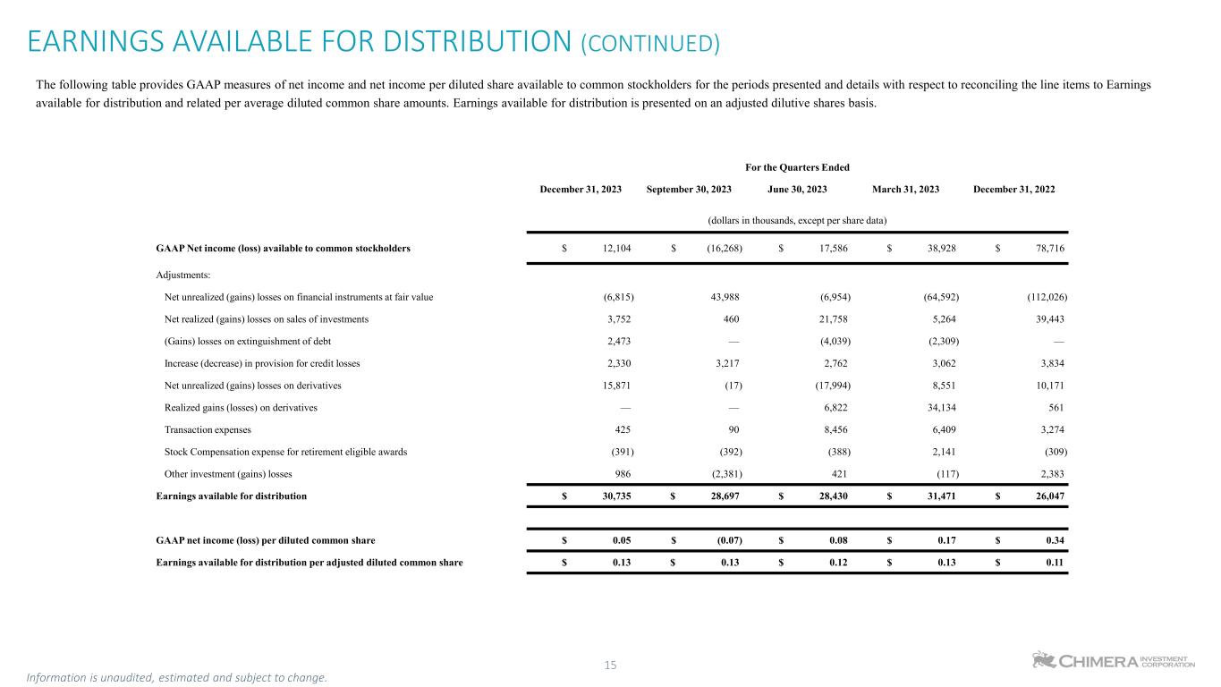EARNINGS AVAILABLE FOR DISTRIBUTION (CONTINUED) 15 The following table provides GAAP measures of net income and net income per diluted share available to common stockholders for the periods presented and details with respect to reconciling the line items to Earnings available for distribution and related per average diluted common share amounts. Earnings available for distribution is presented on an adjusted dilutive shares basis. For the Quarters Ended December 31, 2023 September 30, 2023 June 30, 2023 March 31, 2023 December 31, 2022 (dollars in thousands, except per share data) GAAP Net income (loss) available to common stockholders $ 12,104 $ (16,268) $ 17,586 $ 38,928 $ 78,716 Adjustments: Net unrealized (gains) losses on financial instruments at fair value (6,815) 43,988 (6,954) (64,592) (112,026) Net realized (gains) losses on sales of investments 3,752 460 21,758 5,264 39,443 (Gains) losses on extinguishment of debt 2,473 — (4,039) (2,309) — Increase (decrease) in provision for credit losses 2,330 3,217 2,762 3,062 3,834 Net unrealized (gains) losses on derivatives 15,871 (17) (17,994) 8,551 10,171 Realized gains (losses) on derivatives — — 6,822 34,134 561 Transaction expenses 425 90 8,456 6,409 3,274 Stock Compensation expense for retirement eligible awards (391) (392) (388) 2,141 (309) Other investment (gains) losses 986 (2,381) 421 (117) 2,383 Earnings available for distribution $ 30,735 $ 28,697 $ 28,430 $ 31,471 $ 26,047 GAAP net income (loss) per diluted common share $ 0.05 $ (0.07) $ 0.08 $ 0.17 $ 0.34 Earnings available for distribution per adjusted diluted common share $ 0.13 $ 0.13 $ 0.12 $ 0.13 $ 0.11 Information is unaudited, estimated and subject to change.