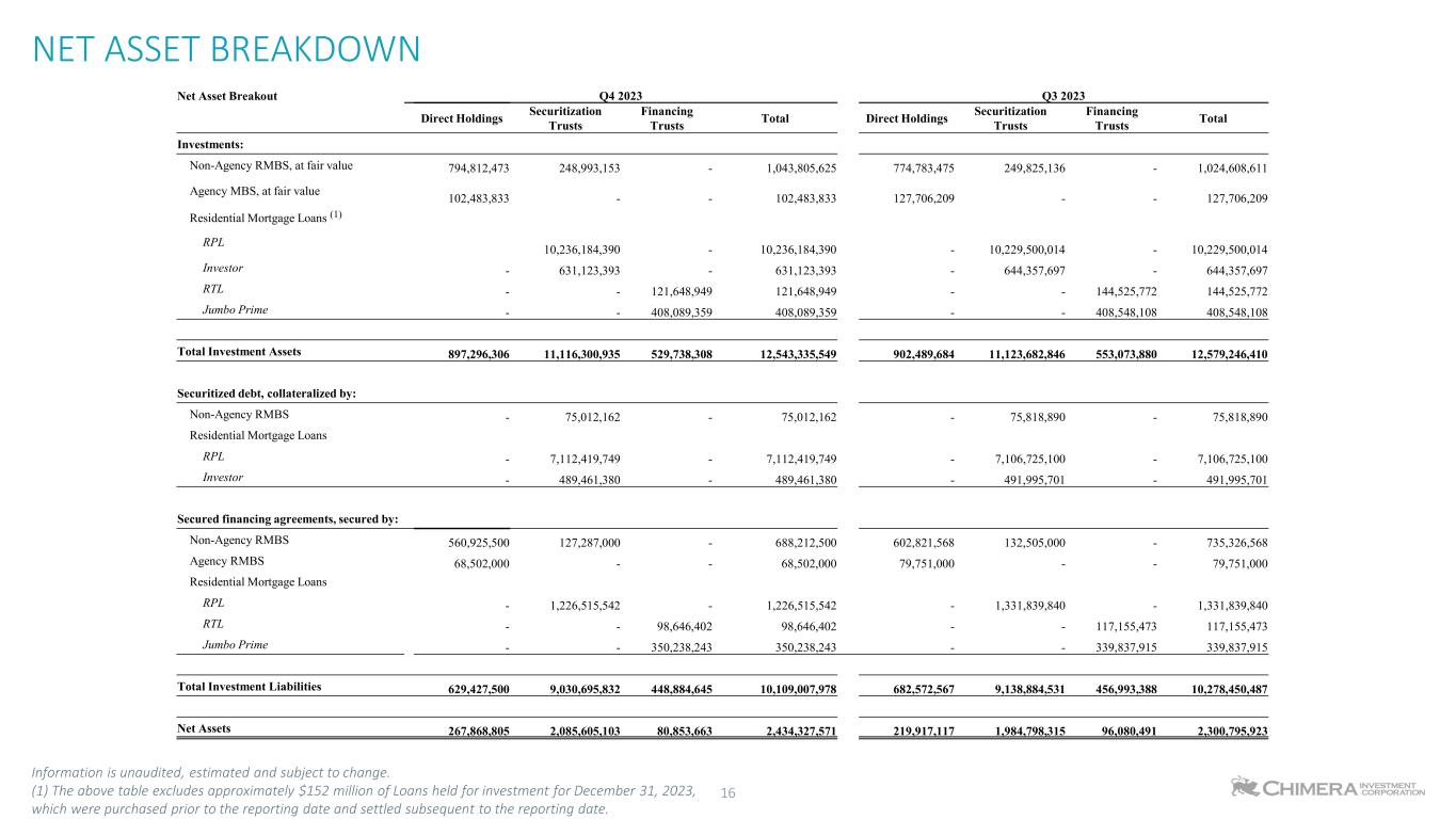 NET ASSET BREAKDOWN 16 Net Asset Breakout Q4 2023 Q3 2023 Direct Holdings Securitization Trusts Financing Trusts Total Direct Holdings Securitization Trusts Financing Trusts Total Investments: Non-Agency RMBS, at fair value 794,812,473 248,993,153 - 1,043,805,625 774,783,475 249,825,136 - 1,024,608,611 Agency MBS, at fair value 102,483,833 - - 102,483,833 127,706,209 - - 127,706,209 Residential Mortgage Loans (1) RPL 10,236,184,390 - 10,236,184,390 - 10,229,500,014 - 10,229,500,014 Investor - 631,123,393 - 631,123,393 - 644,357,697 - 644,357,697 RTL - - 121,648,949 121,648,949 - - 144,525,772 144,525,772 Jumbo Prime - - 408,089,359 408,089,359 - - 408,548,108 408,548,108 Total Investment Assets 897,296,306 11,116,300,935 529,738,308 12,543,335,549 902,489,684 11,123,682,846 553,073,880 12,579,246,410 Securitized debt, collateralized by: Non-Agency RMBS - 75,012,162 - 75,012,162 - 75,818,890 - 75,818,890 Residential Mortgage Loans RPL - 7,112,419,749 - 7,112,419,749 - 7,106,725,100 - 7,106,725,100 Investor - 489,461,380 - 489,461,380 - 491,995,701 - 491,995,701 Secured financing agreements, secured by: Non-Agency RMBS 560,925,500 127,287,000 - 688,212,500 602,821,568 132,505,000 - 735,326,568 Agency RMBS 68,502,000 - - 68,502,000 79,751,000 - - 79,751,000 Residential Mortgage Loans RPL - 1,226,515,542 - 1,226,515,542 - 1,331,839,840 - 1,331,839,840 RTL - - 98,646,402 98,646,402 - - 117,155,473 117,155,473 Jumbo Prime - - 350,238,243 350,238,243 - - 339,837,915 339,837,915 Total Investment Liabilities 629,427,500 9,030,695,832 448,884,645 10,109,007,978 682,572,567 9,138,884,531 456,993,388 10,278,450,487 Net Assets 267,868,805 2,085,605,103 80,853,663 2,434,327,571 219,917,117 1,984,798,315 96,080,491 2,300,795,923 Information is unaudited, estimated and subject to change. (1) The above table excludes approximately $152 million of Loans held for investment for December 31, 2023, which were purchased prior to the reporting date and settled subsequent to the reporting date.