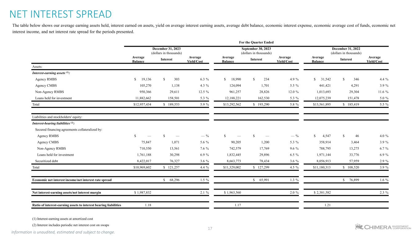 NET INTEREST SPREAD 17 The table below shows our average earning assets held, interest earned on assets, yield on average interest earning assets, average debt balance, economic interest expense, economic average cost of funds, economic net interest income, and net interest rate spread for the periods presented. Information is unaudited, estimated and subject to change. For the Quarter Ended December 31, 2023 September 30, 2023 December 31, 2022 (dollars in thousands) (dollars in thousands) (dollars in thousands) Average Balance Interest Average Yield/Cost Average Balance Interest Average Yield/Cost Average Balance Interest Average Yield/Cost Assets: Interest-earning assets (1): Agency RMBS $ 19,136 $ 303 6.3 % $ 18,990 $ 234 4.9 % $ 31,542 $ 346 4.4 % Agency CMBS 105,270 1,138 4.3 % 124,094 1,701 5.5 % 441,421 4,291 3.9 % Non-Agency RMBS 950,366 29,611 12.5 % 961,257 28,826 12.0 % 1,013,693 29,304 11.6 % Loans held for investment 11,882,662 158,501 5.3 % 12,188,221 162,530 5.3 % 12,075,239 151,478 5.0 % Total $12,957,434 $ 189,553 5.9 % $13,292,562 $ 193,290 5.8 % $13,561,895 $ 185,419 5.5 % Liabilities and stockholders' equity: Interest-bearing liabilities (2): Secured financing agreements collateralized by: Agency RMBS $ — $ — — % $ — $ — — % $ 4,547 $ 46 4.0 % Agency CMBS 75,847 1,071 5.6 % 90,205 1,200 5.3 % 358,914 3,464 3.9 % Non-Agency RMBS 710,550 13,561 7.6 % 742,579 17,769 9.6 % 788,795 13,275 6.7 % Loans held for investment 1,761,188 30,298 6.9 % 1,832,445 29,896 6.5 % 1,971,144 33,776 6.9 % Securitized debt 8,422,017 76,327 3.6 % 8,663,773 78,434 3.6 % 8,056,913 57,959 2.9 % Total $10,969,602 $ 121,257 4.4 % $11,329,002 $ 127,299 4.5 % $11,180,313 $ 108,520 3.9 % Economic net interest income/net interest rate spread $ 68,296 1.5 % $ 65,991 1.3 % $ 76,899 1.6 % Net interest-earning assets/net interest margin $ 1,987,832 2.1 % $ 1,963,560 2.0 % $ 2,381,582 2.3 % Ratio of interest-earning assets to interest bearing liabilities 1.18 1.17 1.21 (1) Interest-earning assets at amortized cost (2) Interest includes periodic net interest cost on swaps