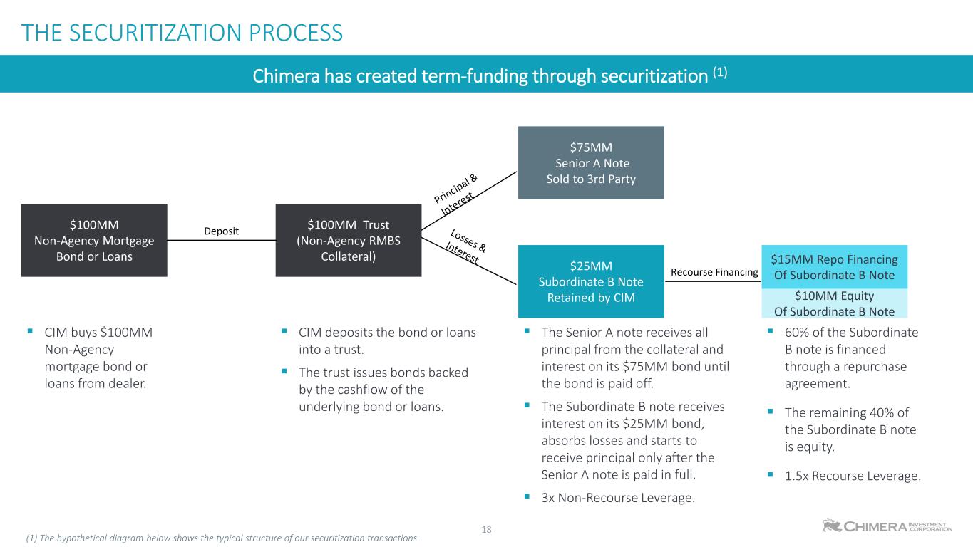 THE SECURITIZATION PROCESS  CIM buys $100MM Non-Agency mortgage bond or loans from dealer.  CIM deposits the bond or loans into a trust.  The trust issues bonds backed by the cashflow of the underlying bond or loans.  The Senior A note receives all principal from the collateral and interest on its $75MM bond until the bond is paid off.  The Subordinate B note receives interest on its $25MM bond, absorbs losses and starts to receive principal only after the Senior A note is paid in full.  3x Non-Recourse Leverage. $100MM Non-Agency Mortgage Bond or Loans $100MM Trust (Non-Agency RMBS Collateral) $75MM Senior A Note Sold to 3rd Party $25MM Subordinate B Note Retained by CIM Deposit 18 Recourse Financing $15MM Repo Financing Of Subordinate B Note $10MM Equity Of Subordinate B Note  60% of the Subordinate B note is financed through a repurchase agreement.  The remaining 40% of the Subordinate B note is equity.  1.5x Recourse Leverage. (1) The hypothetical diagram below shows the typical structure of our securitization transactions. Chimera has created term-funding through securitization (1)