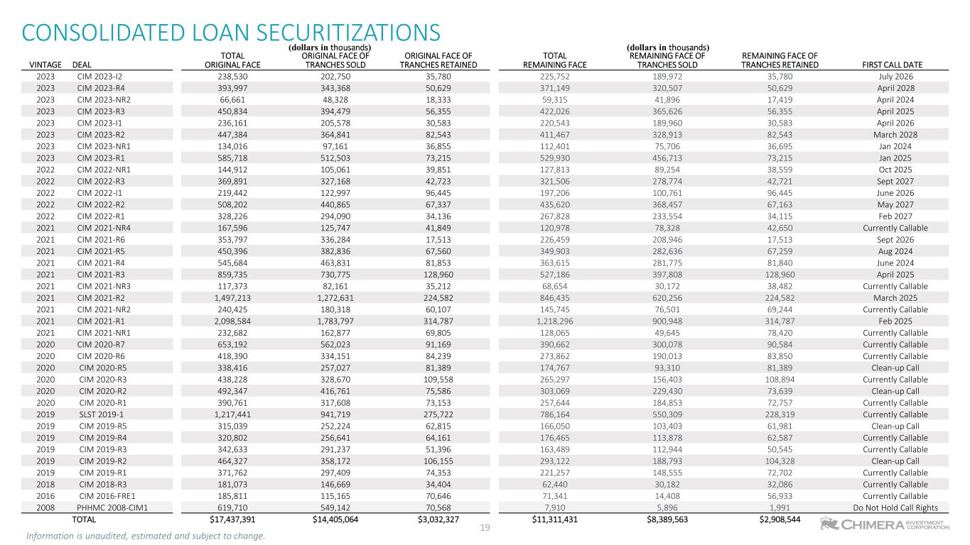 CONSOLIDATED LOAN SECURITIZATIONS 19 VINTAGE DEAL TOTAL ORIGINAL FACE ORIGINAL FACE OF TRANCHES SOLD ORIGINAL FACE OF TRANCHES RETAINED TOTAL REMAINING FACE REMAINING FACE OF TRANCHES SOLD REMAINING FACE OF TRANCHES RETAINED FIRST CALL DATE 2023 CIM 2023-I2 238,530 202,750 35,780 225,752 189,972 35,780 July 2026 2023 CIM 2023-R4 393,997 343,368 50,629 371,149 320,507 50,629 April 2028 2023 CIM 2023-NR2 66,661 48,328 18,333 59,315 41,896 17,419 April 2024 2023 CIM 2023-R3 450,834 394,479 56,355 422,026 365,626 56,355 April 2025 2023 CIM 2023-I1 236,161 205,578 30,583 220,543 189,960 30,583 April 2026 2023 CIM 2023-R2 447,384 364,841 82,543 411,467 328,913 82,543 March 2028 2023 CIM 2023-NR1 134,016 97,161 36,855 112,401 75,706 36,695 Jan 2024 2023 CIM 2023-R1 585,718 512,503 73,215 529,930 456,713 73,215 Jan 2025 2022 CIM 2022-NR1 144,912 105,061 39,851 127,813 89,254 38,559 Oct 2025 2022 CIM 2022-R3 369,891 327,168 42,723 321,506 278,774 42,721 Sept 2027 2022 CIM 2022-I1 219,442 122,997 96,445 197,206 100,761 96,445 June 2026 2022 CIM 2022-R2 508,202 440,865 67,337 435,620 368,457 67,163 May 2027 2022 CIM 2022-R1 328,226 294,090 34,136 267,828 233,554 34,115 Feb 2027 2021 CIM 2021-NR4 167,596 125,747 41,849 120,978 78,328 42,650 Currently Callable 2021 CIM 2021-R6 353,797 336,284 17,513 226,459 208,946 17,513 Sept 2026 2021 CIM 2021-R5 450,396 382,836 67,560 349,903 282,636 67,259 Aug 2024 2021 CIM 2021-R4 545,684 463,831 81,853 363,615 281,775 81,840 June 2024 2021 CIM 2021-R3 859,735 730,775 128,960 527,186 397,808 128,960 April 2025 2021 CIM 2021-NR3 117,373 82,161 35,212 68,654 30,172 38,482 Currently Callable 2021 CIM 2021-R2 1,497,213 1,272,631 224,582 846,435 620,256 224,582 March 2025 2021 CIM 2021-NR2 240,425 180,318 60,107 145,745 76,501 69,244 Currently Callable 2021 CIM 2021-R1 2,098,584 1,783,797 314,787 1,218,296 900,948 314,787 Feb 2025 2021 CIM 2021-NR1 232,682 162,877 69,805 128,065 49,645 78,420 Currently Callable 2020 CIM 2020-R7 653,192 562,023 91,169 390,662 300,078 90,584 Currently Callable 2020 CIM 2020-R6 418,390 334,151 84,239 273,862 190,013 83,850 Currently Callable 2020 CIM 2020-R5 338,416 257,027 81,389 174,767 93,310 81,389 Clean-up Call 2020 CIM 2020-R3 438,228 328,670 109,558 265,297 156,403 108,894 Currently Callable 2020 CIM 2020-R2 492,347 416,761 75,586 303,069 229,430 73,639 Clean-up Call 2020 CIM 2020-R1 390,761 317,608 73,153 257,644 184,853 72,757 Currently Callable 2019 SLST 2019-1 1,217,441 941,719 275,722 786,164 550,309 228,319 Currently Callable 2019 CIM 2019-R5 315,039 252,224 62,815 166,050 103,403 61,981 Clean-up Call 2019 CIM 2019-R4 320,802 256,641 64,161 176,465 113,878 62,587 Currently Callable 2019 CIM 2019-R3 342,633 291,237 51,396 163,489 112,944 50,545 Currently Callable 2019 CIM 2019-R2 464,327 358,172 106,155 293,122 188,793 104,328 Clean-up Call 2019 CIM 2019-R1 371,762 297,409 74,353 221,257 148,555 72,702 Currently Callable 2018 CIM 2018-R3 181,073 146,669 34,404 62,440 30,182 32,086 Currently Callable 2016 CIM 2016-FRE1 185,811 115,165 70,646 71,341 14,408 56,933 Currently Callable 2008 PHHMC 2008-CIM1 619,710 549,142 70,568 7,910 5,896 1,991 Do Not Hold Call Rights TOTAL $17,437,391 $14,405,064 $3,032,327 $11,311,431 $8,389,563 $2,908,544 Information is unaudited, estimated and subject to change. (dollars in thousands) (dollars in thousands)