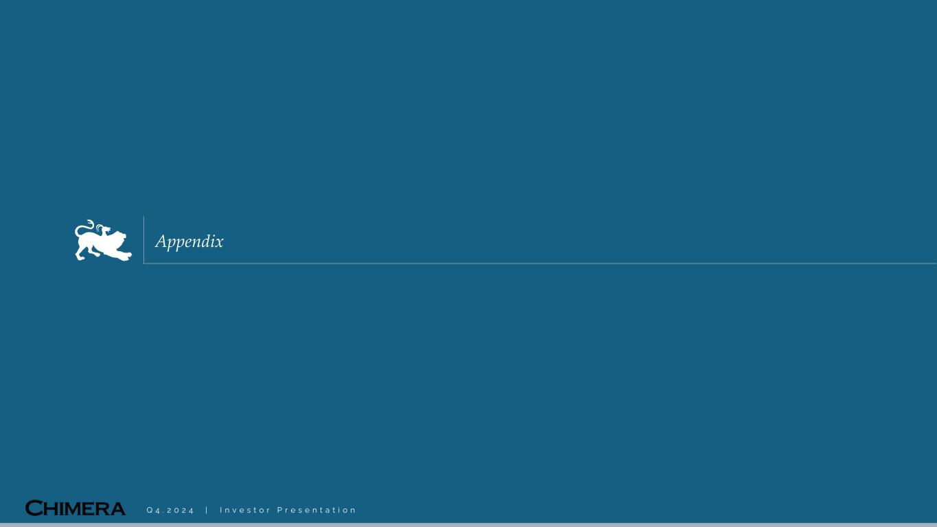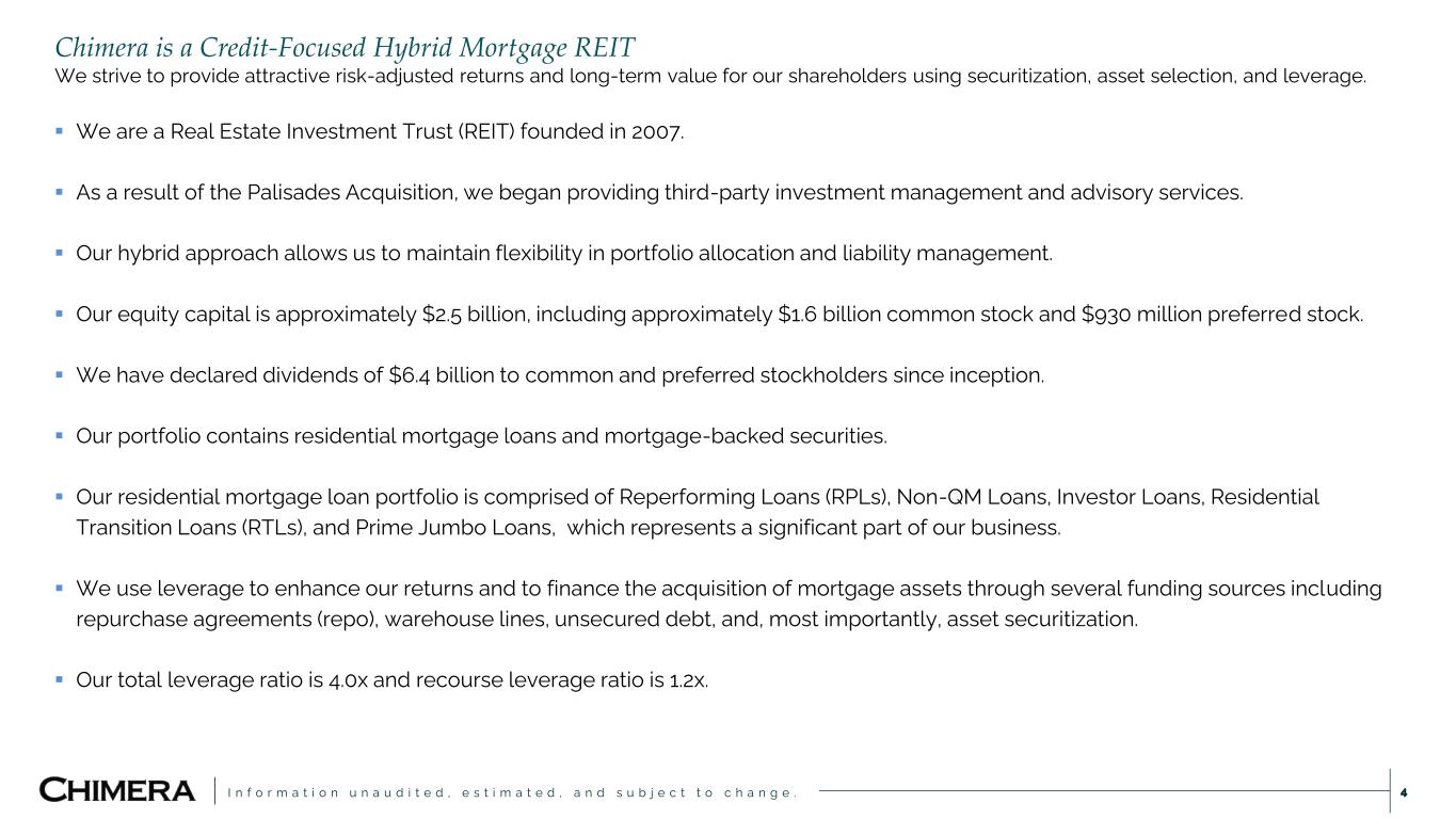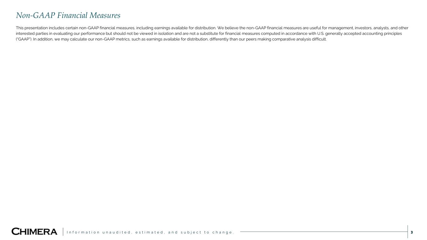 I n f o r m a t i o n u n a u d i t e d , e s t i m a t e d , a n d s u b j e c t t o c h a n g e . This presentation includes “forward-looking statements” within the meaning of the safe harbor provisions of the United States Private Securities Litigation Reform Act of 1995. Actual results may differ from expectations, estimates and projections and, consequently, readers should not rely on these forward-looking statements as predictions of future events. Words such as “goal” “expect,” “target,” “assume,” “estimate,” “project,” “budget,” “forecast,” “anticipate,” “intend,” “plan,” “may,” “would,” “could,” “should,” “believe,” “predict,” “potential,” “continue,” and similar expressions are intended to identify such forward-looking statements. These forward-looking statements involve significant risks and uncertainties that could cause actual results to differ materially from expected results, including, among other things, those described in our most recent Annual Report on Form 10-K, and any subsequent Quarterly Reports on Form 10-Q and Current Reports on Form 8-K, under the caption “Risk Factors.” Factors that could cause actual results to differ include, but are not limited to: our ability to obtain funding on favorable terms and access the capital markets; our ability to achieve optimal levels of leverage and effectively manage our liquidity; changes in inflation, the yield curve, interest rates and mortgage prepayment rates; our ability to manage credit risk related to our investments and comply with the Risk Retention Rules; rates of default, delinquencies, forbearance, deferred payments or decreased recovery rates on our investments; the concentration of properties securing our securities and residential loans in a small number of geographic areas; our ability to execute on our business and investment strategy; our ability to determine accurately the fair market value of our assets; changes in our industry, the general economy or geopolitical conditions; our ability to successfully integrate and realize the anticipated benefits of any acquisitions, including the Palisades Acquisition; our ability to operate our investment management and advisory services and manage any regulatory rules and conflicts of interest; the degree to which our hedging strategies may or may not be effective; our ability to effect our strategy to securitize residential mortgage loans; our ability to compete with competitors and source target assets at attractive prices; our ability to find and retain qualified executive officers and key personnel; the ability of servicers and other third parties to perform their services at a high level and comply with applicable law and expanding regulations; our dependence on information technology and its susceptibility to cyber-attacks; our ability to comply with extensive government regulation; the impact of and changes in governmental regulations, tax law and rates, accounting guidance, and similar matters; our ability to maintain our exemption from registration under the Investment Company Act of 1940, as amended; our ability to maintain our classification as a real estate investment trust for U.S. federal income tax purposes; the volatility of the market price and trading volume of our shares; and our ability to make distributions to our stockholders in the future.. Readers are cautioned not to place undue reliance upon any forward-looking statements, which speak only as of the date made. Chimera does not undertake or accept any obligation to release publicly any updates or revisions to any forward-looking statement to reflect any change in its expectations or any change in events, conditions or circumstances on which any such statement is based. Additional information concerning these, and other risk factors is contained in Chimera’s most recent filings with the Securities and Exchange Commission (SEC). All subsequent written and oral forward-looking statements concerning Chimera or matters attributable to Chimera or any person acting on its behalf are expressly qualified in their entirety by the cautionary statements above. This presentation may include industry and market data obtained through research, surveys, and studies conducted by third parties and industry publications. We have not independently verified any such market and industry data from third-party sources. This presentation is provided for discussion purposes only and may not be relied upon as legal or investment advice, nor is it intended to be inclusive of all the risks and uncertainties that should be considered. This presentation does not constitute an offer to purchase or sell any securities, nor shall it be construed to be indicative of the terms of an offer that the parties or their respective affiliates would accept. We use our website (www.chimerareit.com) as a channel of distribution of company information. The information we post on our website may be deemed material. Accordingly, investors should monitor our website, in addition to following our press releases, SEC filings and public conference calls and webcasts. In addition, you may automatically receive email alerts and other information about Chimera when you enroll your email address by visiting our website, then clicking on “News and Events" and selecting "Email Alerts" to complete the email notification form. Our website and any alerts are not incorporated into this document. All information in this presentation is as of December 31, 2024, unless stated otherwise. Readers are advised that the financial information in this presentation is based on company data available at the time of this presentation and, in certain circumstances, may not have been audited by the company’s independent auditors. Disclaimer 2