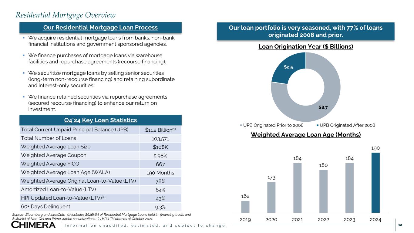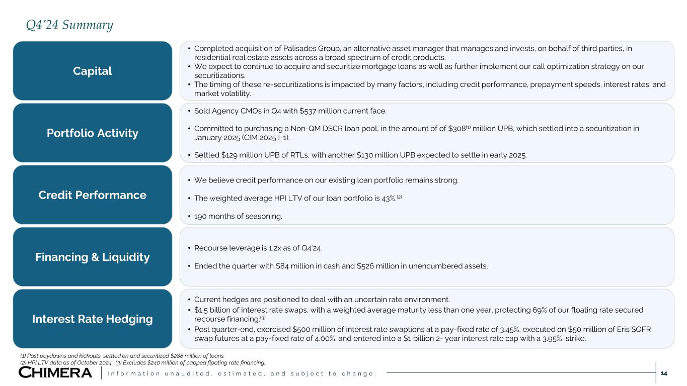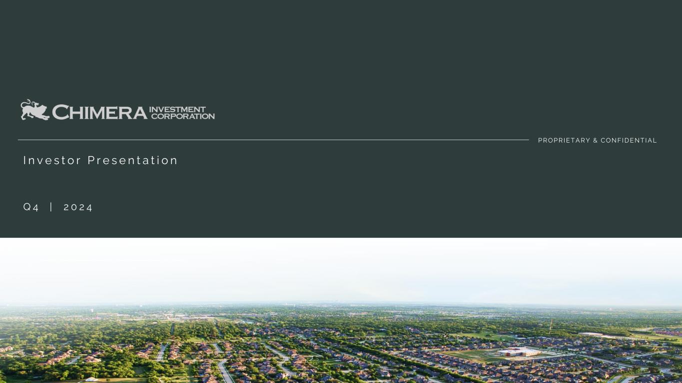 I n f o r m a t i o n u n a u d i t e d , e s t i m a t e d , a n d s u b j e c t t o c h a n g e . This presentation includes “forward-looking statements” within the meaning of the safe harbor provisions of the United States Private Securities Litigation Reform Act of 1995. Actual results may differ from expectations, estimates and projections and, consequently, readers should not rely on these forward-looking statements as predictions of future events. Words such as “goal” “expect,” “target,” “assume,” “estimate,” “project,” “budget,” “forecast,” “anticipate,” “intend,” “plan,” “may,” “would,” “could,” “should,” “believe,” “predict,” “potential,” “continue,” and similar expressions are intended to identify such forward-looking statements. These forward-looking statements involve significant risks and uncertainties that could cause actual results to differ materially from expected results, including, among other things, those described in our most recent Annual Report on Form 10-K, and any subsequent Quarterly Reports on Form 10-Q and Current Reports on Form 8-K, under the caption “Risk Factors.” Factors that could cause actual results to differ include, but are not limited to: our ability to obtain funding on favorable terms and access the capital markets; our ability to achieve optimal levels of leverage and effectively manage our liquidity; changes in inflation, the yield curve, interest rates and mortgage prepayment rates; our ability to manage credit risk related to our investments and comply with the Risk Retention Rules; rates of default, delinquencies, forbearance, deferred payments or decreased recovery rates on our investments; the concentration of properties securing our securities and residential loans in a small number of geographic areas; our ability to execute on our business and investment strategy; our ability to determine accurately the fair market value of our assets; changes in our industry, the general economy or geopolitical conditions; our ability to successfully integrate and realize the anticipated benefits of any acquisitions, including the Palisades Acquisition; our ability to operate our investment management and advisory services and manage any regulatory rules and conflicts of interest; the degree to which our hedging strategies may or may not be effective; our ability to effect our strategy to securitize residential mortgage loans; our ability to compete with competitors and source target assets at attractive prices; our ability to find and retain qualified executive officers and key personnel; the ability of servicers and other third parties to perform their services at a high level and comply with applicable law and expanding regulations; our dependence on information technology and its susceptibility to cyber-attacks; our ability to comply with extensive government regulation; the impact of and changes in governmental regulations, tax law and rates, accounting guidance, and similar matters; our ability to maintain our exemption from registration under the Investment Company Act of 1940, as amended; our ability to maintain our classification as a real estate investment trust for U.S. federal income tax purposes; the volatility of the market price and trading volume of our shares; and our ability to make distributions to our stockholders in the future.. Readers are cautioned not to place undue reliance upon any forward-looking statements, which speak only as of the date made. Chimera does not undertake or accept any obligation to release publicly any updates or revisions to any forward-looking statement to reflect any change in its expectations or any change in events, conditions or circumstances on which any such statement is based. Additional information concerning these, and other risk factors is contained in Chimera’s most recent filings with the Securities and Exchange Commission (SEC). All subsequent written and oral forward-looking statements concerning Chimera or matters attributable to Chimera or any person acting on its behalf are expressly qualified in their entirety by the cautionary statements above. This presentation may include industry and market data obtained through research, surveys, and studies conducted by third parties and industry publications. We have not independently verified any such market and industry data from third-party sources. This presentation is provided for discussion purposes only and may not be relied upon as legal or investment advice, nor is it intended to be inclusive of all the risks and uncertainties that should be considered. This presentation does not constitute an offer to purchase or sell any securities, nor shall it be construed to be indicative of the terms of an offer that the parties or their respective affiliates would accept. We use our website (www.chimerareit.com) as a channel of distribution of company information. The information we post on our website may be deemed material. Accordingly, investors should monitor our website, in addition to following our press releases, SEC filings and public conference calls and webcasts. In addition, you may automatically receive email alerts and other information about Chimera when you enroll your email address by visiting our website, then clicking on “News and Events" and selecting "Email Alerts" to complete the email notification form. Our website and any alerts are not incorporated into this document. All information in this presentation is as of December 31, 2024, unless stated otherwise. Readers are advised that the financial information in this presentation is based on company data available at the time of this presentation and, in certain circumstances, may not have been audited by the company’s independent auditors. Disclaimer 2