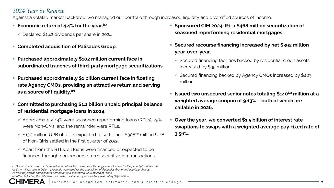 I n f o r m a t i o n u n a u d i t e d , e s t i m a t e d , a n d s u b j e c t t o c h a n g e . Q4’24 Overview ▪ Our book value per share for Q4’24 was $19.72, compared to $22.35 in Q3’24. ▪ Generated $0.37 per share of Earnings Available for Distribution (EAD).(1) ✓ Declared a dividend of $0.37 per common share in the fourth quarter of 2024. ▪ Completed acquisition of Palisades Group, an alternative asset manager that manages and invests, on behalf of third parties, in residential real estate assets across a broad spectrum of credit products. ▪ Remained very active with our portfolio during the quarter. ✓ Sold approximately $537 million current face of Agency CMOs during the quarter. o Proceeds were used to fund the acquisition of Palisades Group and for asset purchases. ✓ Settled $129 million unpaid principal balance (UPB) of RTLs, committed to purchasing $130 million UPB expected to settle in early 2025. ✓ Committed to the purchase of a Non-QM DSCR loan pool of $308(2) million unpaid principal balance, which settled into a securitization in January 2025 (CIM 2025-I1). ▪ Interest rate hedges provide flexibility for the management of our NIM. ✓ $1.5 billion of interest rate swaps, at a weighted average pay-fixed rate of 3.56%, protect approximately 69% of our floating rate liabilities. o The weighted average maturity on the Company’s interest rate swaps is less than one year. ✓ Executed on 2-year Treasury Note Futures to hedge execution risk of the CIM 2025-I1 securitization. ✓ Post quarter-end, exercised $500 million of interest rate swaptions at a pay-fixed rate of 3.45%, executed on $50 million of Eris SOFR swap futures at a pay-fixed rate of 4.00%, and entered into a $1 billion 2- year interest rate cap with a 3.95% strike. 5 (1) Earnings available for distribution per adjusted diluted common share is a non-GAAP measure. See additional discussion in the Appendix section of this presentation for GAAP to Non-GAAP reconciliations. (2) Post paydowns and kickouts, settled on and securitized $288 million of loans.
