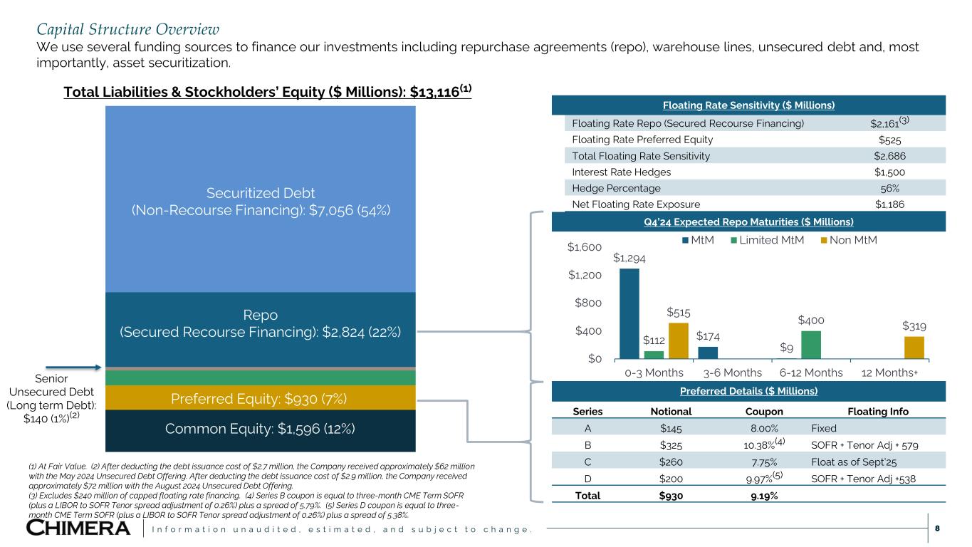 I n f o r m a t i o n u n a u d i t e d , e s t i m a t e d , a n d s u b j e c t t o c h a n g e . Assets Liabilities Other Assets Cash Agency RMBS Agency CMBS Non Agency RMBS Loans Equity Other Liabilities Unsecured Debt Repo Securitized Debt Residential Mortgage Loans: $11,197 (85%) Q4’24 GAAP Balance Sheet ($ Millions)(1) Non-Agency RMBS: $1,064 (8%) Repo (Secured Recourse Financing): $2,824 (22%) Equity(4): $2,526 (19%) Securitized Debt (Non-Recourse Financing): $7,056 (54%) Total Liabilities ($ Millions): $10,590(3)Total Assets ($ Millions): $13,116(2) 7 Total Portfolio | GAAP Balance Sheet Our capital is mainly allocated to residential mortgage loans, financed with securitized debt (non-recourse) and repo (secured recourse) financing. (1) At Fair Value. (2) Assets includes $84 million of Cash, $519 million of Agency MBS (RMBS and CMBS), and $252 million of Other Assets (3) Liabilities include $575 million of Other Liabilities and $135 million of Unsecured Debt. (4) Equity includes $930 million of Preferred Equity.