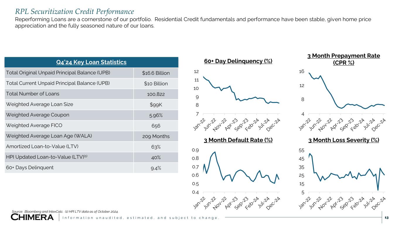 I n f o r m a t i o n u n a u d i t e d , e s t i m a t e d , a n d s u b j e c t t o c h a n g e . ▪ We currently have RMBS & Loan issuance with an unpaid principal balance of approximately $13 billion outstanding. ▪ Re-securitization is an additional source for future capital re-deployment. Securitization History ($ Millions) 0 2,000 4,000 6,000 8,000 10,000 2008 2011 2015 2018 2021 2024 Senior Subordinated Securitization Activity We have completed 105 deals and securitized $53 billion of residential mortgage assets, including Legacy Non-Agency RMBS, Seasoned Reperforming Loans, Agency Eligible Investor Loans, Non-QM DSCR loans, and Prime Jumbo loans, since inception. Vintage Type # of Deals Issued Total Orig. Balance Senior Bond Orig. Balance Subordinated Bond Orig. Balance # of Deals Outstanding 2008 Loan 2 771 671 100 2 2009 RMBS 3 3,535 1,965 1,570 2 2010 RMBS 14 5,638 2,156 3,482 6 2011 RMBS 2 359 177 182 2 2012 Loan 3 1,497 1,378 119 - 2014 Loan & RMBS 2 816 522 294 - 2015 Loan 4 2,048 1,385 663 - 2016 Loan 6 5,862 4,149 1,713 1 2017 Loan 9 7,364 5,218 2,147 - 2018 Loan 9 3,022 2,210 812 3 2019 Loan 12 5,007 3,850 1,157 11 2020 Loan 11 4,164 3,254 909 9 2021 Loan 14 8,202 6,522 1,680 14 2022 Loan 5 1,571 1,156 415 5 2023 Loan 8 2,553 1,991 562 8 2024 Loan 1 468 352 116 1 105 $52,878 $36,957 $15,921 64 12
