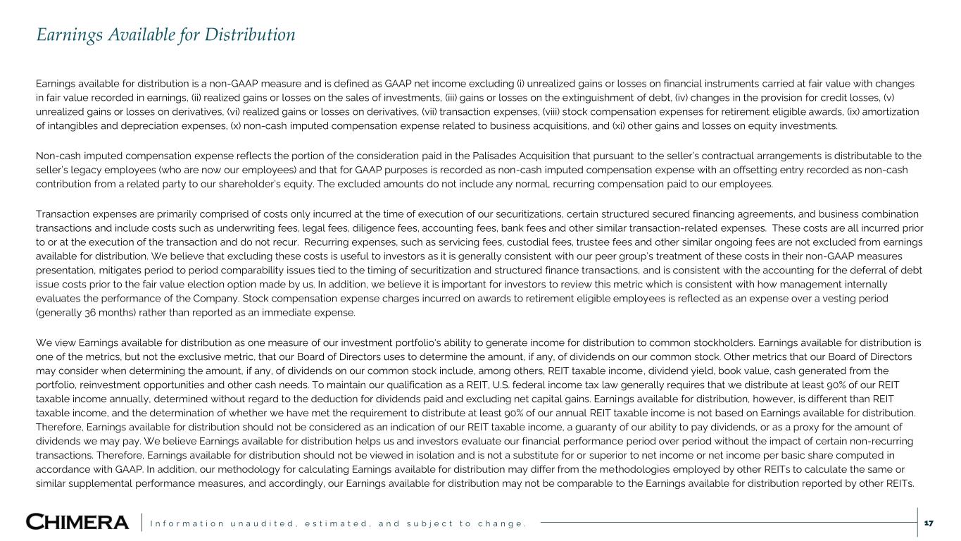 I n f o r m a t i o n u n a u d i t e d , e s t i m a t e d , a n d s u b j e c t t o c h a n g e . Earnings available for distribution is a non-GAAP measure and is defined as GAAP net income excluding (i) unrealized gains or losses on financial instruments carried at fair value with changes in fair value recorded in earnings, (ii) realized gains or losses on the sales of investments, (iii) gains or losses on the extinguishment of debt, (iv) changes in the provision for credit losses, (v) unrealized gains or losses on derivatives, (vi) realized gains or losses on derivatives, (vii) transaction expenses, (viii) stock compensation expenses for retirement eligible awards, (ix) amortization of intangibles and depreciation expenses, (x) non-cash imputed compensation expense related to business acquisitions, and (xi) other gains and losses on equity investments. Non-cash imputed compensation expense reflects the portion of the consideration paid in the Palisades Acquisition that pursuant to the seller’s contractual arrangements is distributable to the seller’s legacy employees (who are now our employees) and that for GAAP purposes is recorded as non-cash imputed compensation expense with an offsetting entry recorded as non-cash contribution from a related party to our shareholder’s equity. The excluded amounts do not include any normal, recurring compensation paid to our employees. Transaction expenses are primarily comprised of costs only incurred at the time of execution of our securitizations, certain structured secured financing agreements, and business combination transactions and include costs such as underwriting fees, legal fees, diligence fees, accounting fees, bank fees and other similar transaction-related expenses. These costs are all incurred prior to or at the execution of the transaction and do not recur. Recurring expenses, such as servicing fees, custodial fees, trustee fees and other similar ongoing fees are not excluded from earnings available for distribution. We believe that excluding these costs is useful to investors as it is generally consistent with our peer group’s treatment of these costs in their non-GAAP measures presentation, mitigates period to period comparability issues tied to the timing of securitization and structured finance transactions, and is consistent with the accounting for the deferral of debt issue costs prior to the fair value election option made by us. In addition, we believe it is important for investors to review this metric which is consistent with how management internally evaluates the performance of the Company. Stock compensation expense charges incurred on awards to retirement eligible employees is reflected as an expense over a vesting period (generally 36 months) rather than reported as an immediate expense. We view Earnings available for distribution as one measure of our investment portfolio's ability to generate income for distribution to common stockholders. Earnings available for distribution is one of the metrics, but not the exclusive metric, that our Board of Directors uses to determine the amount, if any, of dividends on our common stock. Other metrics that our Board of Directors may consider when determining the amount, if any, of dividends on our common stock include, among others, REIT taxable income, dividend yield, book value, cash generated from the portfolio, reinvestment opportunities and other cash needs. To maintain our qualification as a REIT, U.S. federal income tax law generally requires that we distribute at least 90% of our REIT taxable income annually, determined without regard to the deduction for dividends paid and excluding net capital gains. Earnings available for distribution, however, is different than REIT taxable income, and the determination of whether we have met the requirement to distribute at least 90% of our annual REIT taxable income is not based on Earnings available for distribution. Therefore, Earnings available for distribution should not be considered as an indication of our REIT taxable income, a guaranty of our ability to pay dividends, or as a proxy for the amount of dividends we may pay. We believe Earnings available for distribution helps us and investors evaluate our financial performance period over period without the impact of certain non-recurring transactions. Therefore, Earnings available for distribution should not be viewed in isolation and is not a substitute for or superior to net income or net income per basic share computed in accordance with GAAP. In addition, our methodology for calculating Earnings available for distribution may differ from the methodologies employed by other REITs to calculate the same or similar supplemental performance measures, and accordingly, our Earnings available for distribution may not be comparable to the Earnings available for distribution reported by other REITs. Earnings Available for Distribution 17