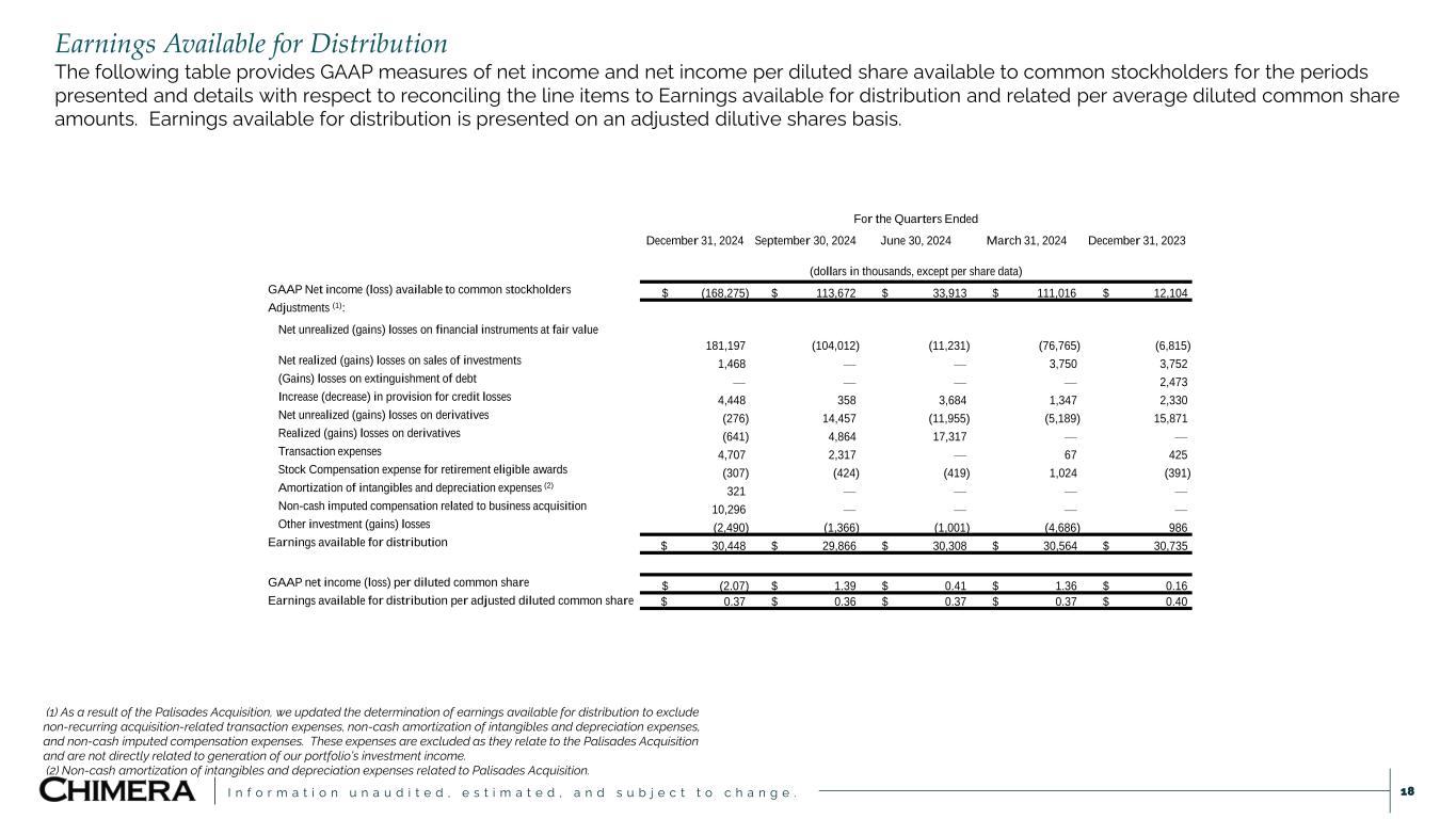 I n f o r m a t i o n u n a u d i t e d , e s t i m a t e d , a n d s u b j e c t t o c h a n g e . Earnings Available for Distribution The following table provides GAAP measures of net income and net income per diluted share available to common stockholders for the periods presented and details with respect to reconciling the line items to Earnings available for distribution and related per average diluted common share amounts. Earnings available for distribution is presented on an adjusted dilutive shares basis. 18 For the Quarters Ended December 31, 2024 September 30, 2024 June 30, 2024 March 31, 2024 December 31, 2023 (dollars in thousands, except per share data) GAAP Net income (loss) available to common stockholders $ (168,275) $ 113,672 $ 33,913 $ 111,016 $ 12,104 Adjustments (1): Net unrealized (gains) losses on financial instruments at fair value 181,197 (104,012) (11,231) (76,765) (6,815) Net realized (gains) losses on sales of investments 1,468 — — 3,750 3,752 (Gains) losses on extinguishment of debt — — — — 2,473 Increase (decrease) in provision for credit losses 4,448 358 3,684 1,347 2,330 Net unrealized (gains) losses on derivatives (276) 14,457 (11,955) (5,189) 15,871 Realized (gains) losses on derivatives (641) 4,864 17,317 — — Transaction expenses 4,707 2,317 — 67 425 Stock Compensation expense for retirement eligible awards (307) (424) (419) 1,024 (391) Amortization of intangibles and depreciation expenses (2) 321 — — — — Non-cash imputed compensation related to business acquisition 10,296 — — — — Other investment (gains) losses (2,490) (1,366) (1,001) (4,686) 986 Earnings available for distribution $ 30,448 $ 29,866 $ 30,308 $ 30,564 $ 30,735 GAAP net income (loss) per diluted common share $ (2.07) $ 1.39 $ 0.41 $ 1.36 $ 0.16 Earnings available for distribution per adjusted diluted common share $ 0.37 $ 0.36 $ 0.37 $ 0.37 $ 0.40 (1) As a result of the Palisades Acquisition, we updated the determination of earnings available for distribution to exclude non-recurring acquisition-related transaction expenses, non-cash amortization of intangibles and depreciation expenses, and non-cash imputed compensation expenses. These expenses are excluded as they relate to the Palisades Acquisition and are not directly related to generation of our portfolio’s investment income. (2) Non-cash amortization of intangibles and depreciation expenses related to Palisades Acquisition.