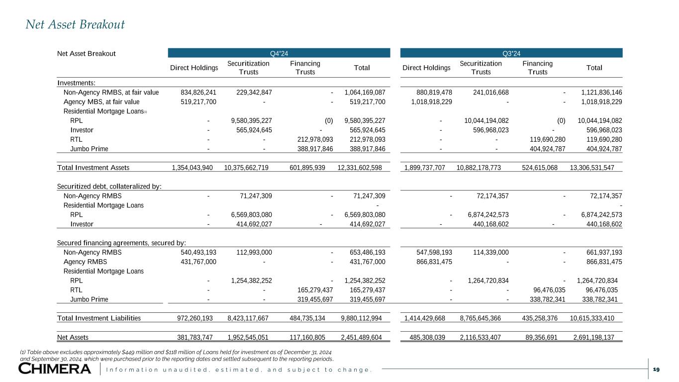 I n f o r m a t i o n u n a u d i t e d , e s t i m a t e d , a n d s u b j e c t t o c h a n g e . Net Asset Breakout 19 Net Asset Breakout Q4'24 Q3'24 Direct Holdings Securitization Trusts Financing Trusts Total Direct Holdings Securitization Trusts Financing Trusts Total Investments: Non-Agency RMBS, at fair value 834,826,241 229,342,847 - 1,064,169,087 880,819,478 241,016,668 - 1,121,836,146 Agency MBS, at fair value 519,217,700 - - 519,217,700 1,018,918,229 - - 1,018,918,229 Residential Mortgage Loans(1) RPL - 9,580,395,227 (0) 9,580,395,227 - 10,044,194,082 (0) 10,044,194,082 Investor - 565,924,645 - 565,924,645 - 596,968,023 - 596,968,023 RTL - - 212,978,093 212,978,093 - - 119,690,280 119,690,280 Jumbo Prime - - 388,917,846 388,917,846 - - 404,924,787 404,924,787 Total Investment Assets 1,354,043,940 10,375,662,719 601,895,939 12,331,602,598 1,899,737,707 10,882,178,773 524,615,068 13,306,531,547 Securitized debt, collateralized by: Non-Agency RMBS - 71,247,309 - 71,247,309 - 72,174,357 - 72,174,357 Residential Mortgage Loans - - RPL - 6,569,803,080 - 6,569,803,080 - 6,874,242,573 - 6,874,242,573 Investor - 414,692,027 - 414,692,027 - 440,168,602 - 440,168,602 Secured financing agreements, secured by: Non-Agency RMBS 540,493,193 112,993,000 - 653,486,193 547,598,193 114,339,000 - 661,937,193 Agency RMBS 431,767,000 - - 431,767,000 866,831,475 - - 866,831,475 Residential Mortgage Loans RPL - 1,254,382,252 - 1,254,382,252 - 1,264,720,834 - 1,264,720,834 RTL - - 165,279,437 165,279,437 - - 96,476,035 96,476,035 Jumbo Prime - - 319,455,697 319,455,697 - - 338,782,341 338,782,341 Total Investment Liabilities 972,260,193 8,423,117,667 484,735,134 9,880,112,994 1,414,429,668 8,765,645,366 435,258,376 10,615,333,410 Net Assets 381,783,747 1,952,545,051 117,160,805 2,451,489,604 485,308,039 2,116,533,407 89,356,691 2,691,198,137 (1) Table above excludes approximately $449 million and $118 million of Loans held for investment as of December 31, 2024 and September 30, 2024, which were purchased prior to the reporting dates and settled subsequent to the reporting periods..